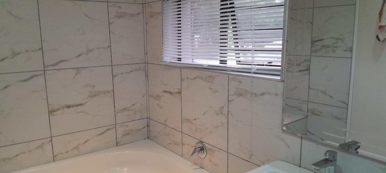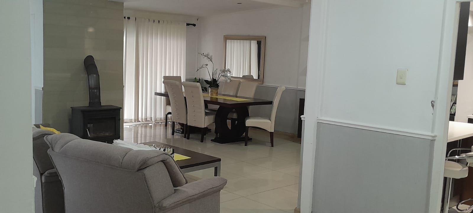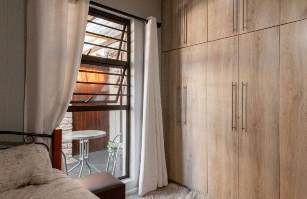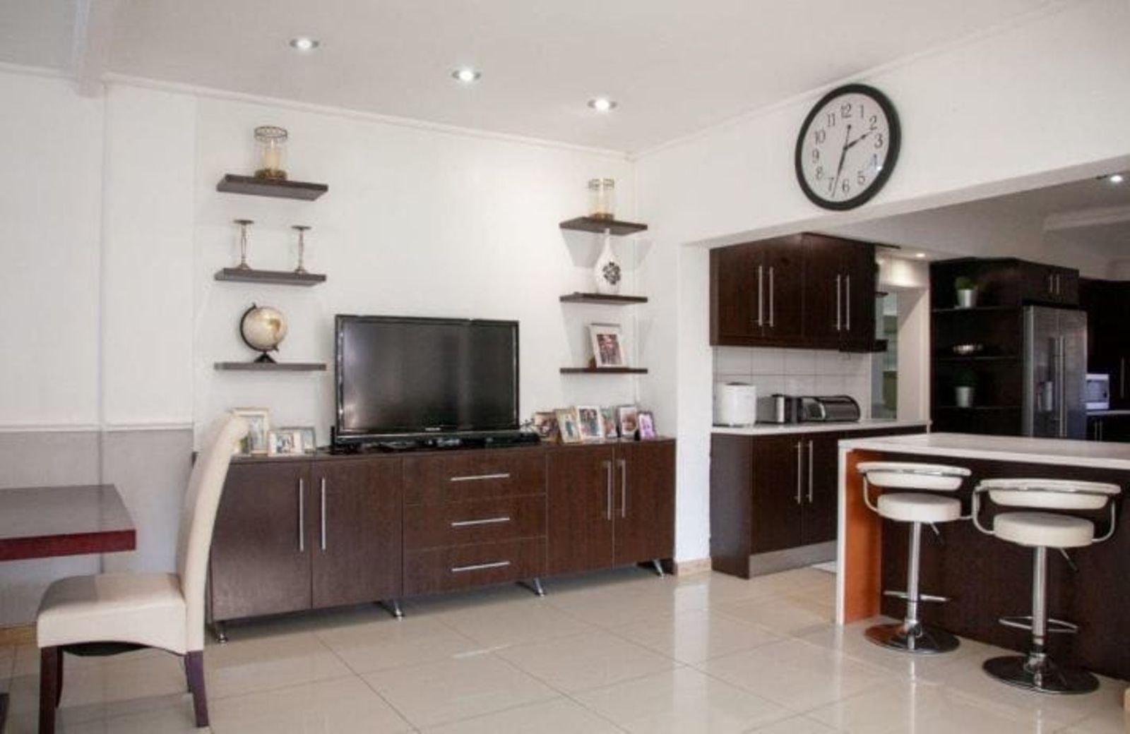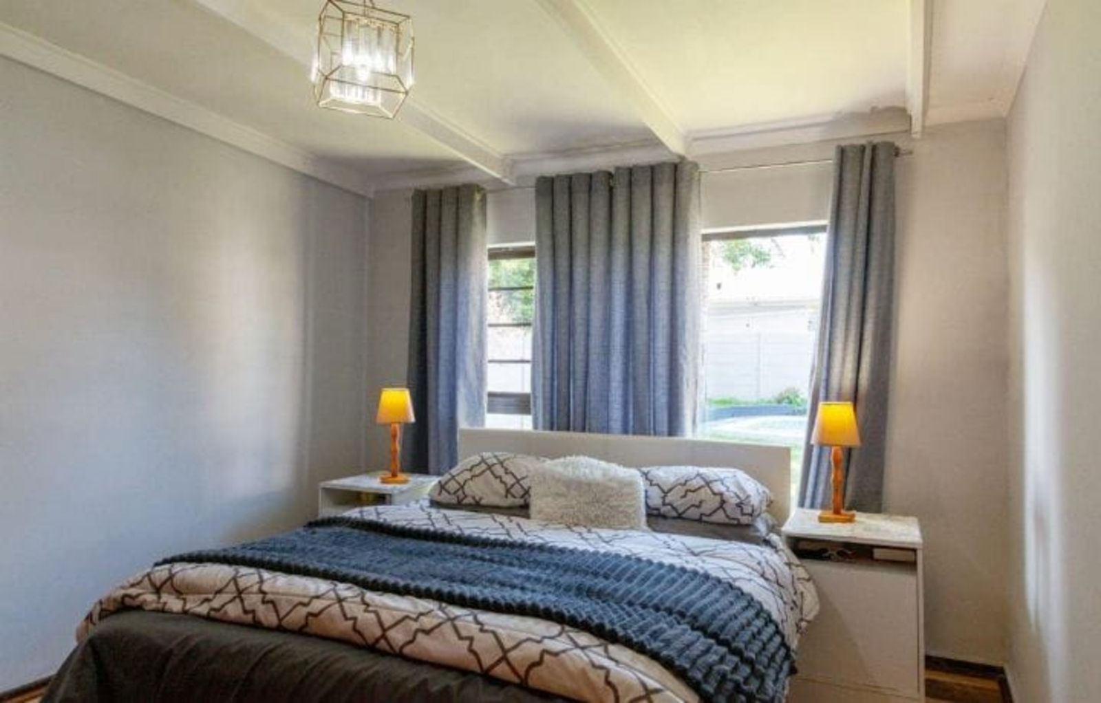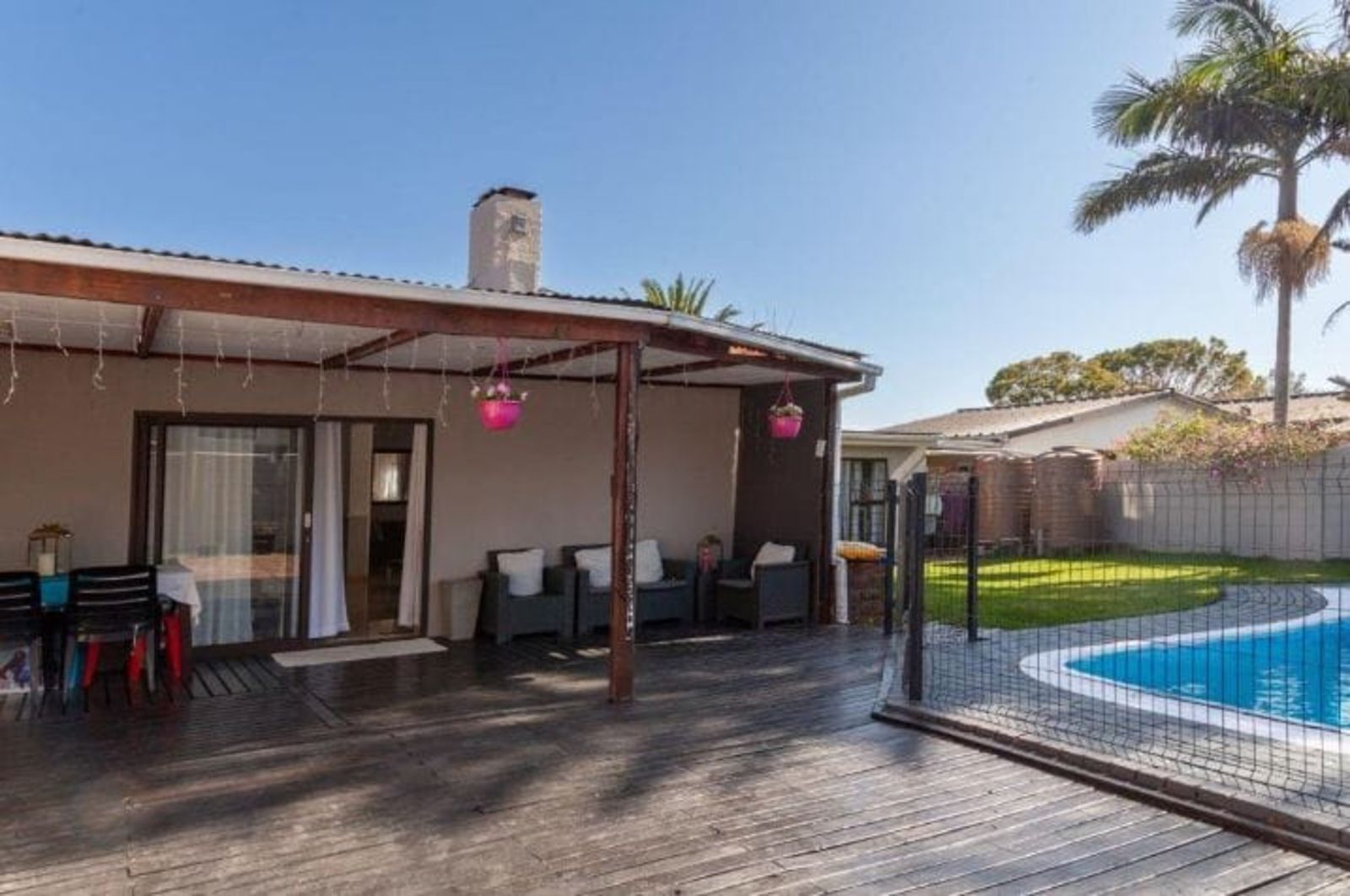 The living room boasts a cozy fireplace, perfect for those chilly winter nights. Sliding doors lead to an extended, covered deck with a built-in braai, offering stunning views of the pool and surrounding mountains.