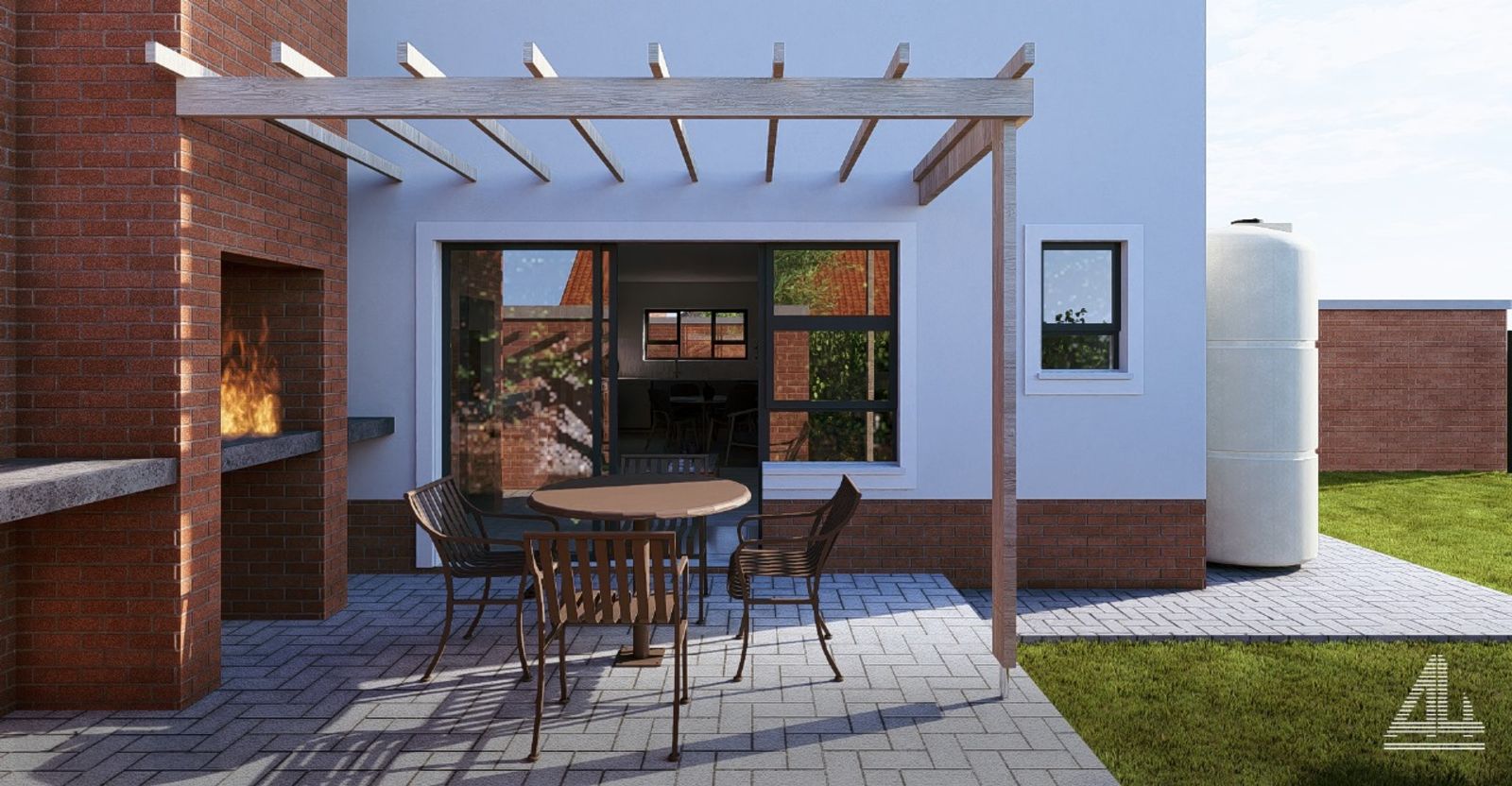 The kitchen is a modern masterpiece, equipped with a gas hob, granite countertops, ample built-in cupboards, and space for essential appliances. Ideal for hosting, the living area opens through sliding doors to a pergola-covered patio with a built-in braai and a low-maintenance garden.
