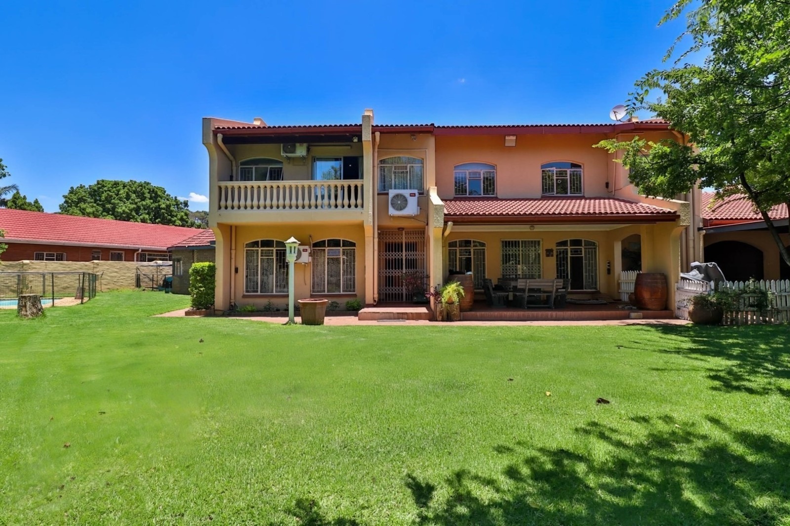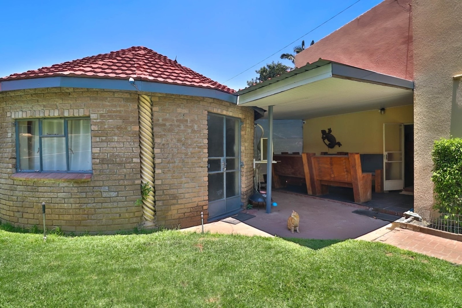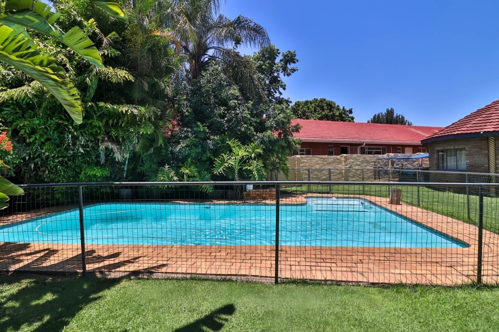 For the ultimate in relaxation and entertainment, discover a 6x6 precast building transformed into a trendy man cave. Adjacent to a patio and swimming pool is a rondavel with a built-in braai and air conditioning, creating the ideal spot for hosting gatherings.