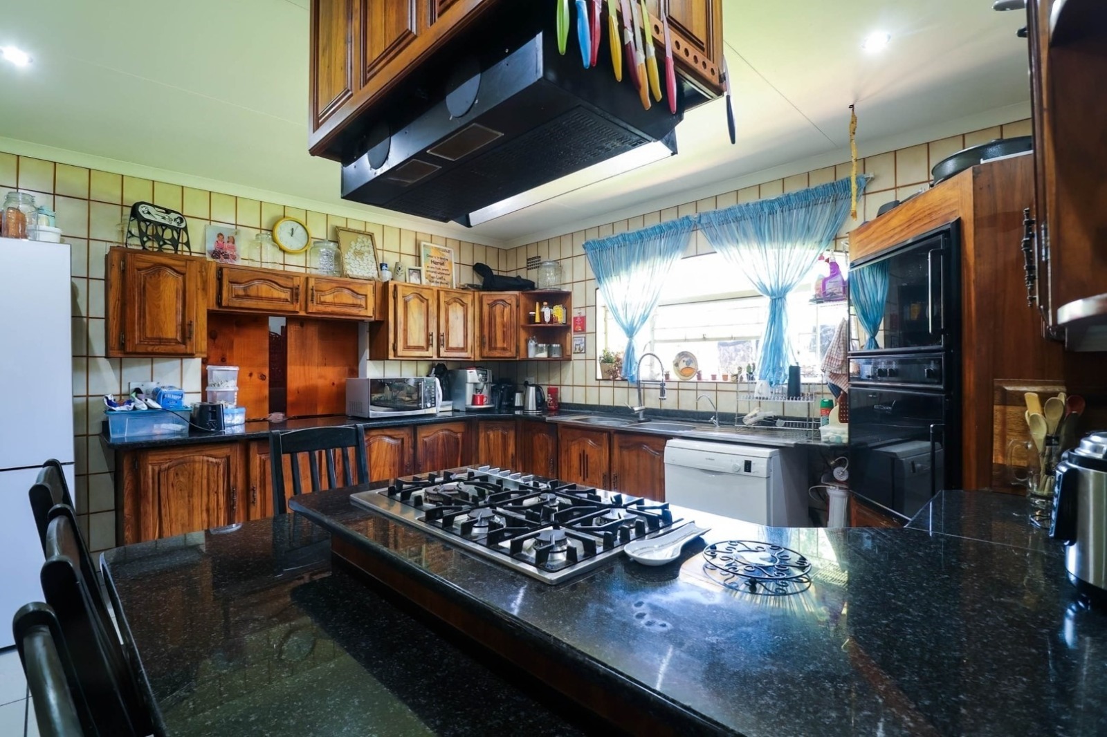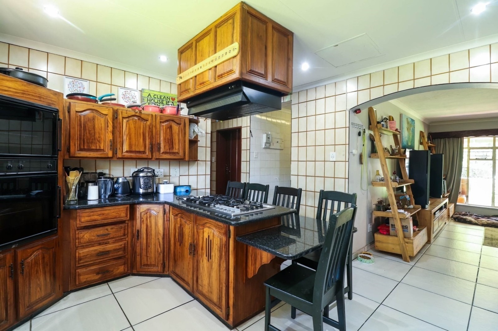 The kitchen is a chef's delight with a double oven, gas hob, scullery, and pantry, making meal preparation a breeze. The living room and dining room are perfect for entertaining, complete with a convenient server window.