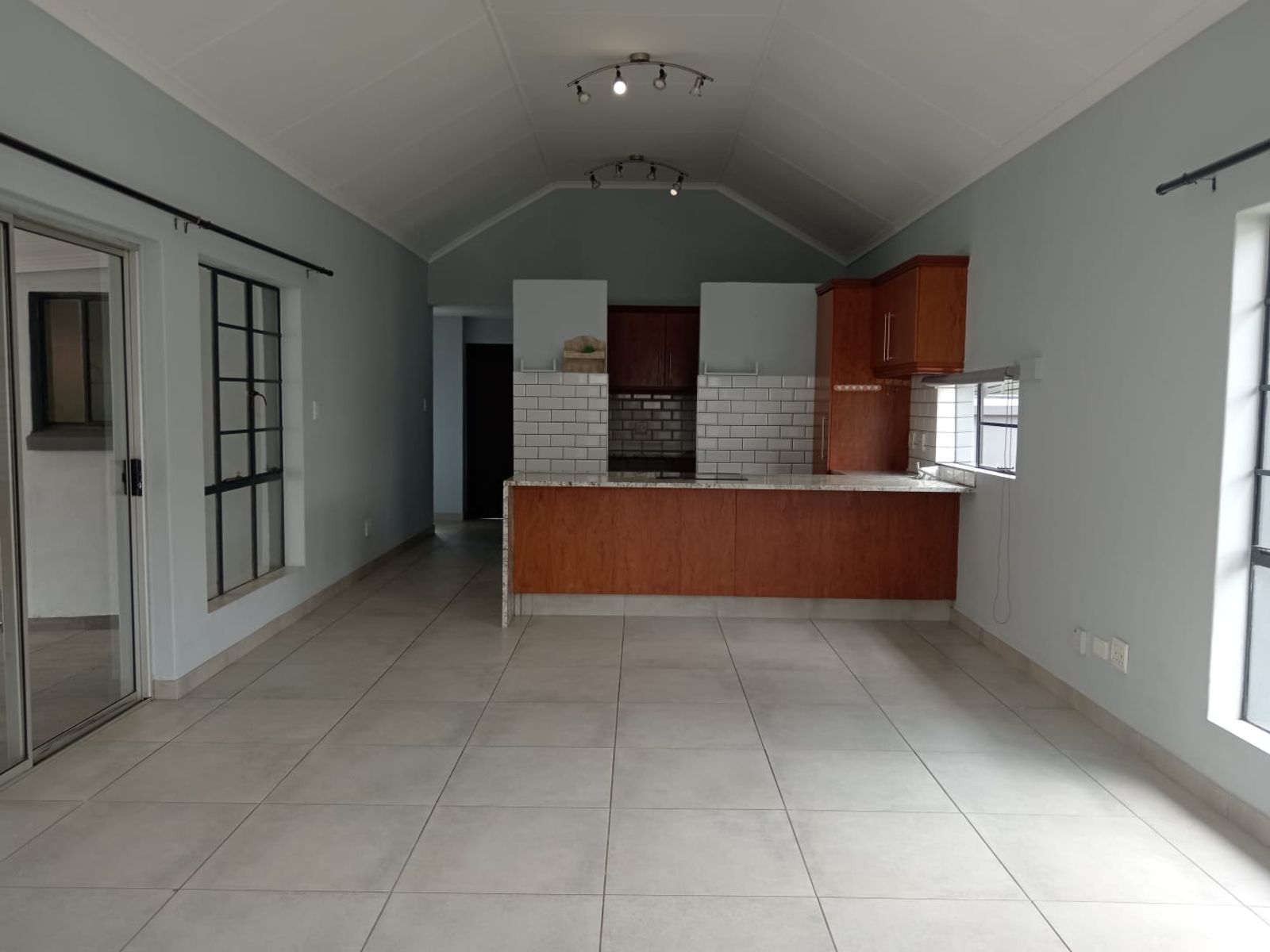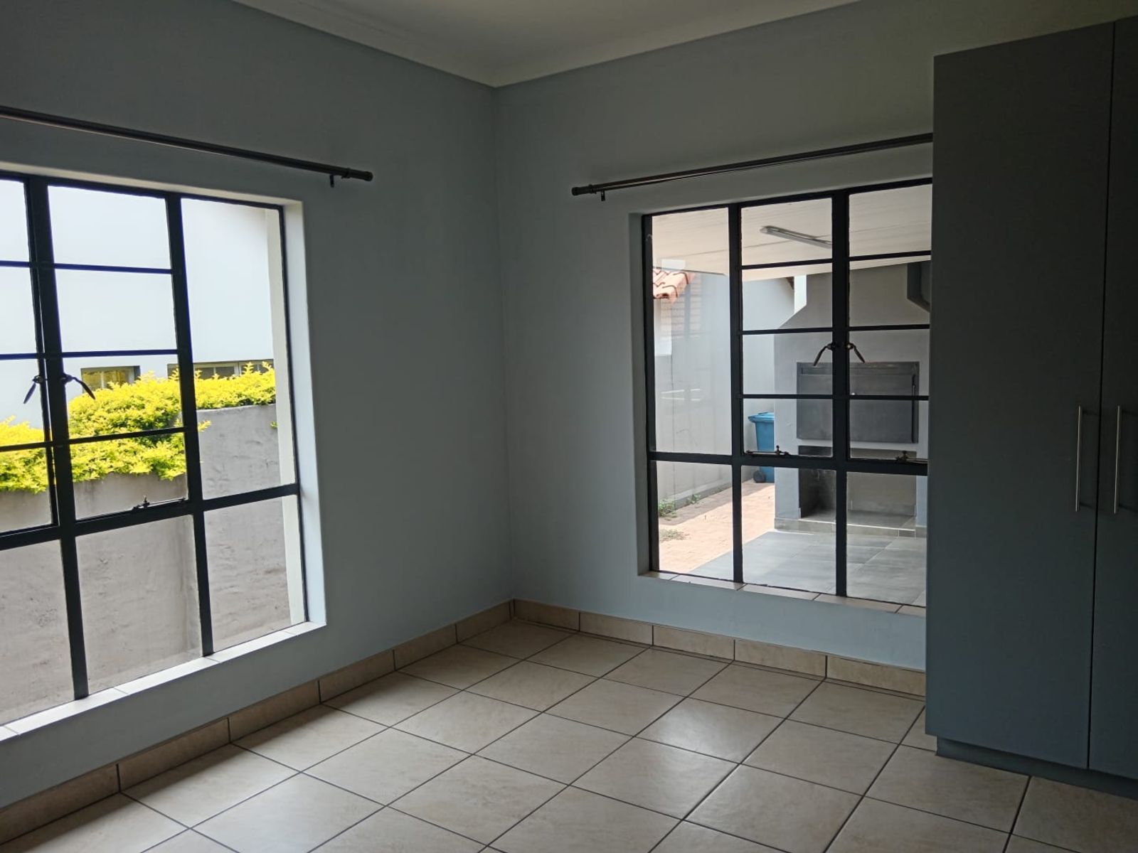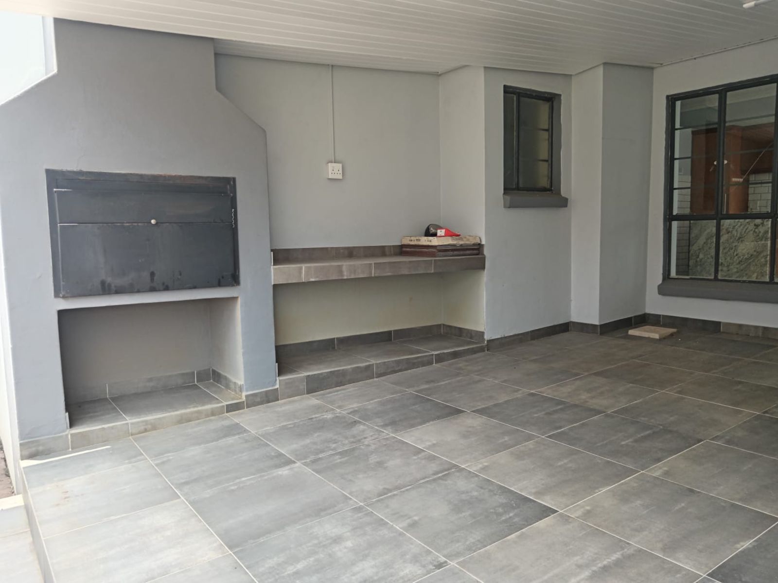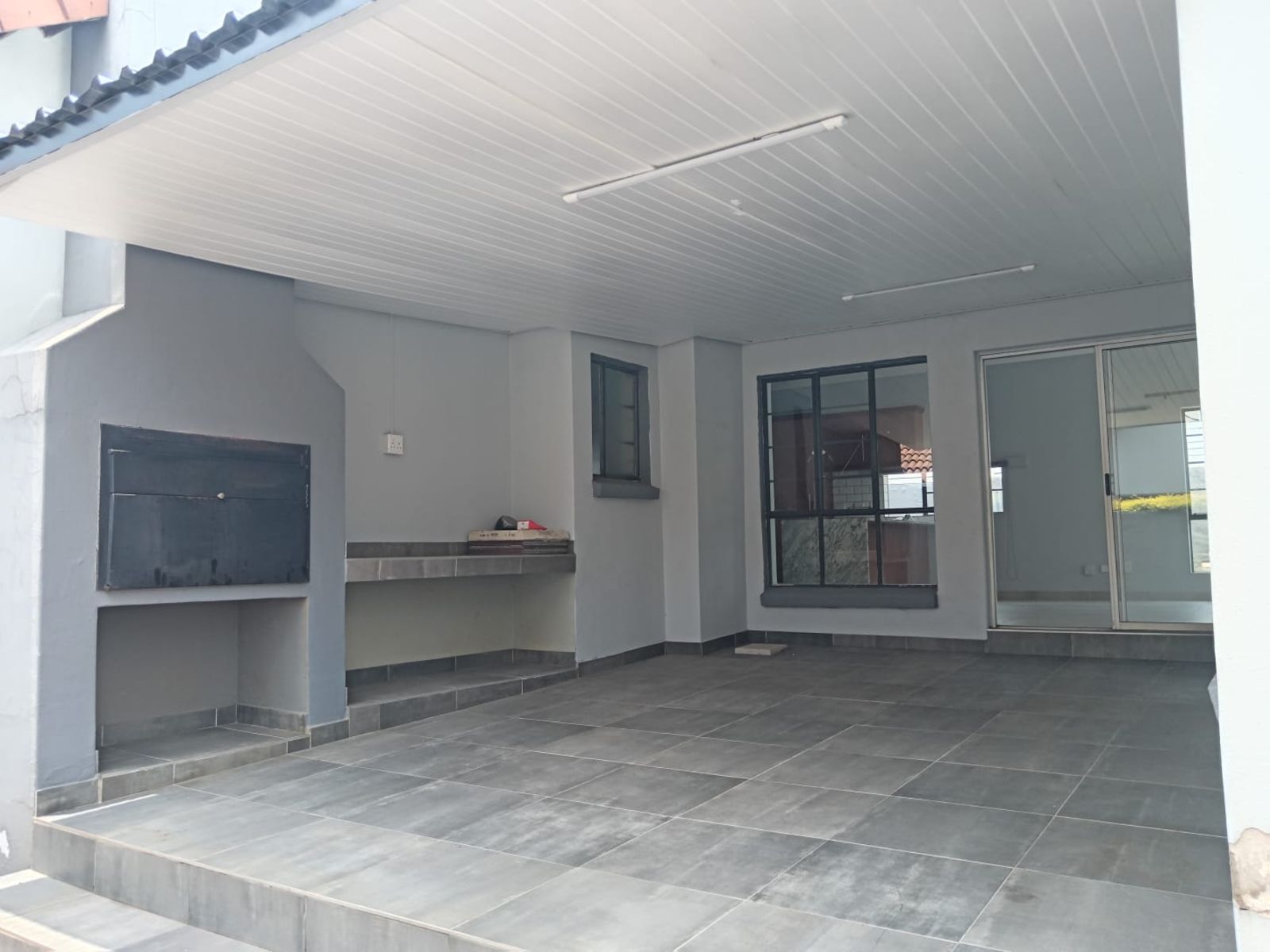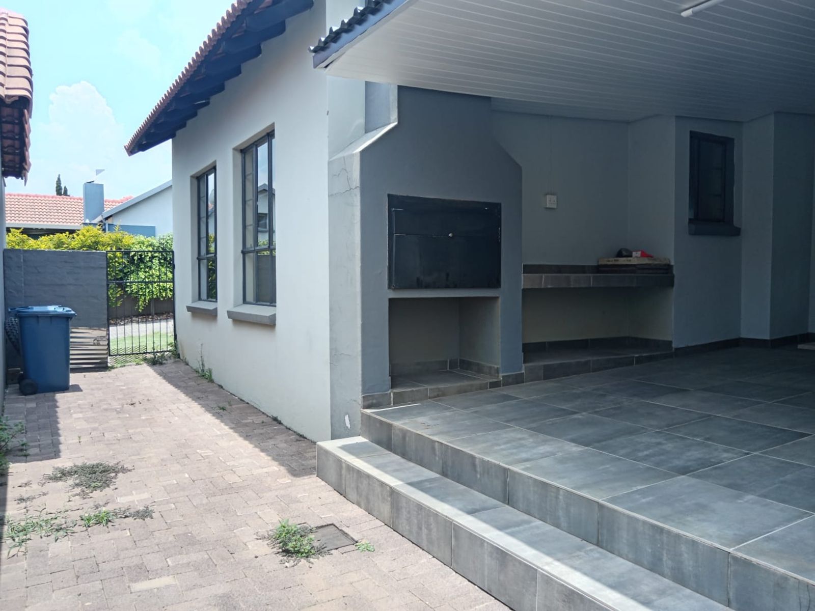 The living space flows seamlessly through glass doors onto a covered stoep featuring a built-in braai—the ideal spot for weekend entertaining, regardless of the weather. For your convenience and peace of mind, the property includes a small inverter system to keep the lights on during power outages, and the double garage is fully motorized.