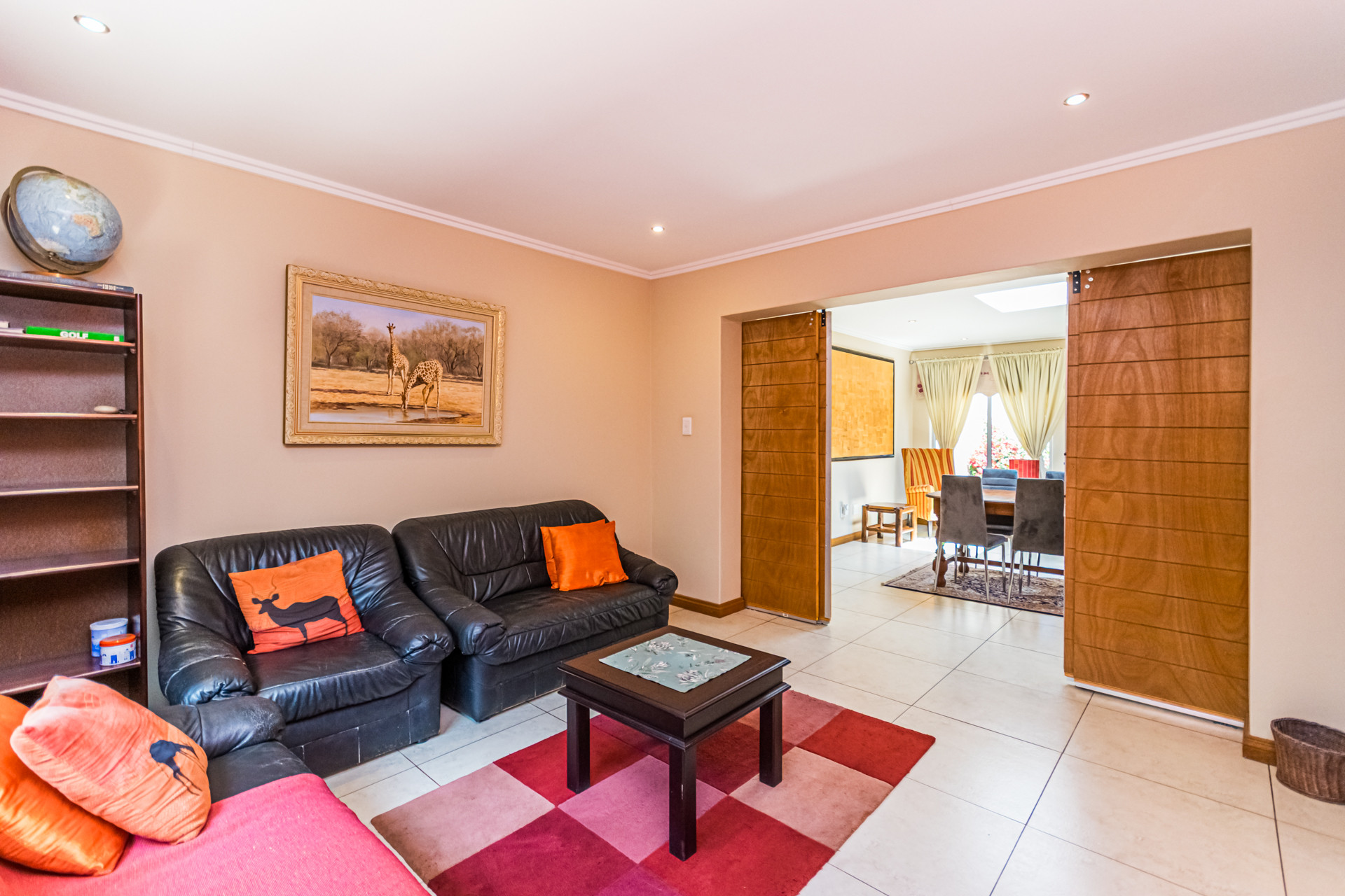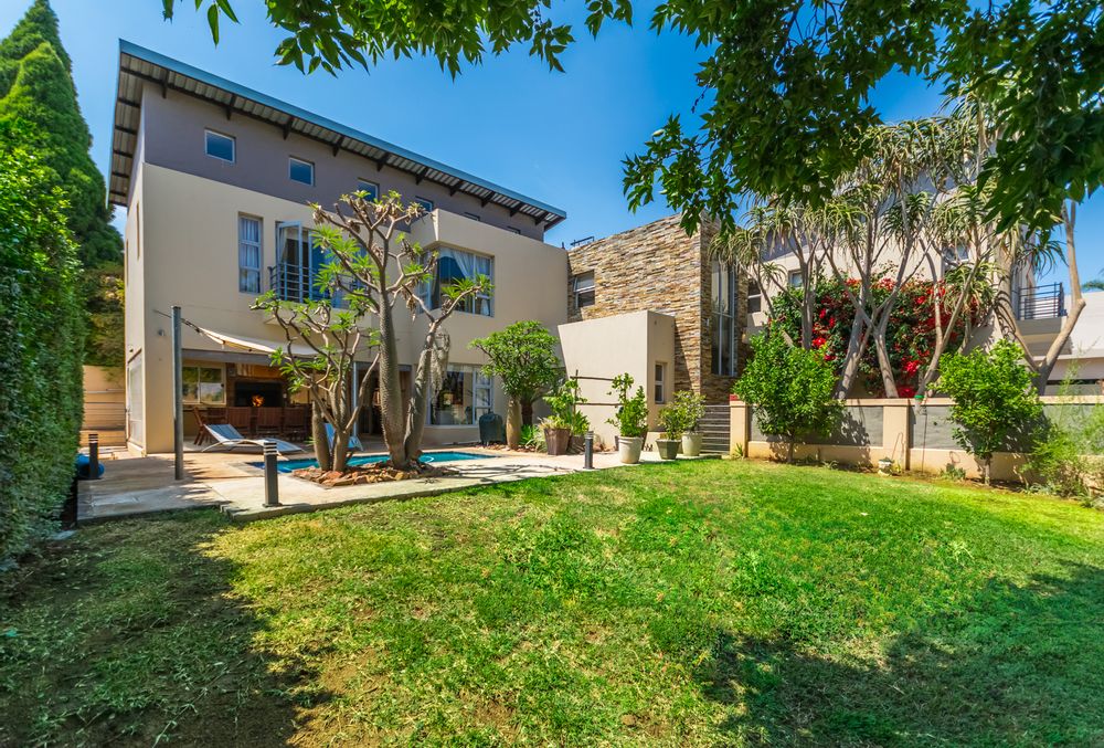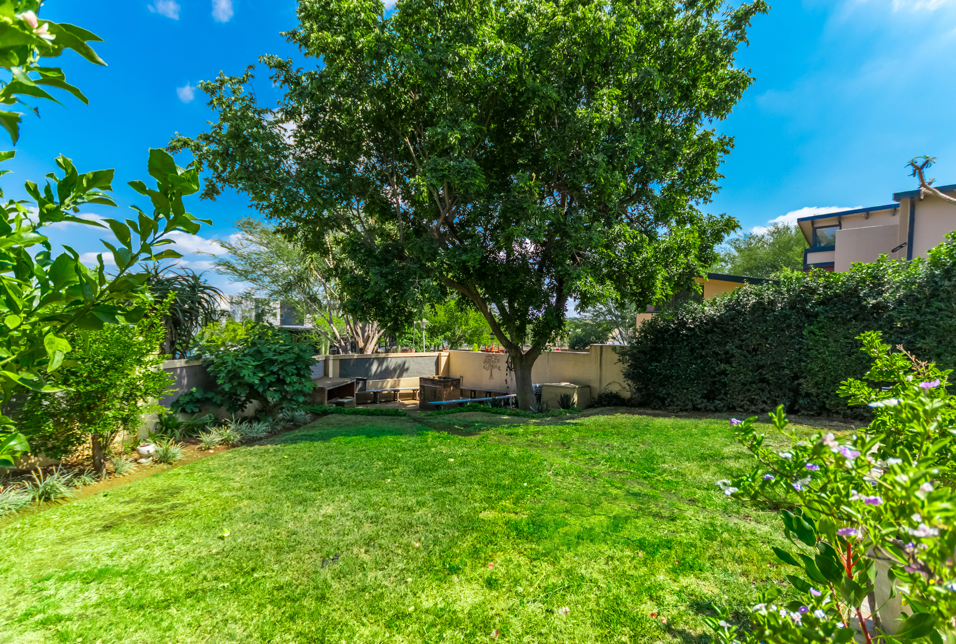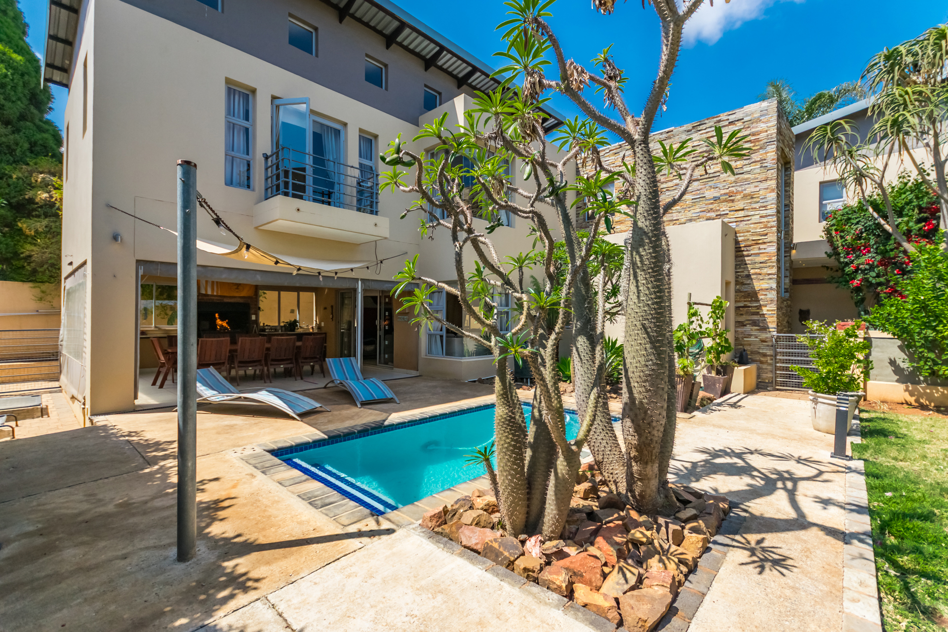 The covered entertainment area with built-in braai opens onto a sparkling pool and cozy, low-maintenance garden. A boma area at the back of the garden creates a warm spot for evening gatherings.