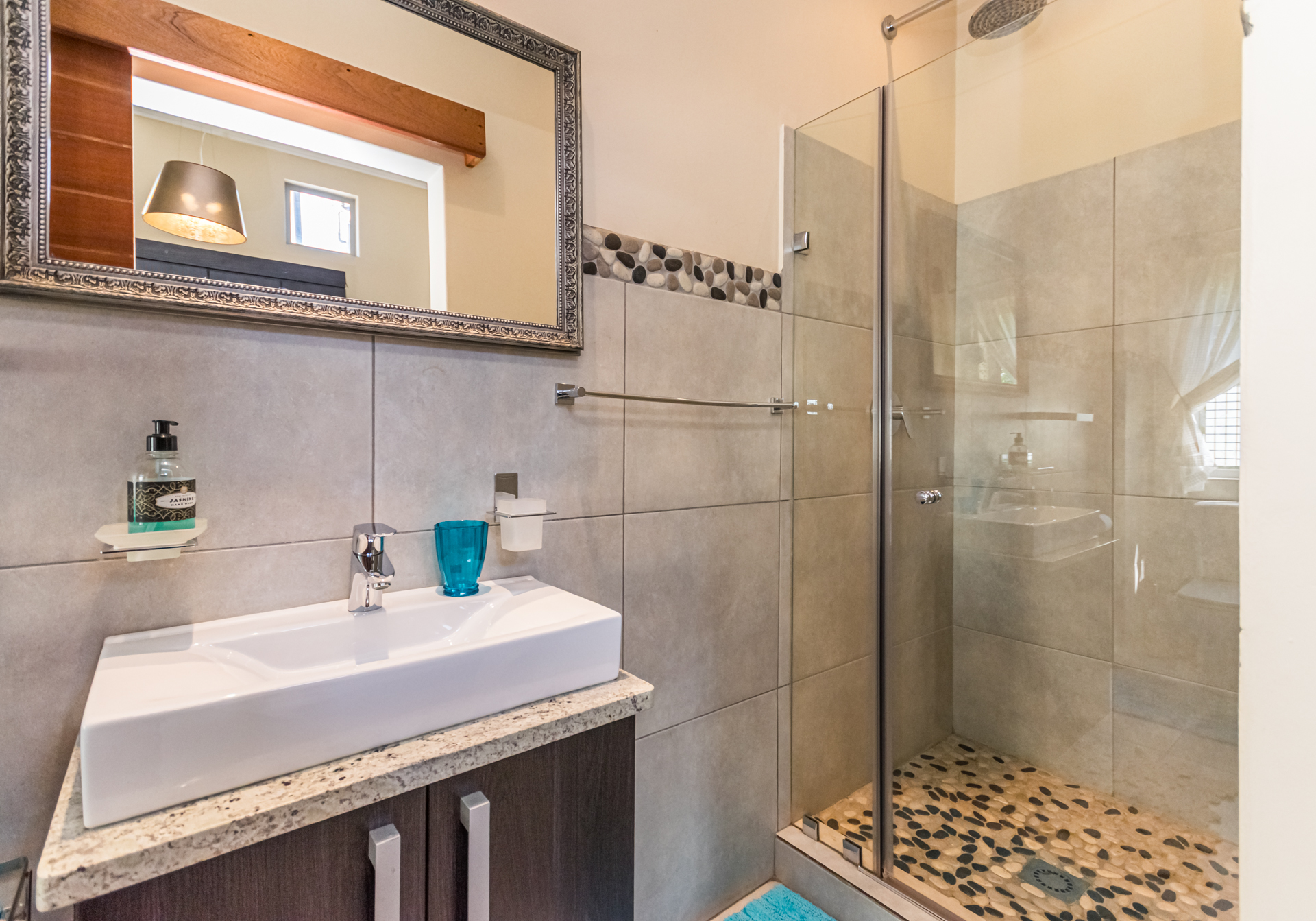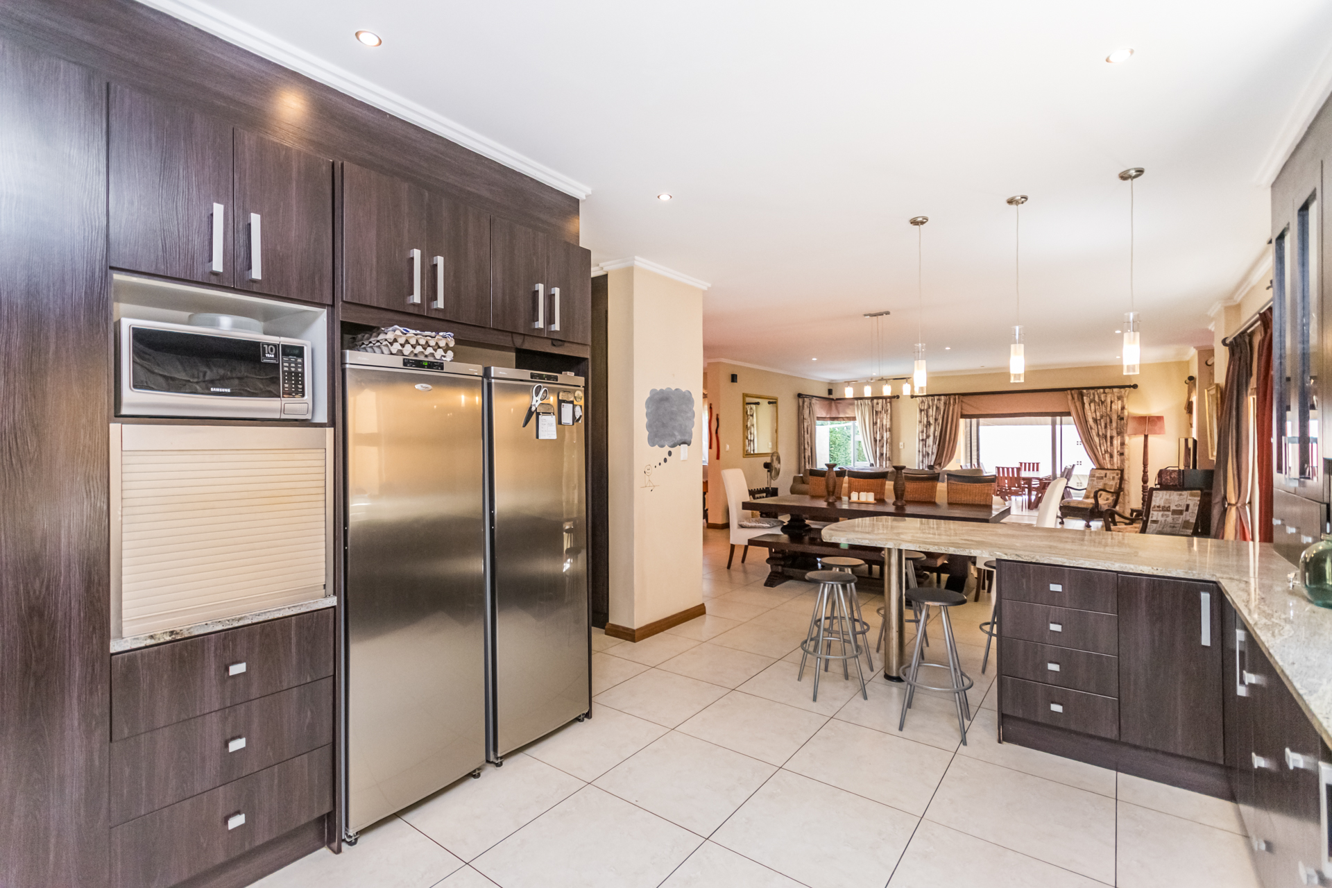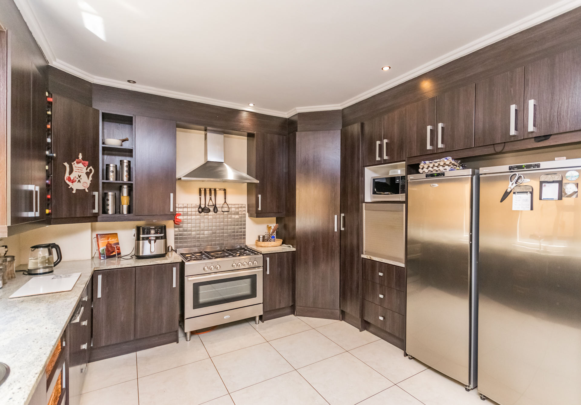 Downstairs, the generous open-plan living areas flow into a modern kitchen with a gas stove, plenty of cupboard space, and separate scullery and laundry areas. A guest toilet adds convenience for visitors.