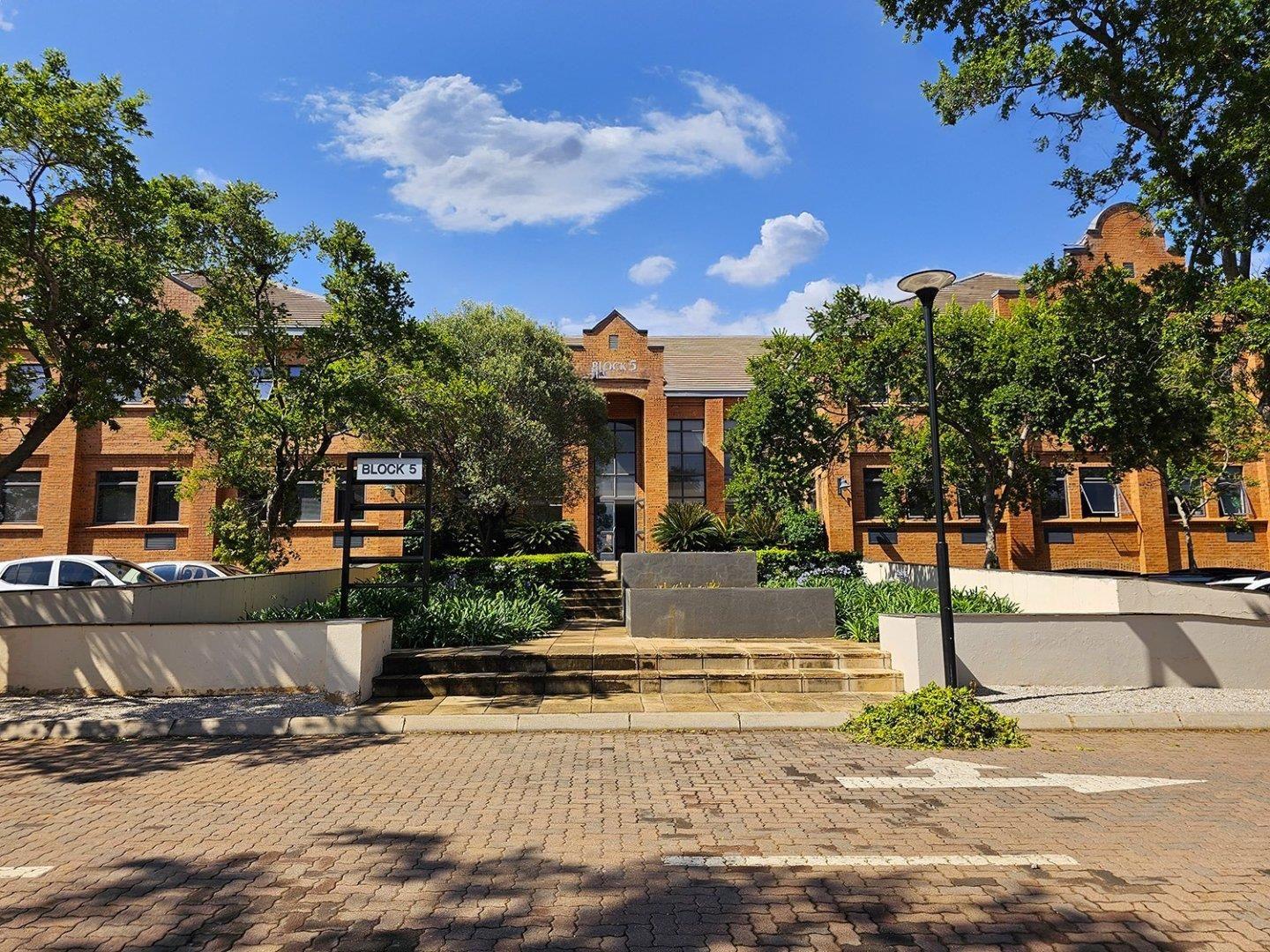 Surrounded by lush gardens and mature trees, creating a peaceful work environment