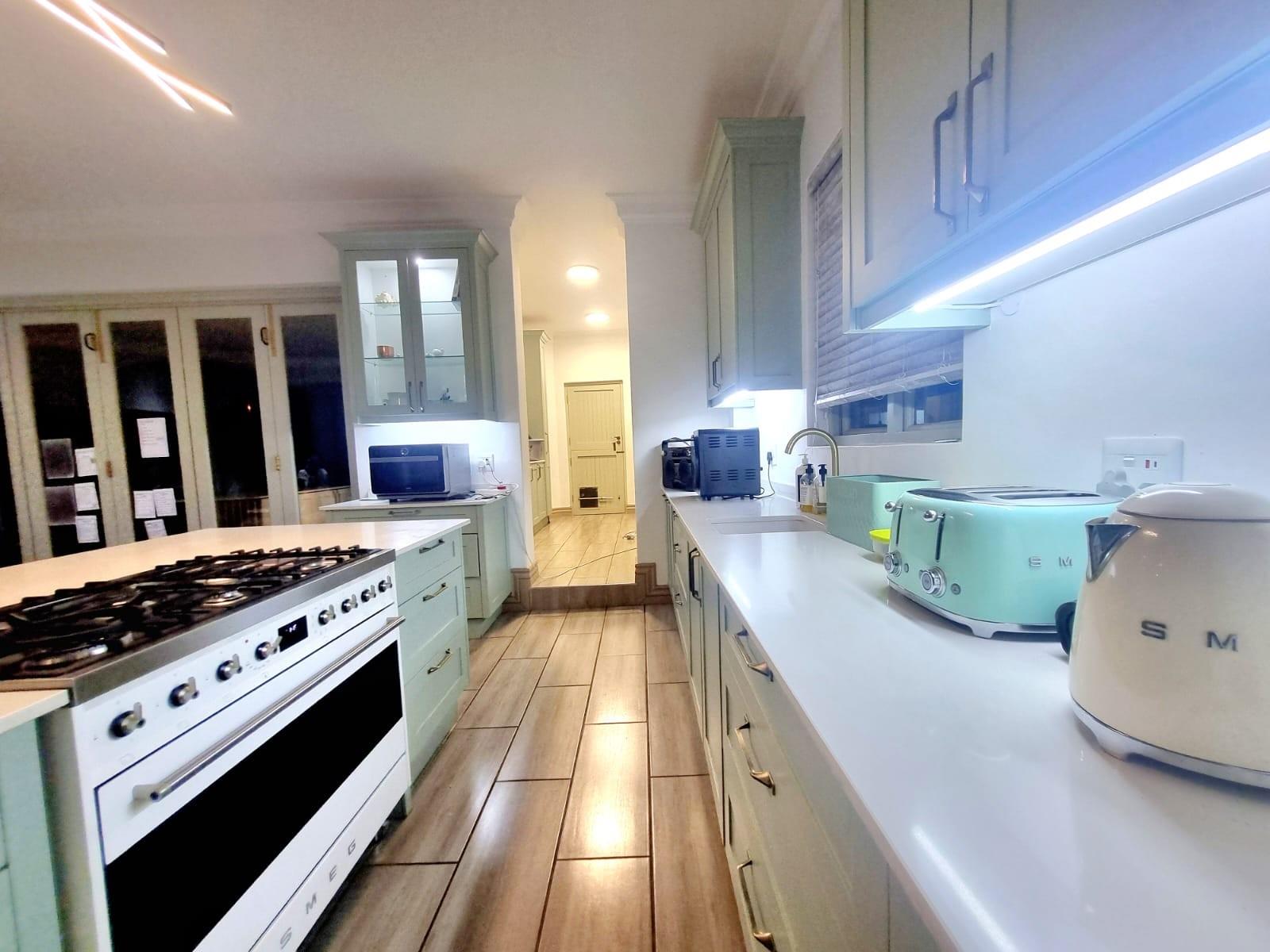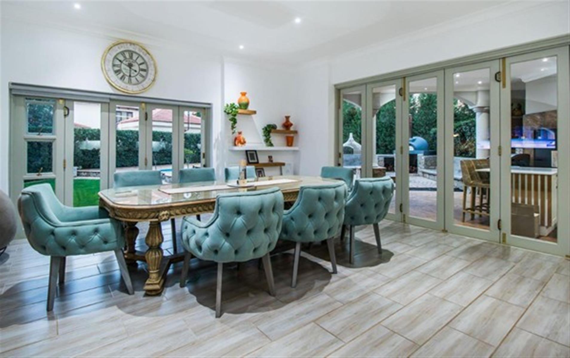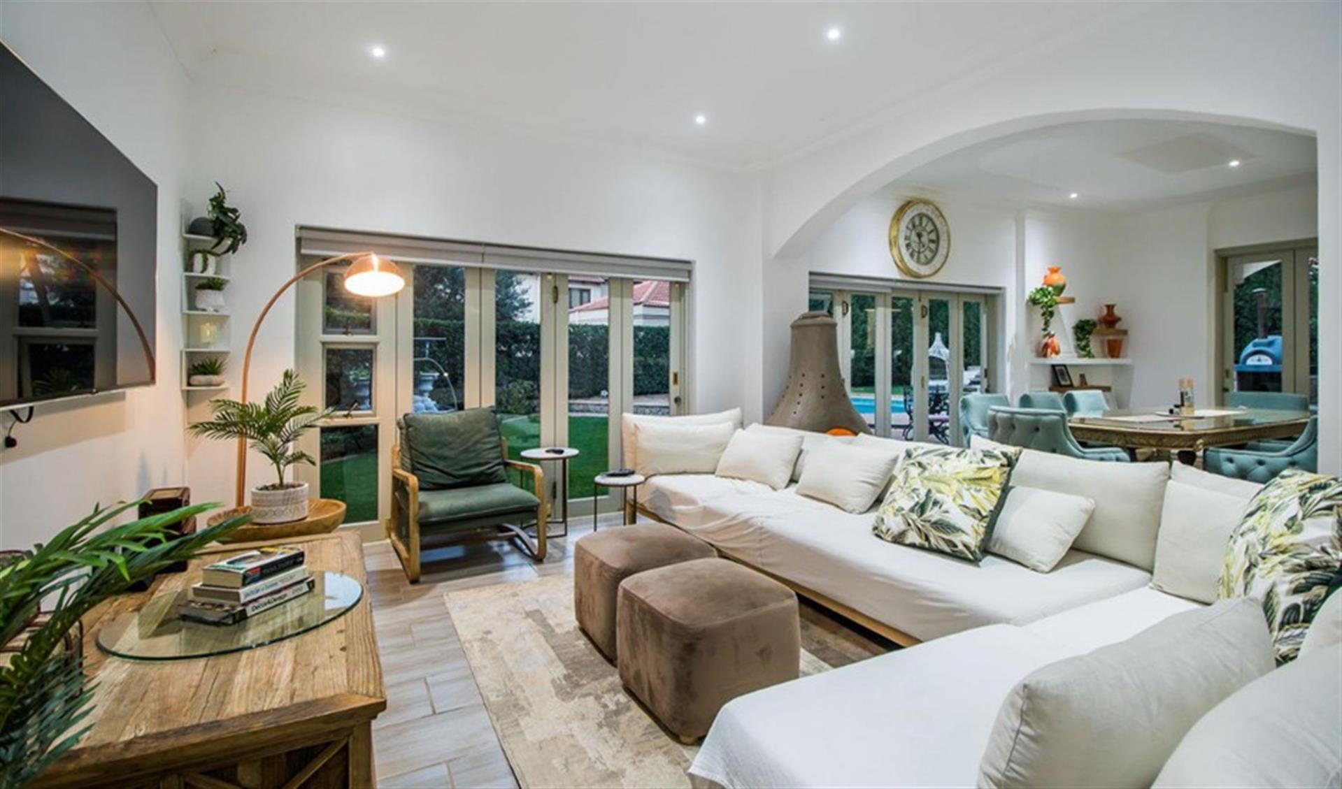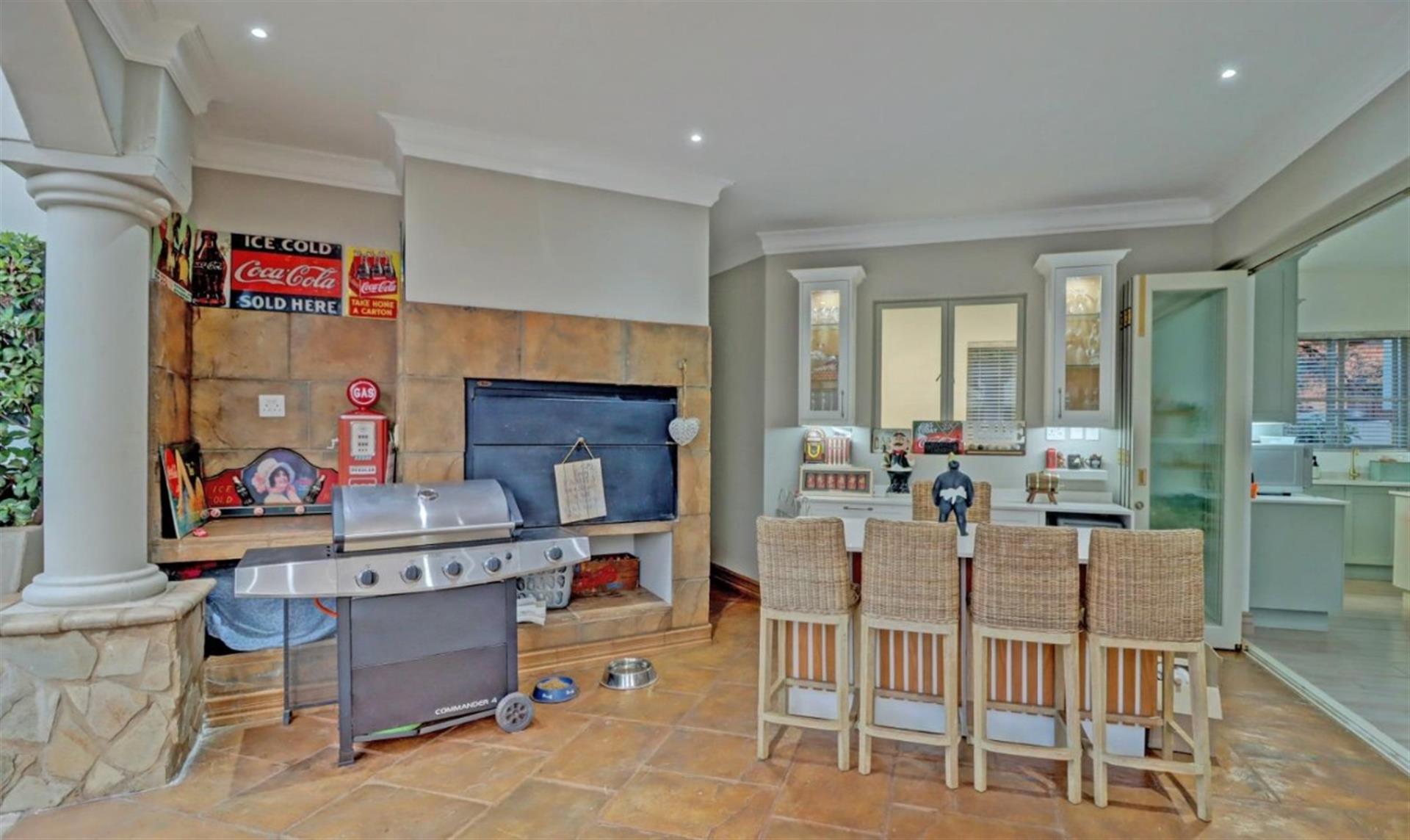 Step inside to discover an open-plan living area that flows effortlessly through stacking glass doors to a covered patio, complete with built-in braai, boma, and a pizza oven – ideal for hosting family and friends.