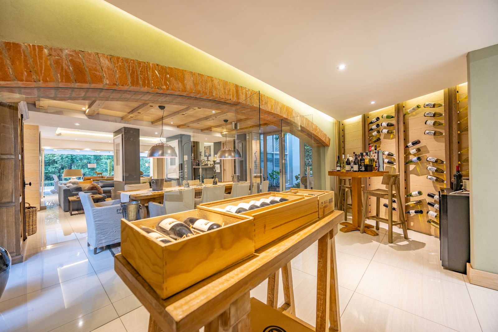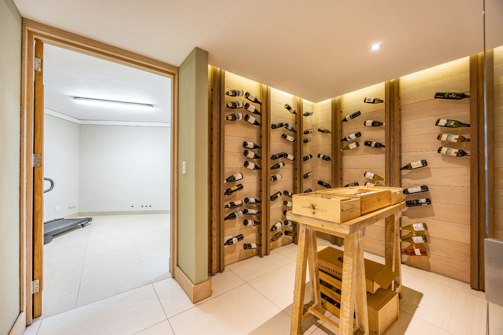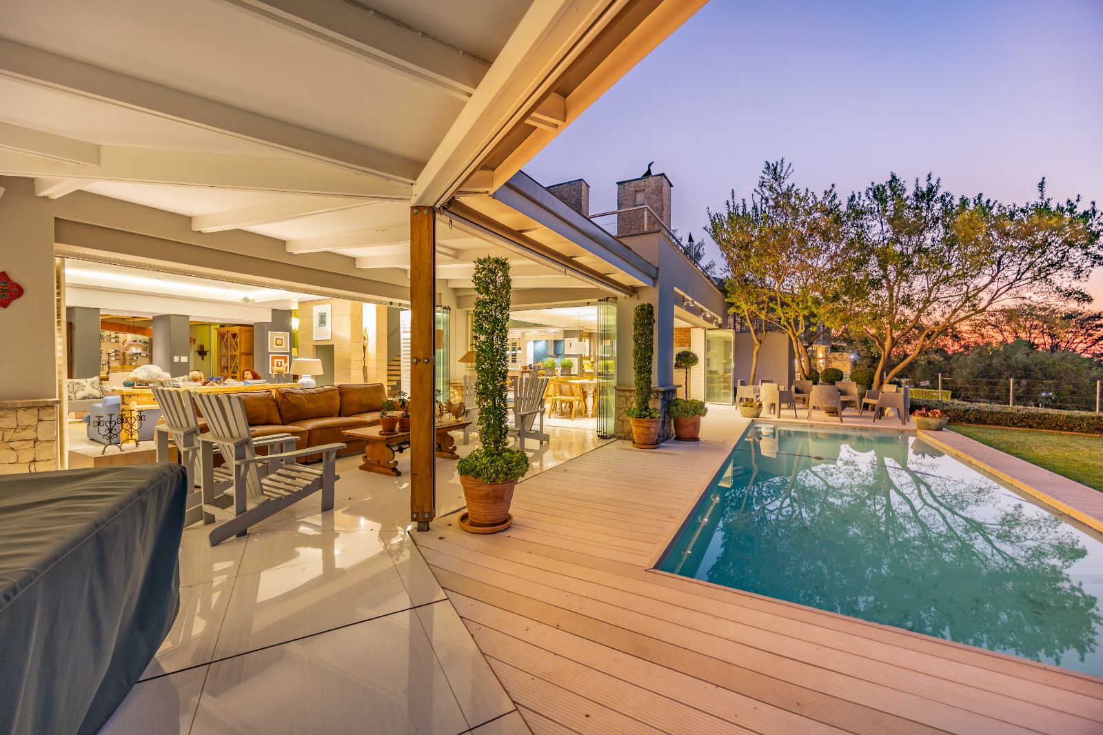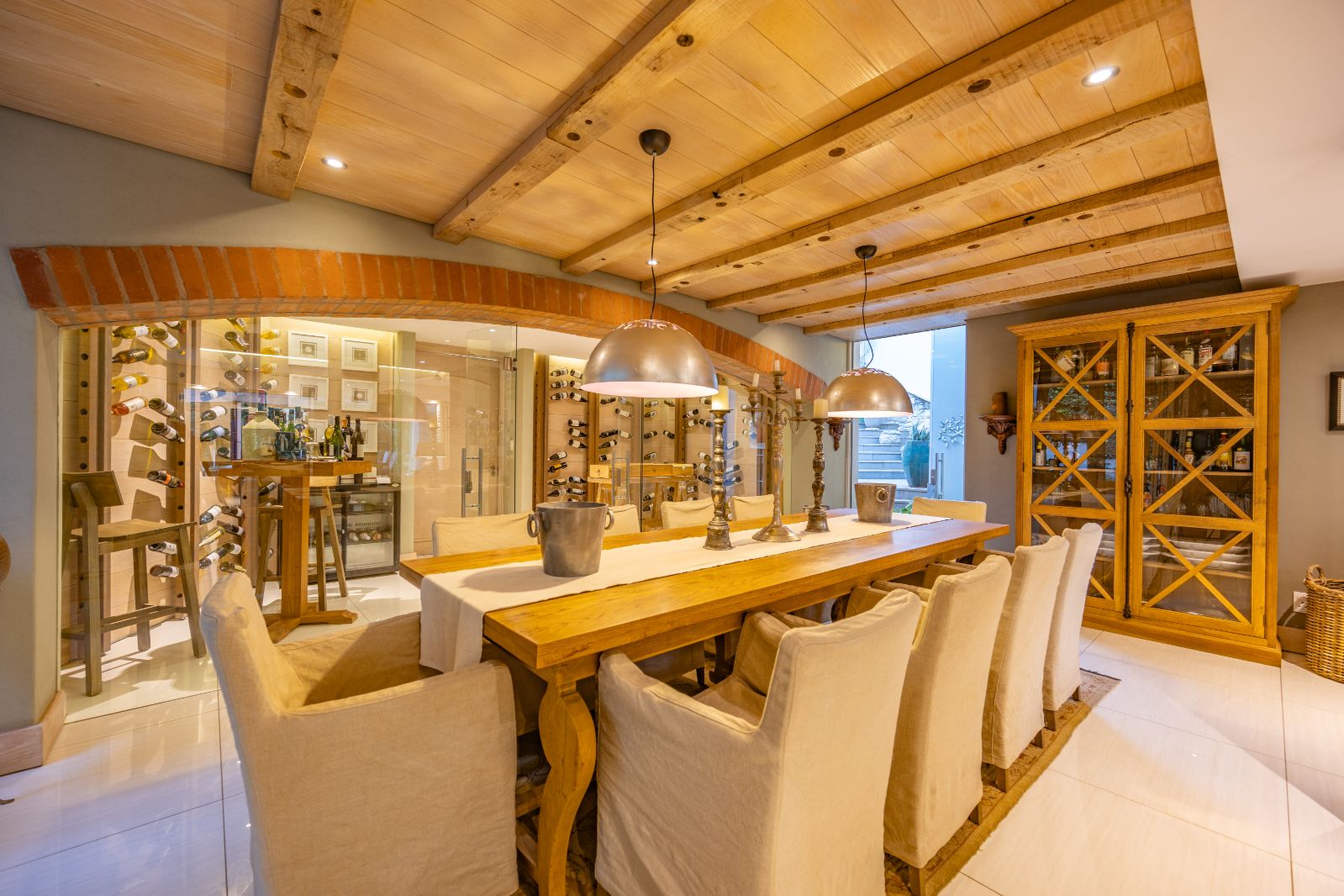 The home’s culinary heart is a designer kitchen with premium finishes, abundant storage, and a separate scullery with space for three appliances. Entertaining is elevated by the glass-walled wine cellar with Mediterranean flair, a built-in braai, pizza oven, and a fabulous firepit—all designed to create memorable gatherings.