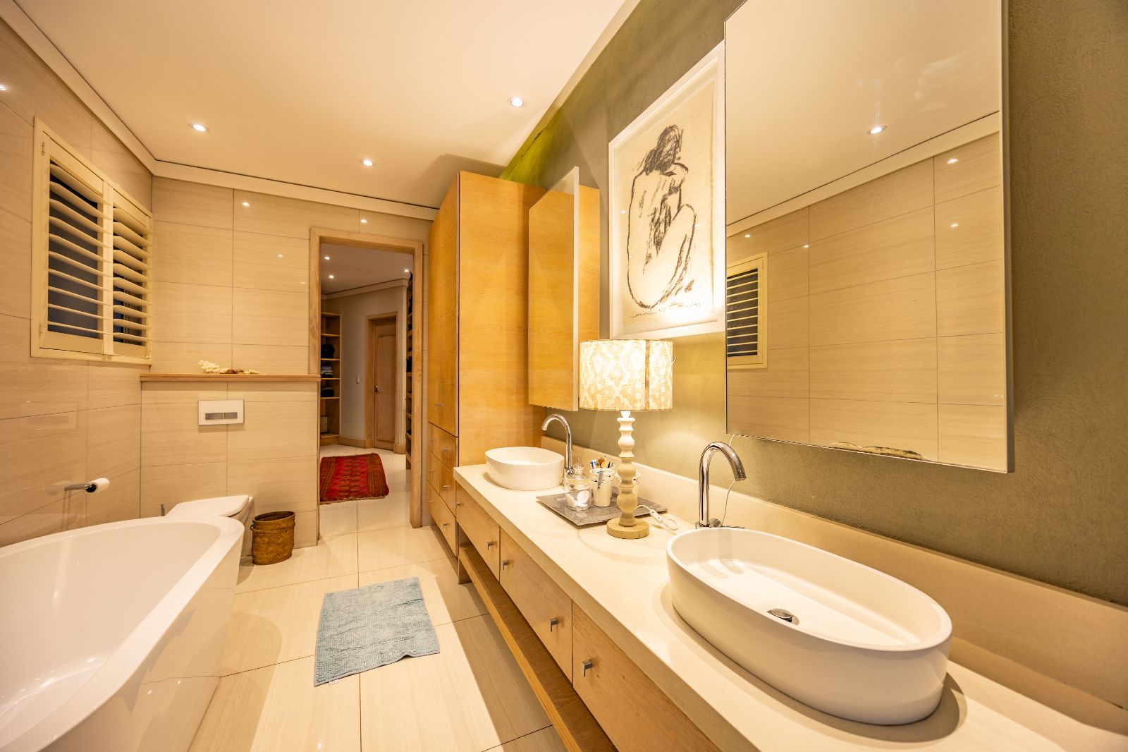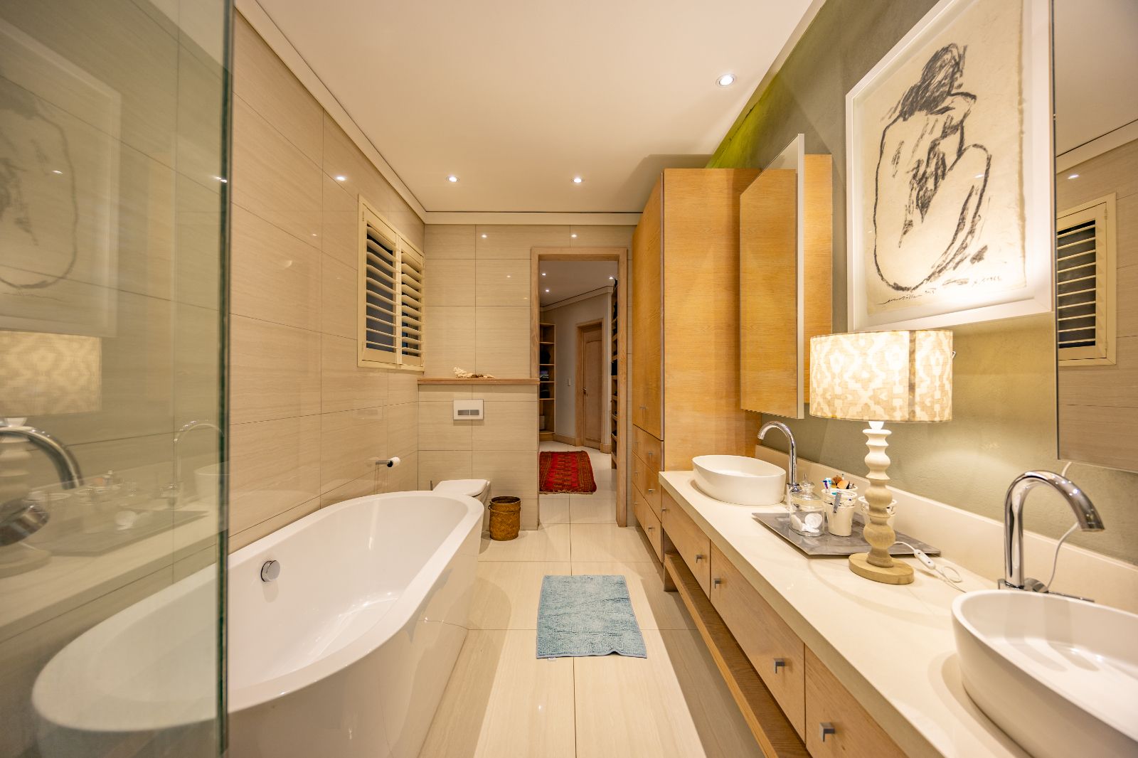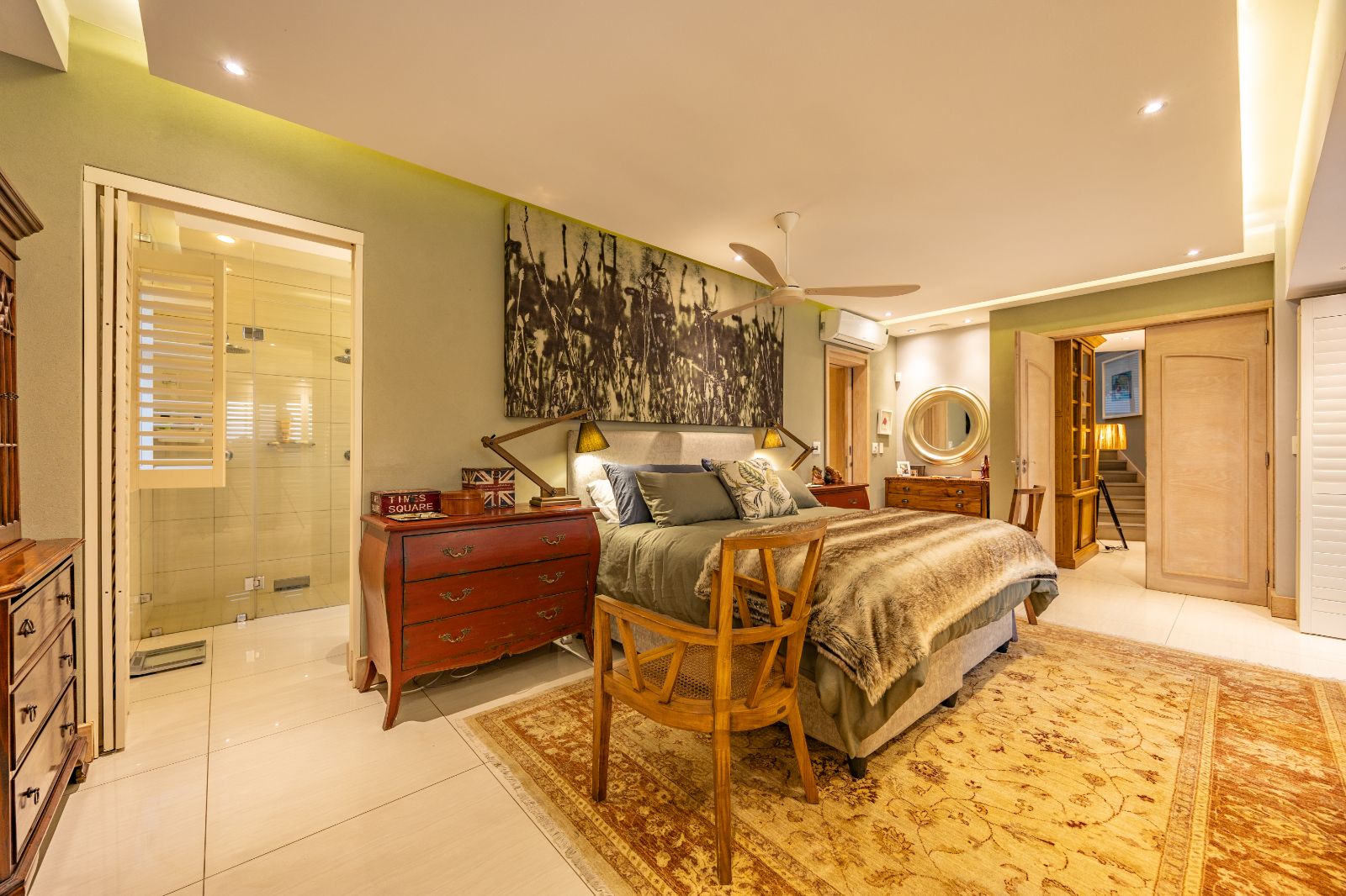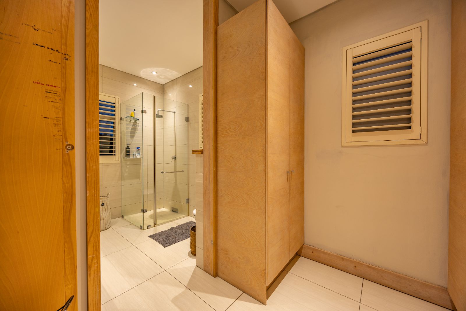 The ground-floor main bedroom suite is a sanctuary of comfort and sophistication, complete with a walk-in closet, exquisitely appointed bathroom, and private patio that overlooks the pool, manicured gardens, and the green belt. Two further en-suite bedrooms on the upper level are equally spacious, each offering serene views over the estate’s greenery.