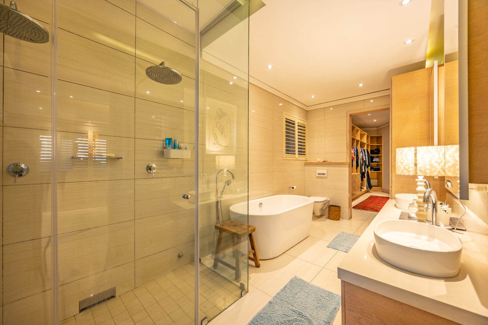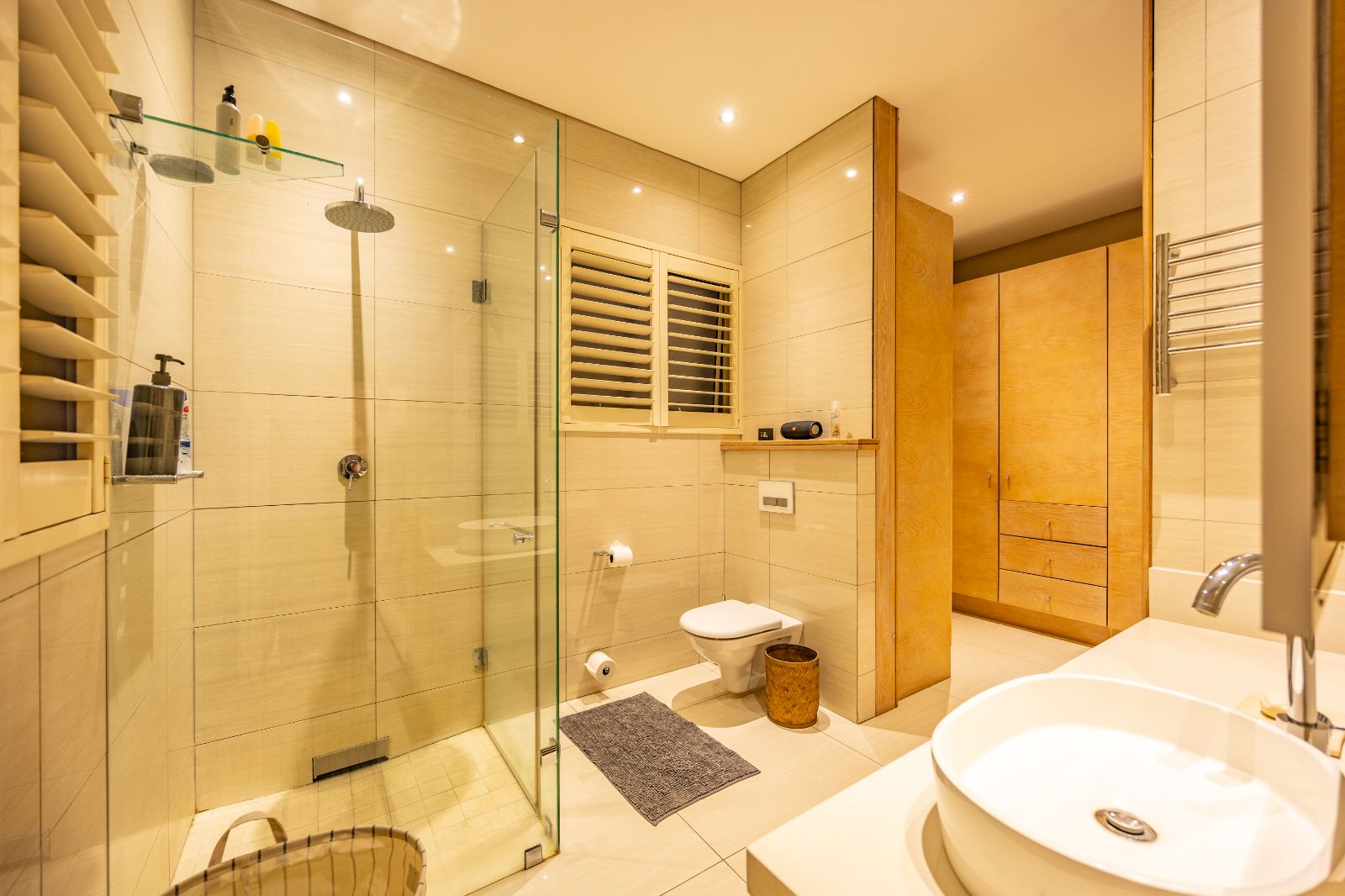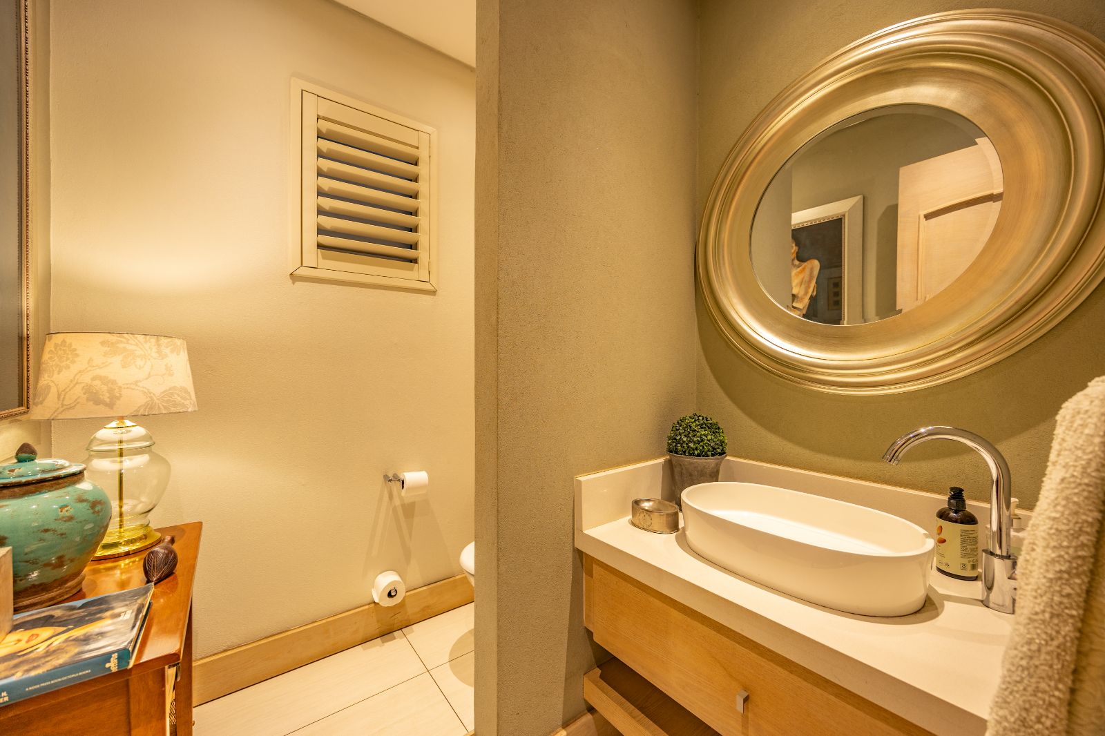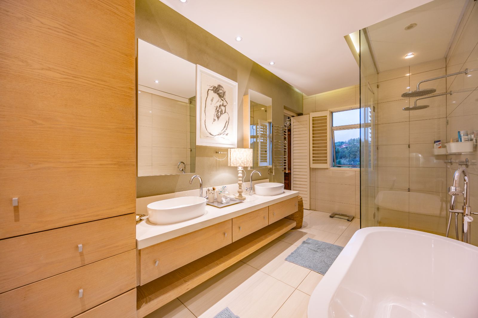 The ground-floor main bedroom suite is a sanctuary of comfort and sophistication, complete with a walk-in closet, exquisitely appointed bathroom, and private patio that overlooks the pool, manicured gardens, and the green belt. Two further en-suite bedrooms on the upper level are equally spacious, each offering serene views over the estate’s greenery.