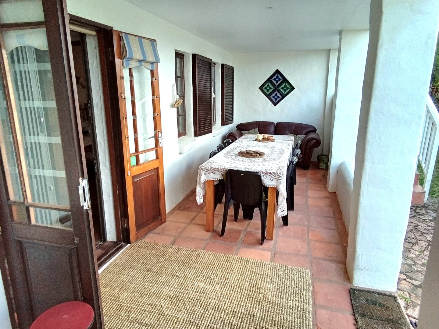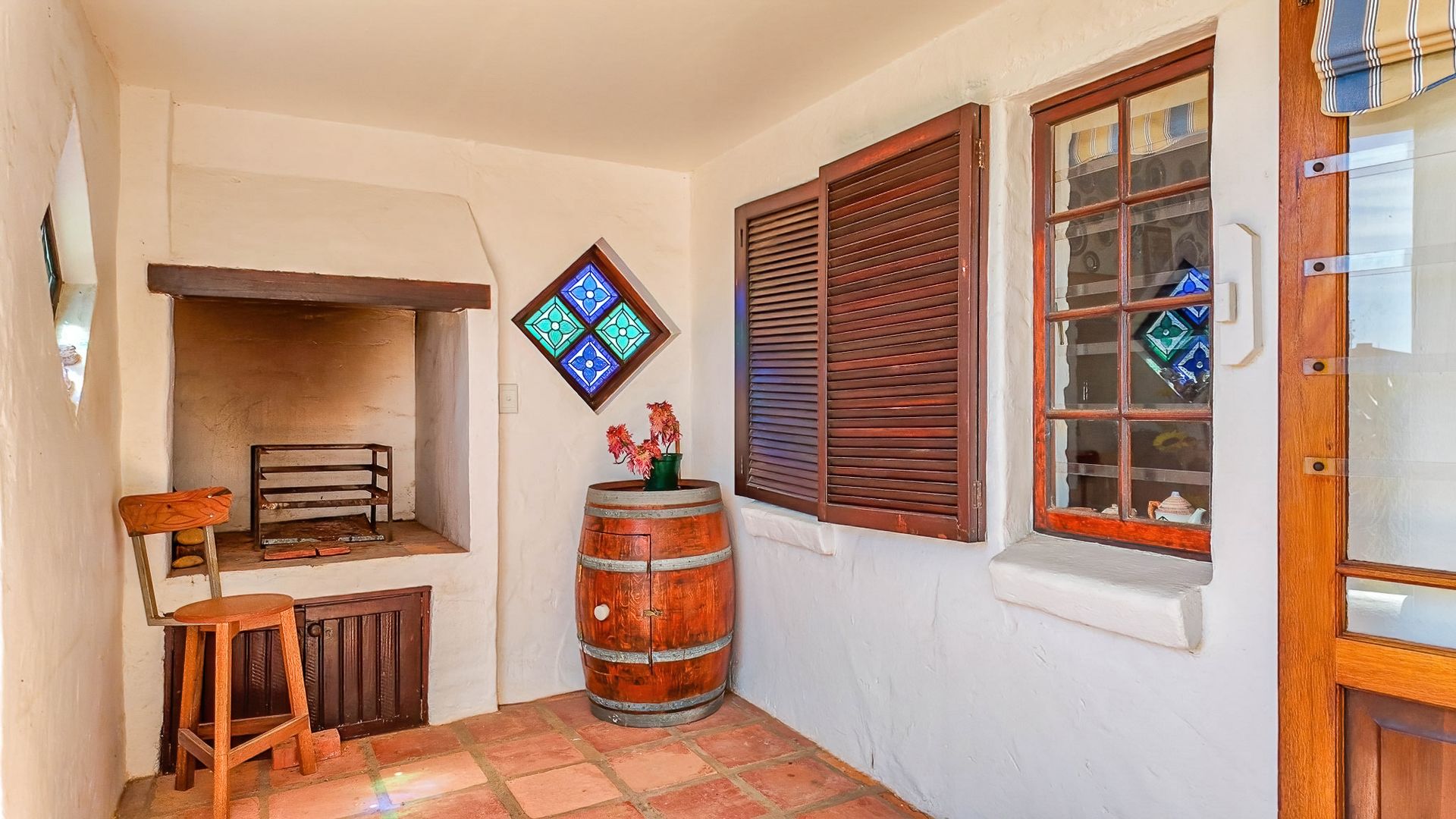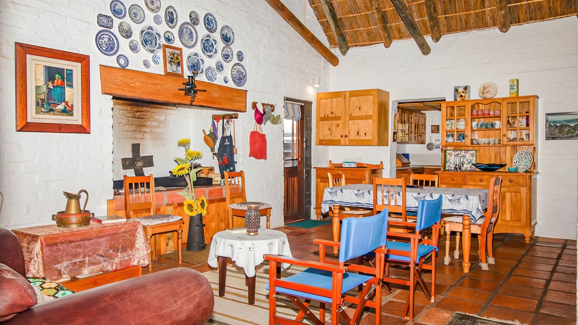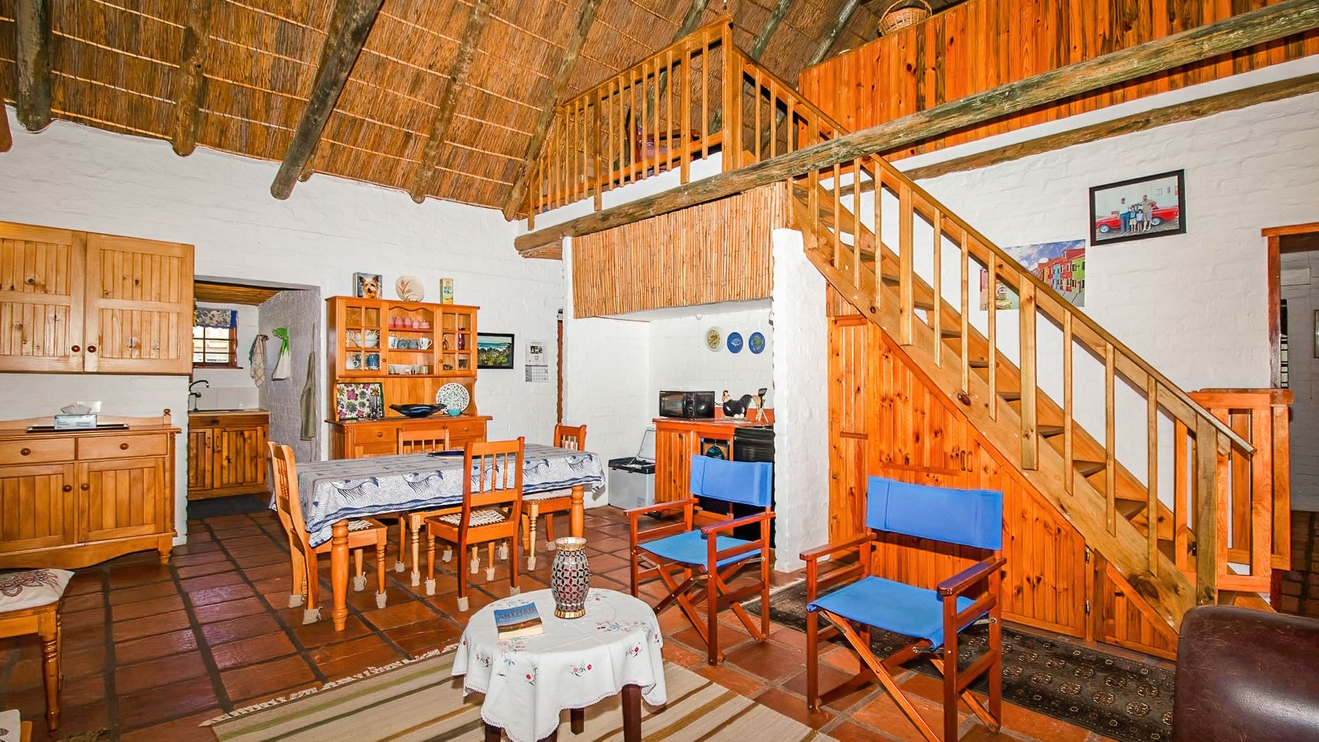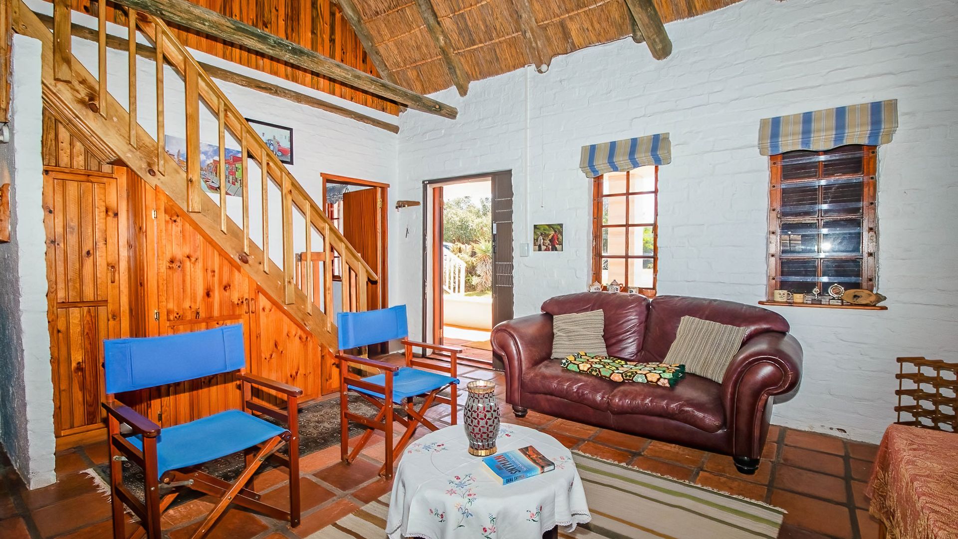 Step inside and feel instantly at home. The open-plan living and dining area features soaring double-volume ceilings with exposed reeds, cool clay tiles underfoot, and a cozy indoor braai/fireplace that makes the home inviting year-round. Double doors lead out onto a sunny north-facing stoep—perfect for relaxed breakfasts, evening braais, or simply soaking up the peaceful surroundings with the sound of the ocean nearby.