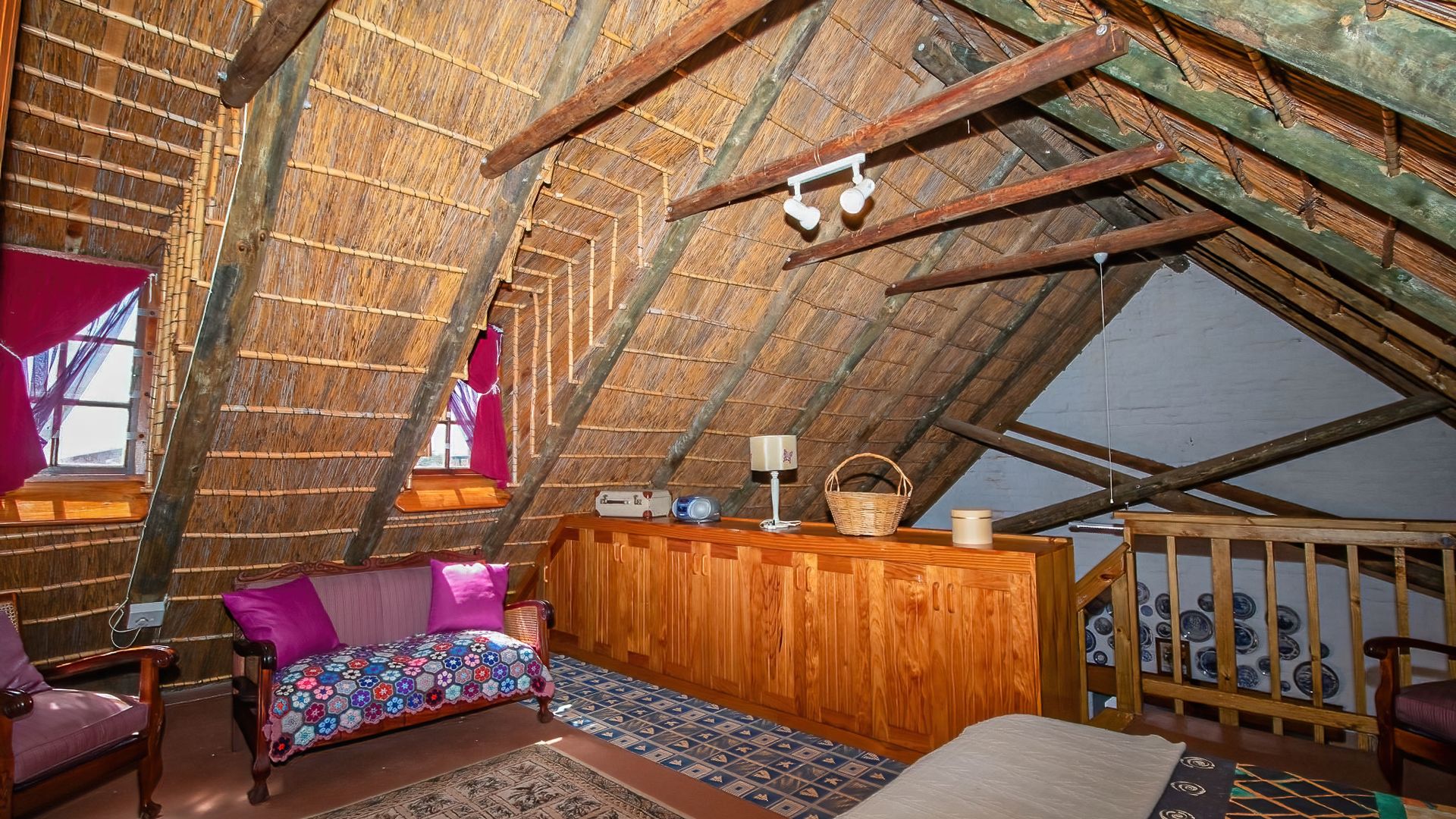 The kitchen is compact yet efficient, with a separate scullery adding to its functionality. A custom wooden staircase takes you up to a spacious loft with built-in cupboards and a private en-suite bathroom—ideal as a guest suite, teen retreat, or work-from-home studio.