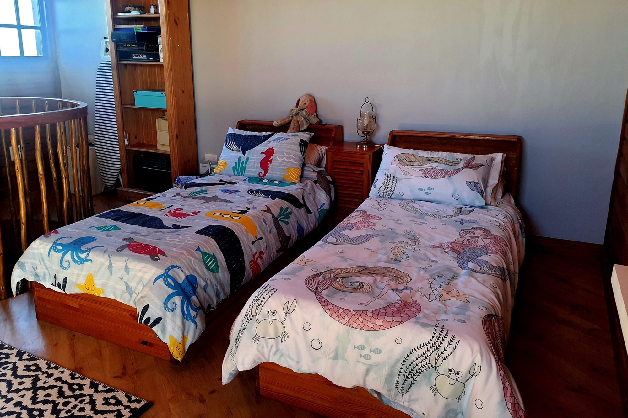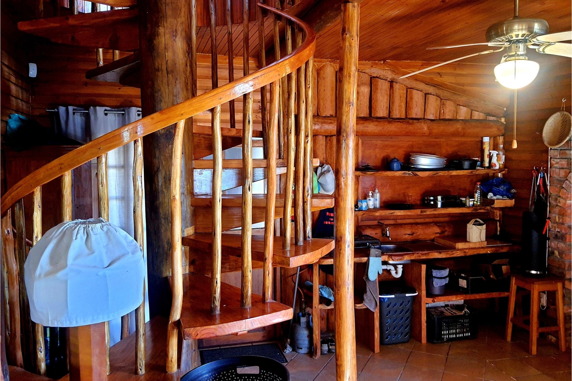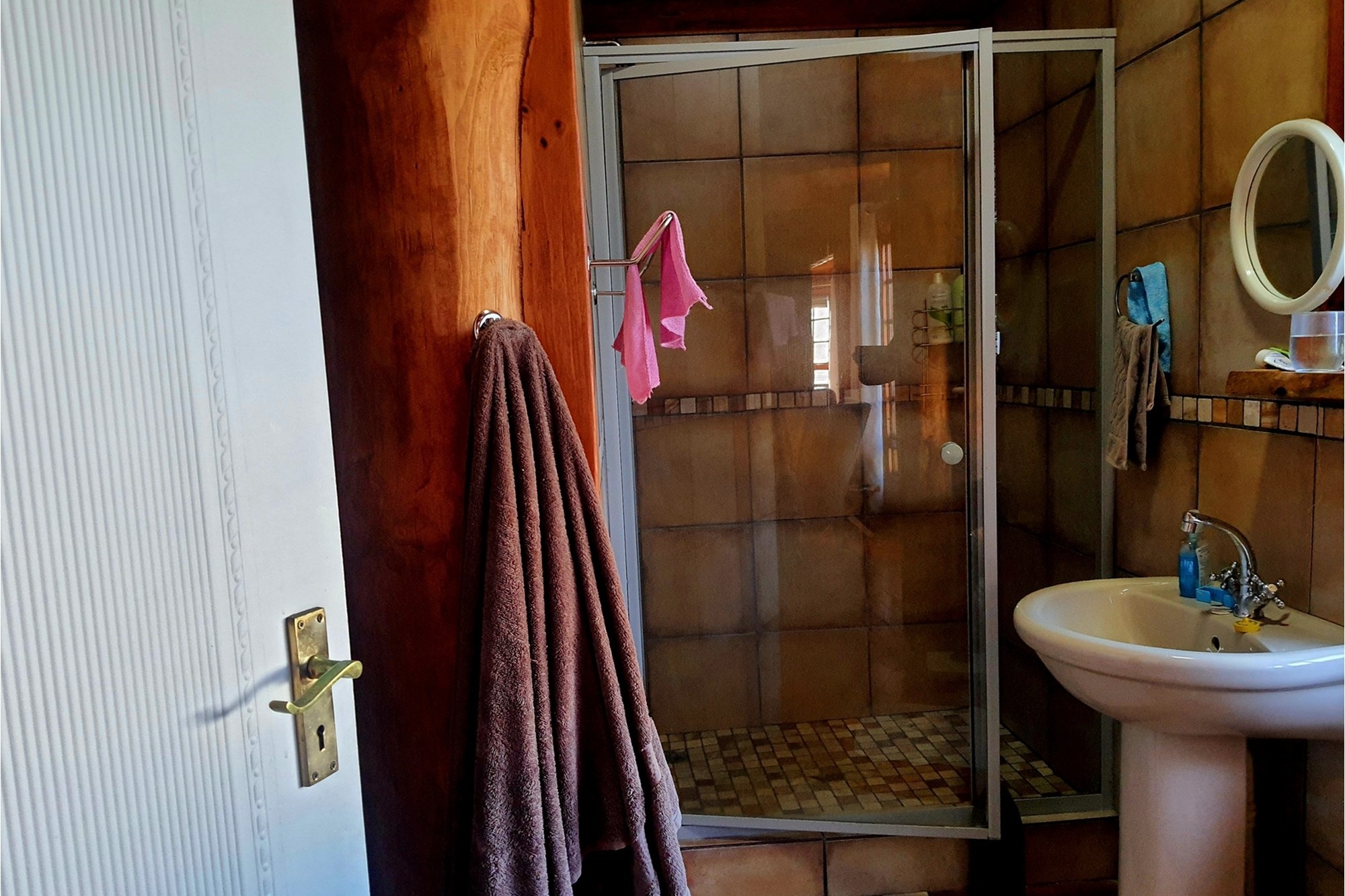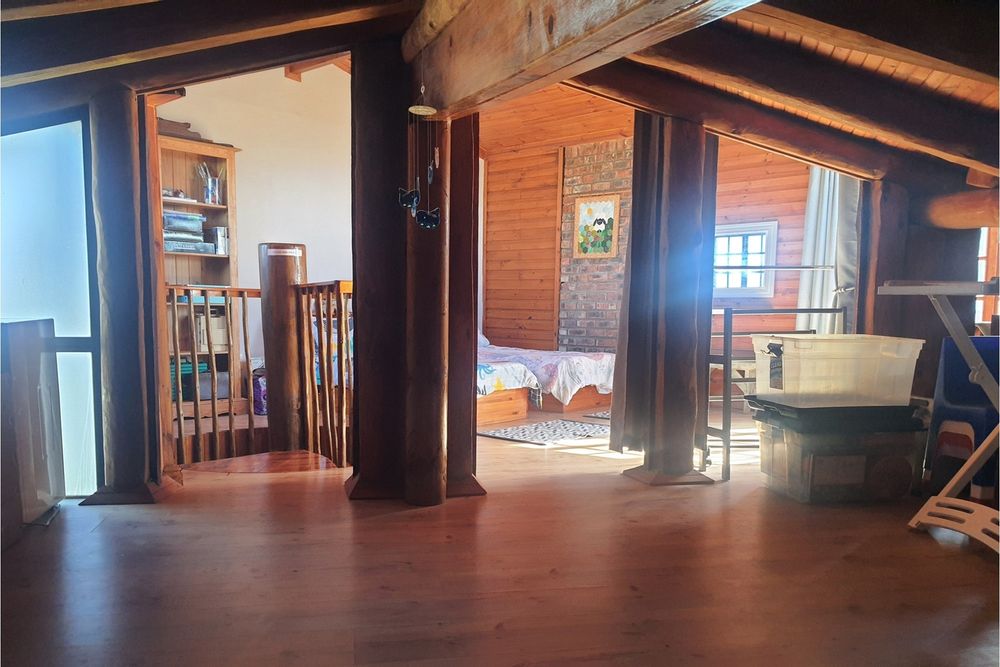 A sunny study, ideal for remote work or quiet reading, boasts spectacular views. Adjacent to the kitchen is a charming rustic braai room with a built-in braai and pizza oven – a space designed for unforgettable gatherings. A handcrafted spiral staircase leads to a versatile upstairs space with a third bedroom and a landing area perfect for a children`s playroom, studio or additional storage.