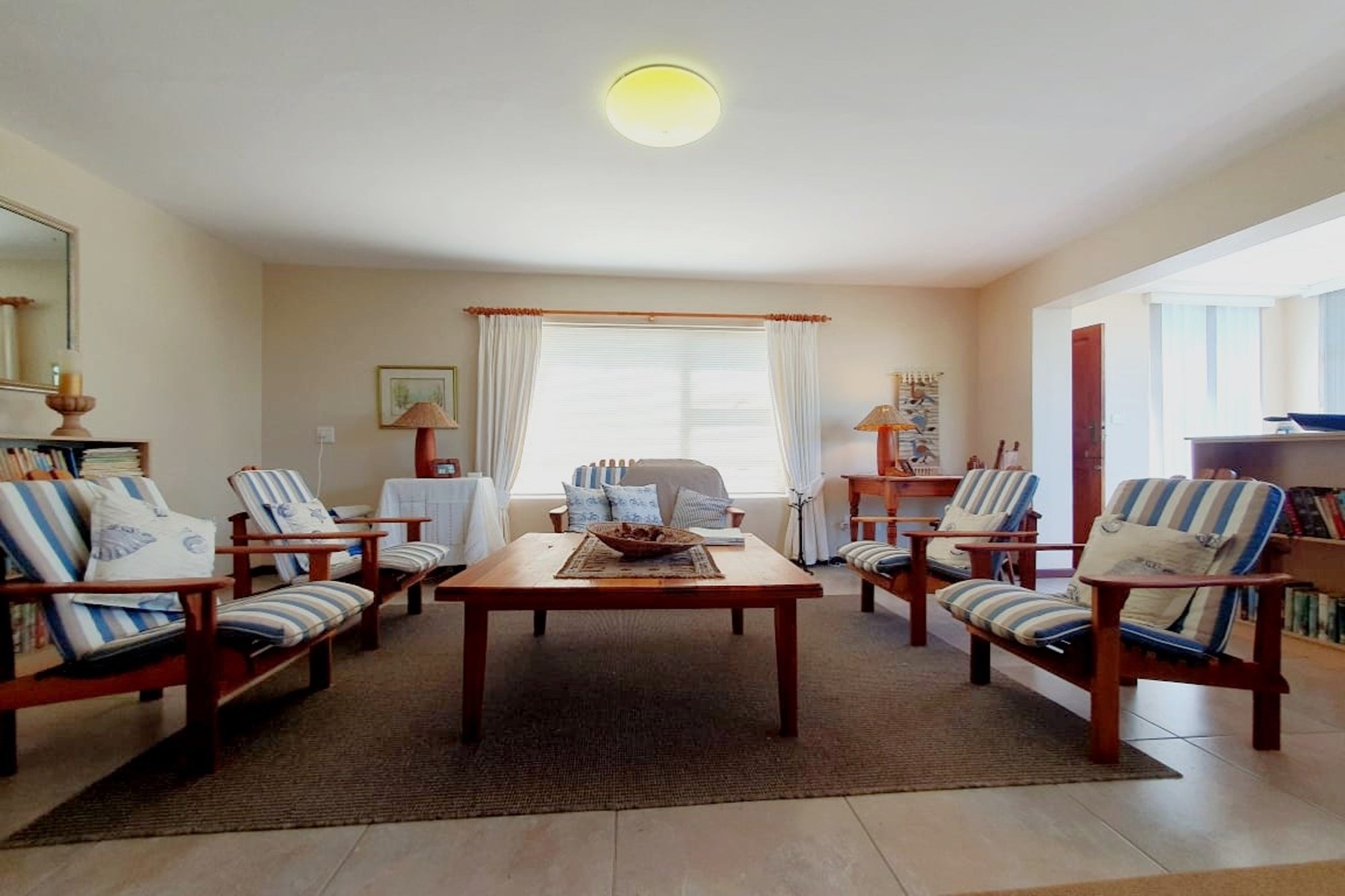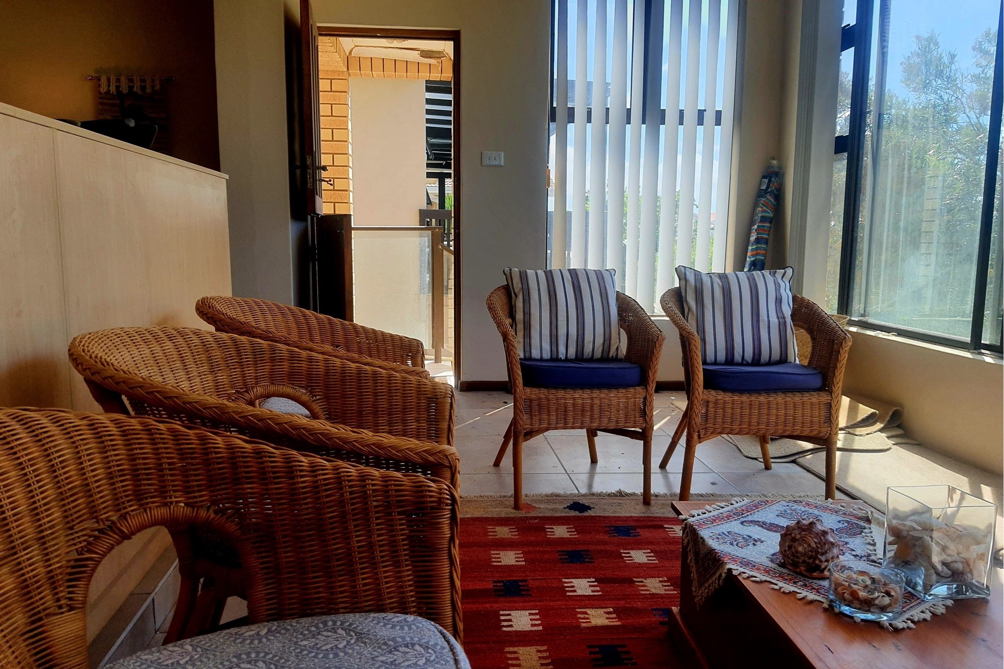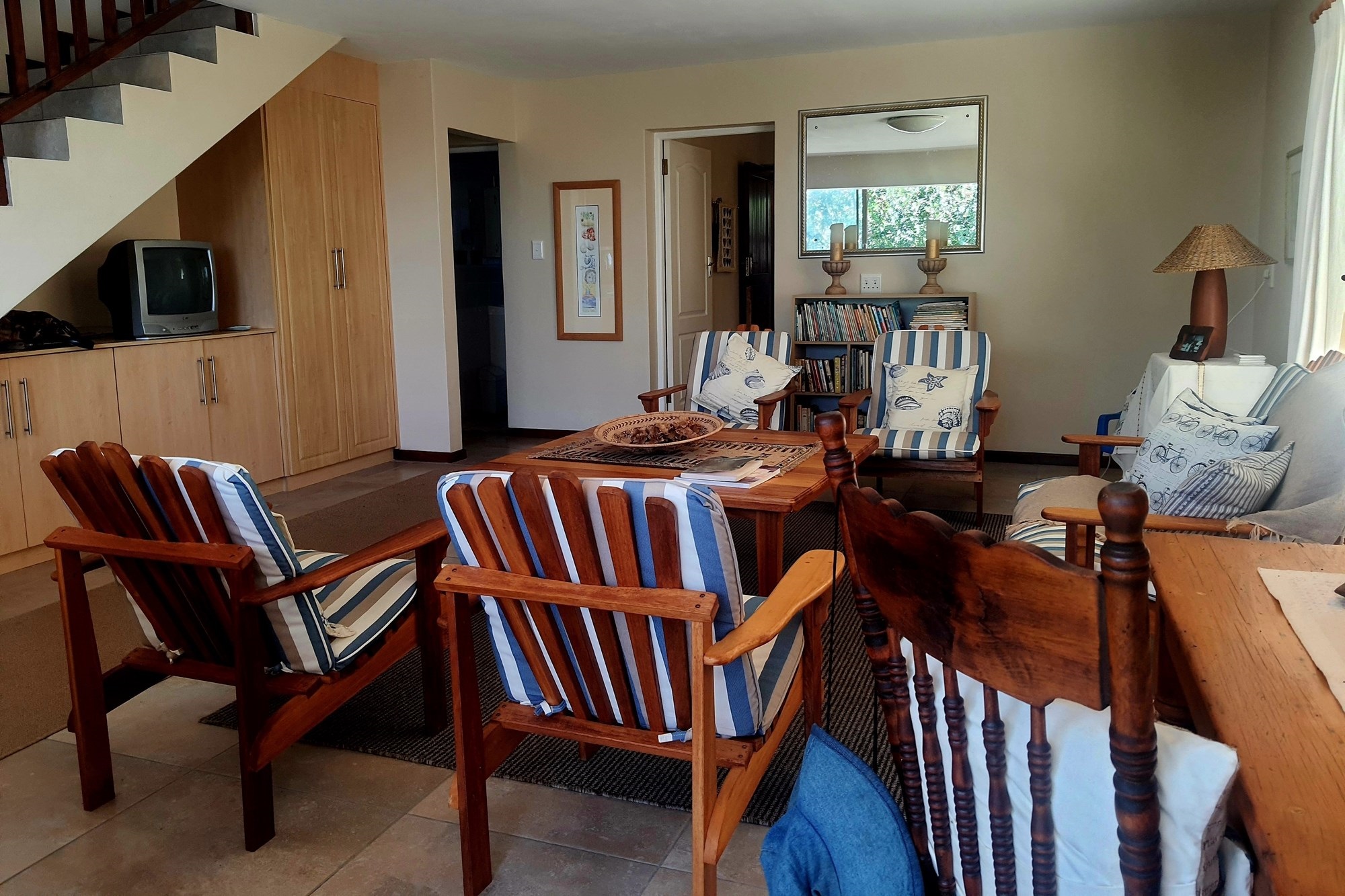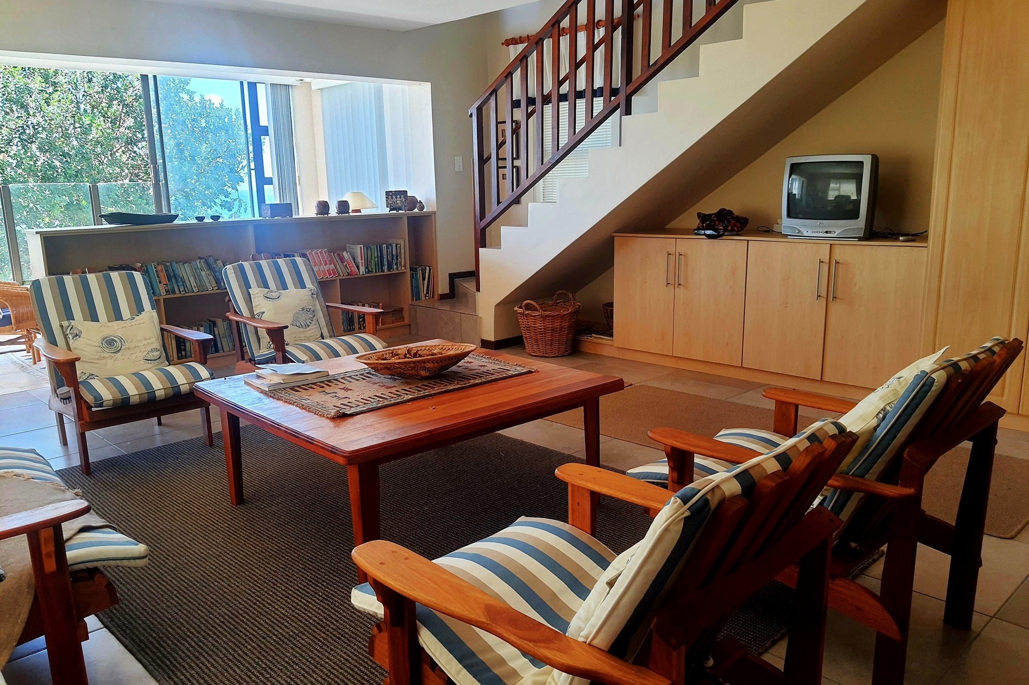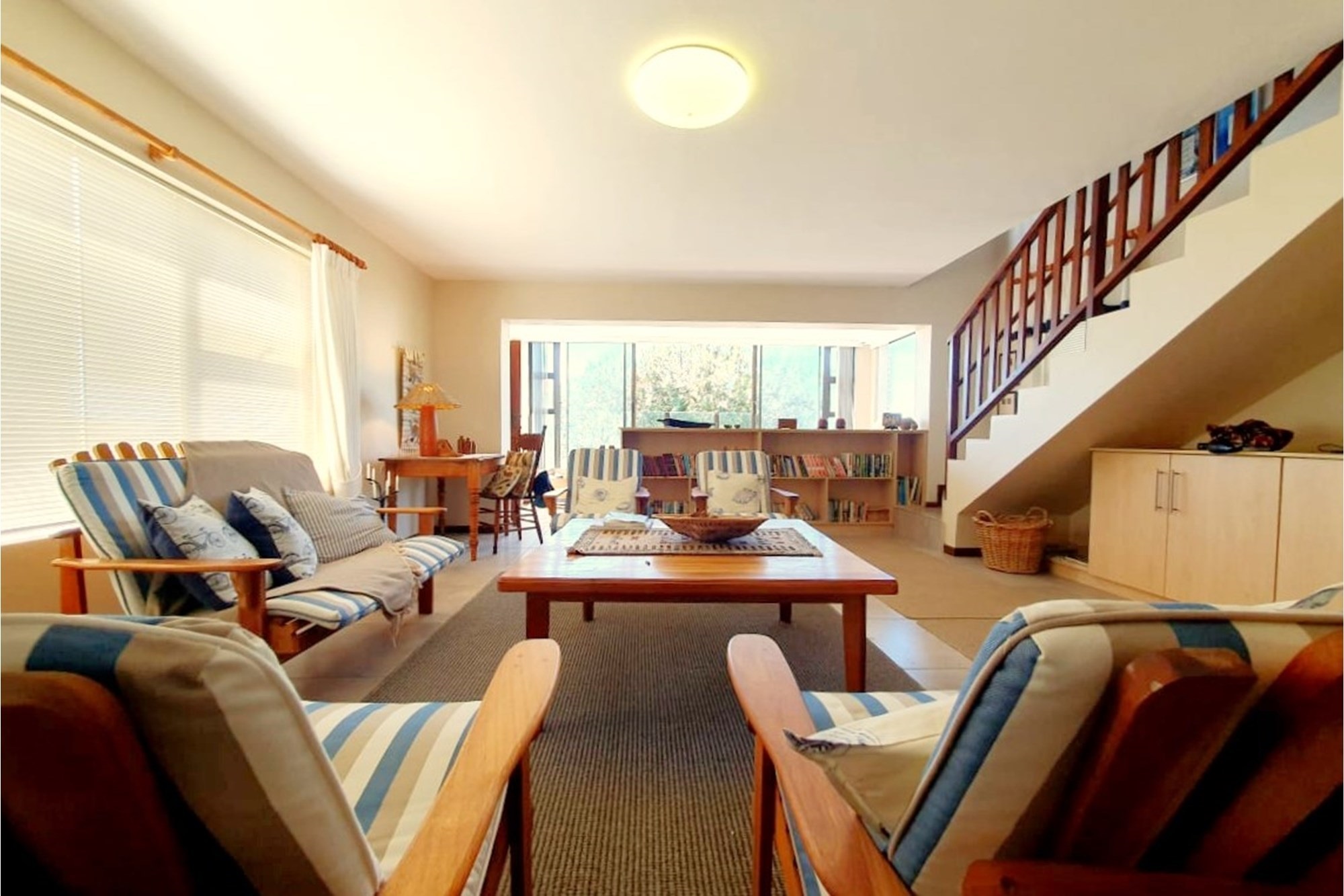 As you step inside, an enclosed stoep welcomes you with sunlight streaming through large sliding windows. This serene space invites you to relax and enjoy the refreshing sea breeze. Beyond a built-in bookcase, a cozy lounge area offers a quiet retreat, while cleverly designed under-stair storage maximizes space.