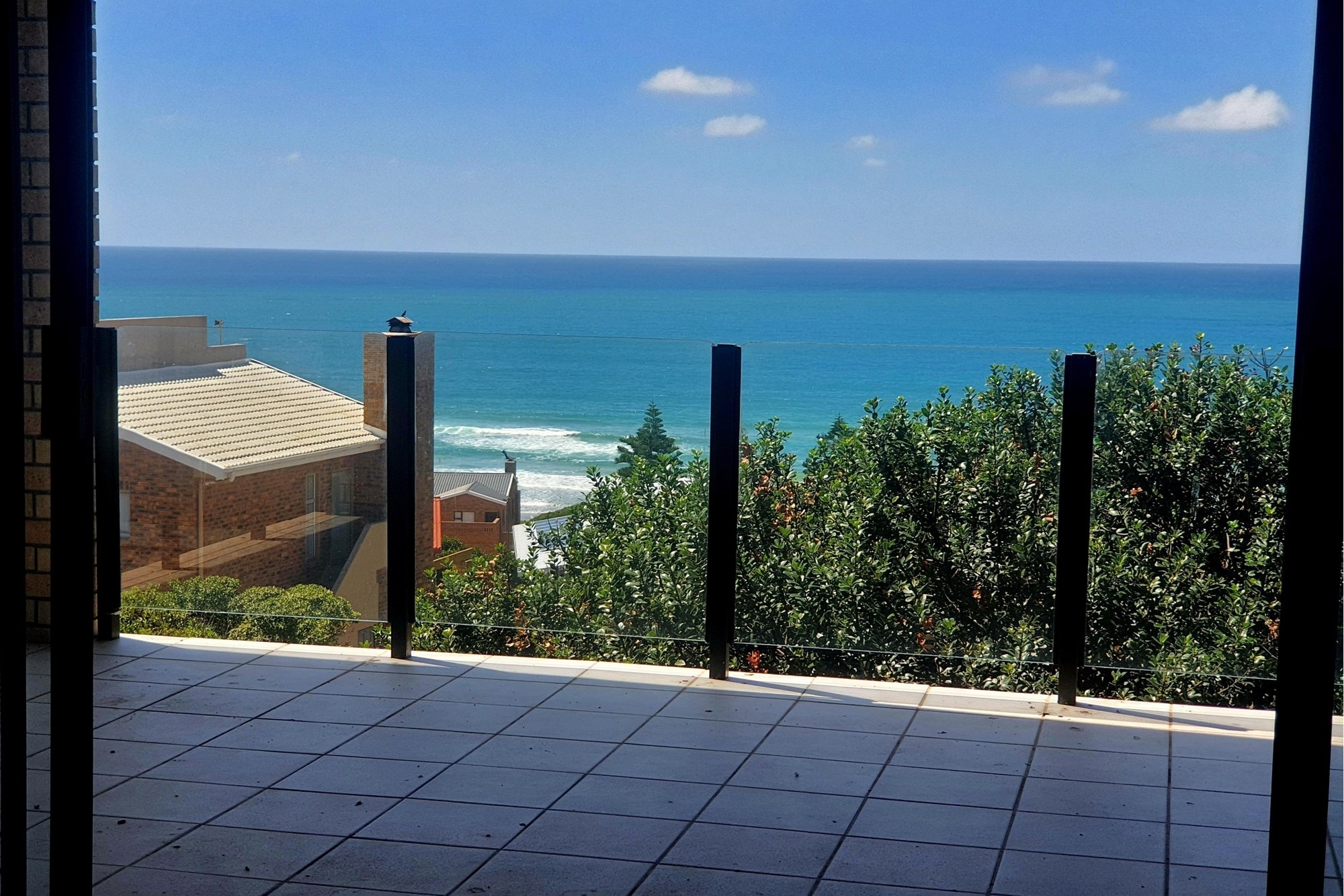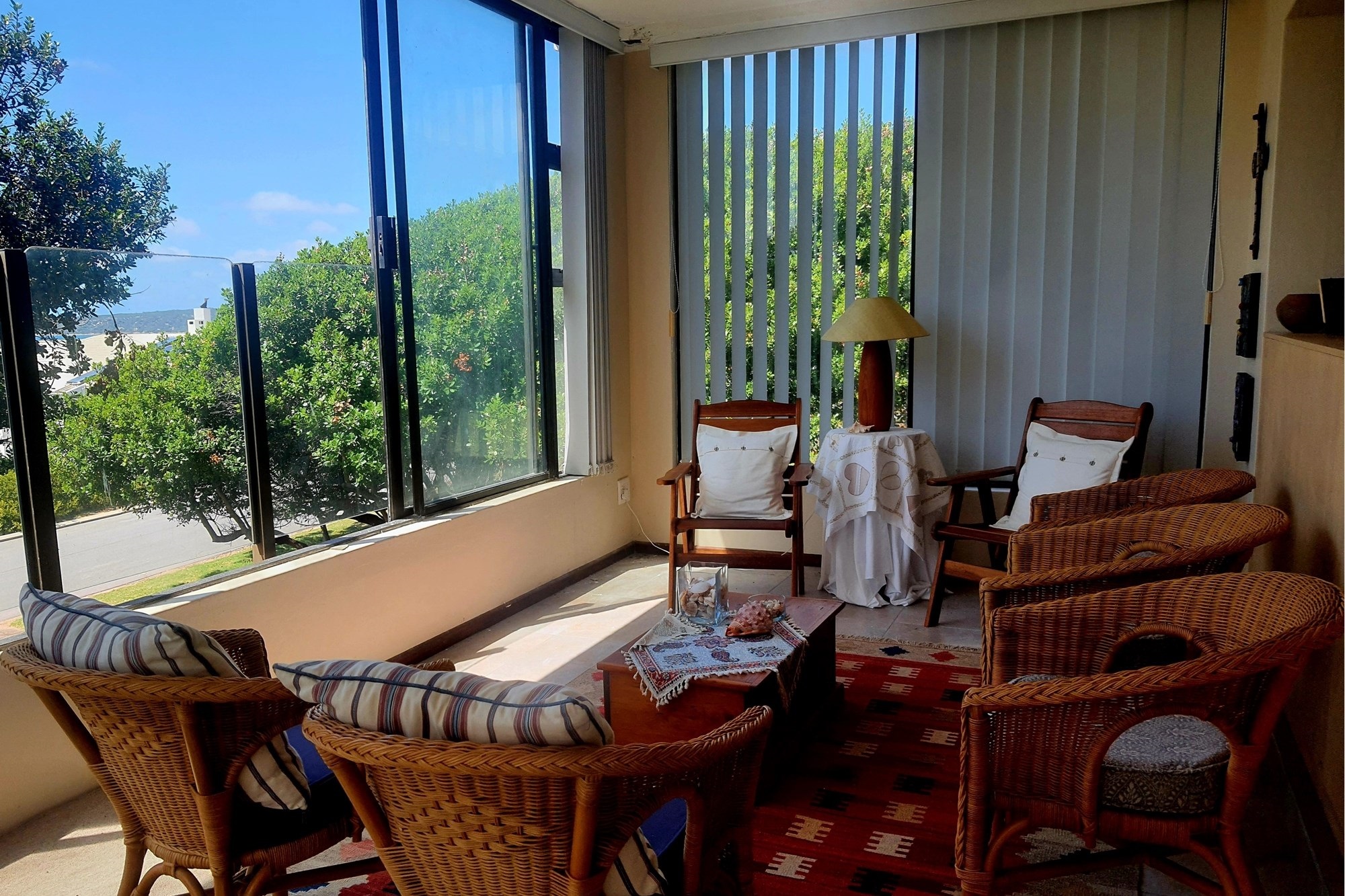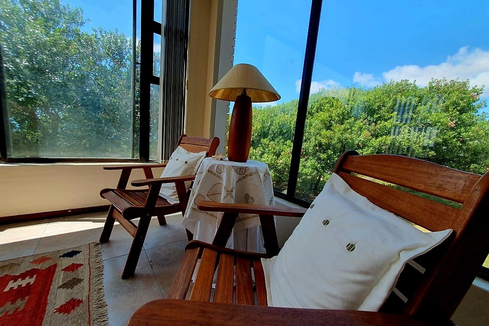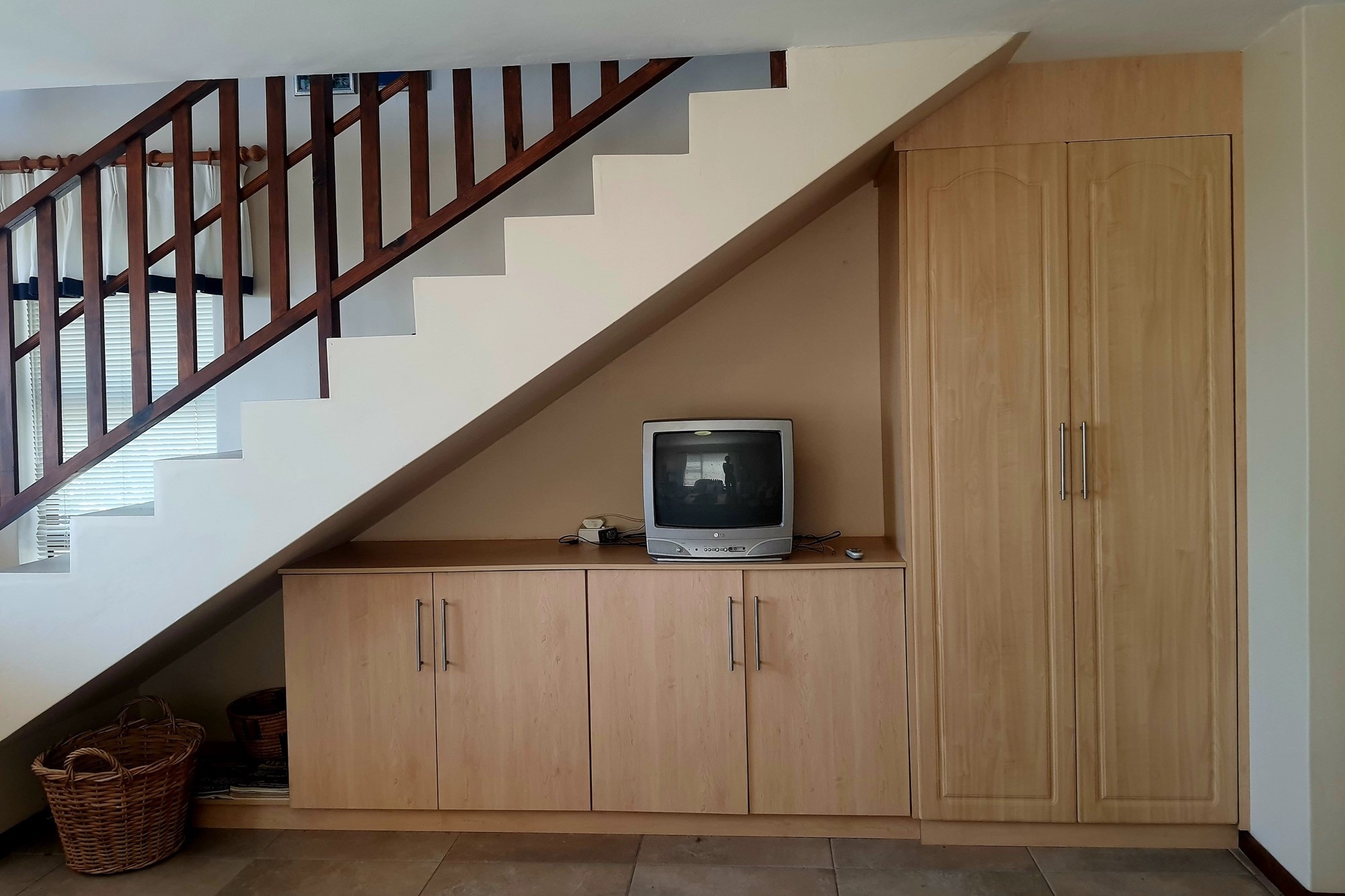 As you step inside, an enclosed stoep welcomes you with sunlight streaming through large sliding windows. This serene space invites you to relax and enjoy the refreshing sea breeze. Beyond a built-in bookcase, a cozy lounge area offers a quiet retreat, while cleverly designed under-stair storage maximizes space.