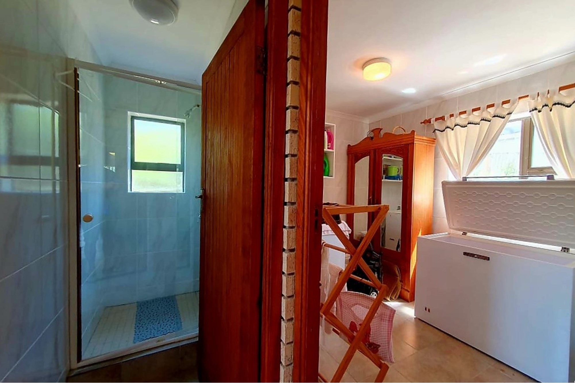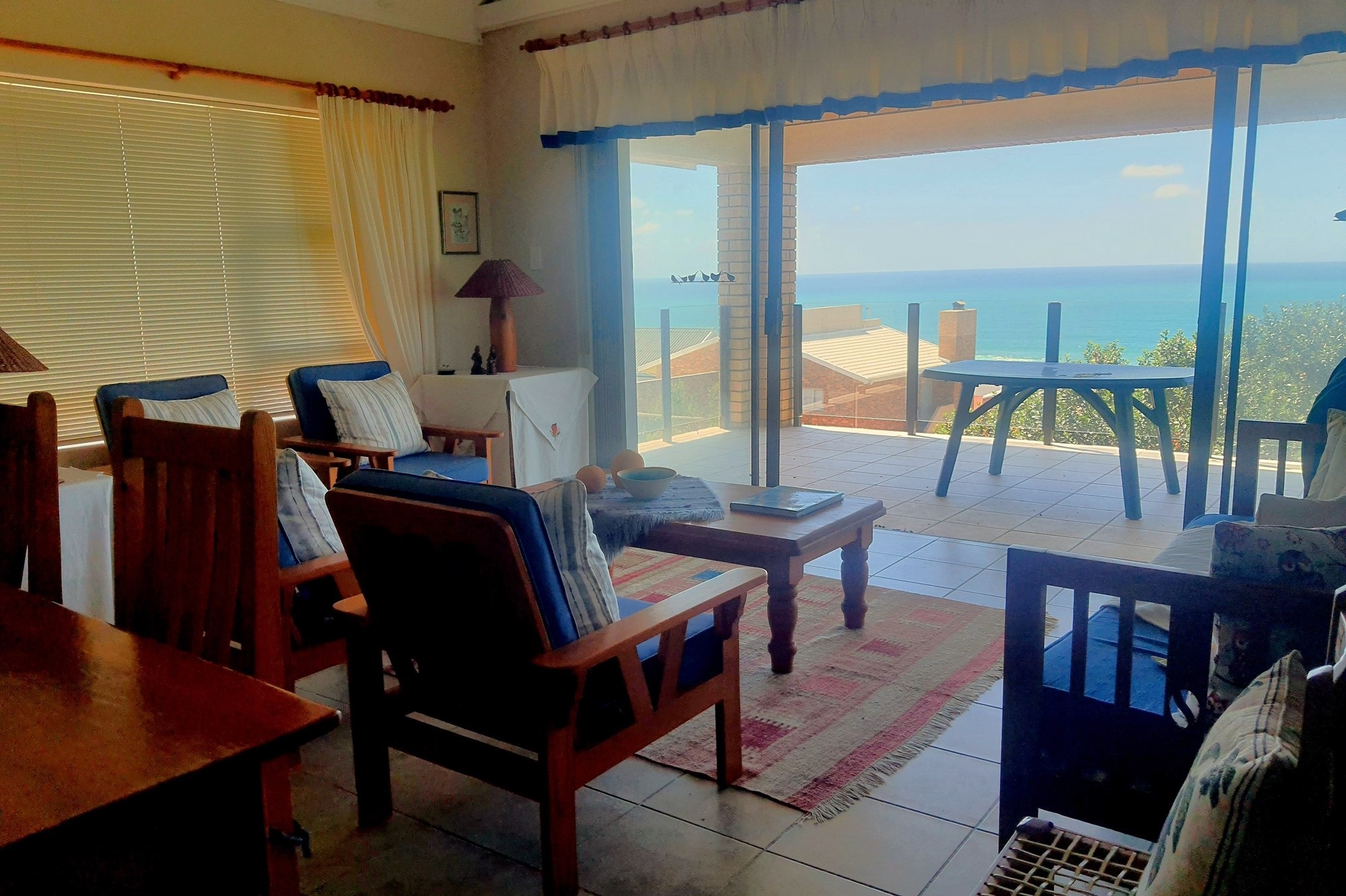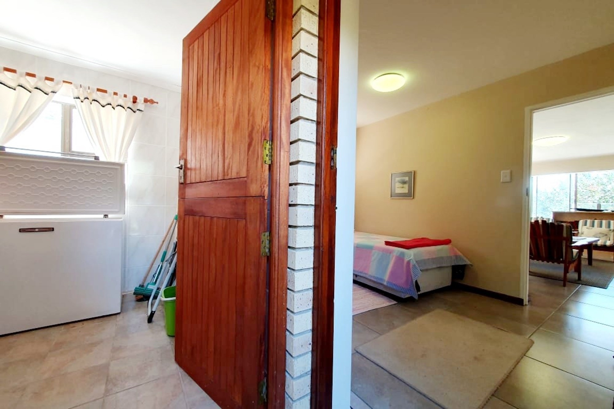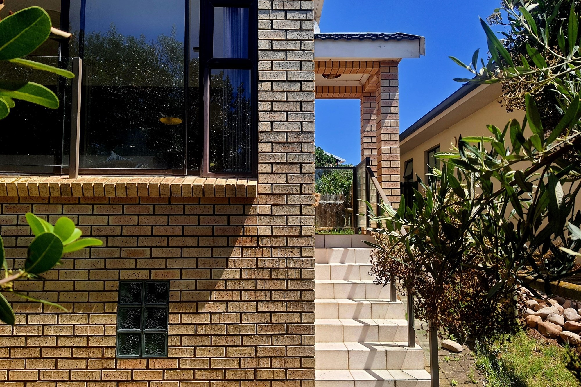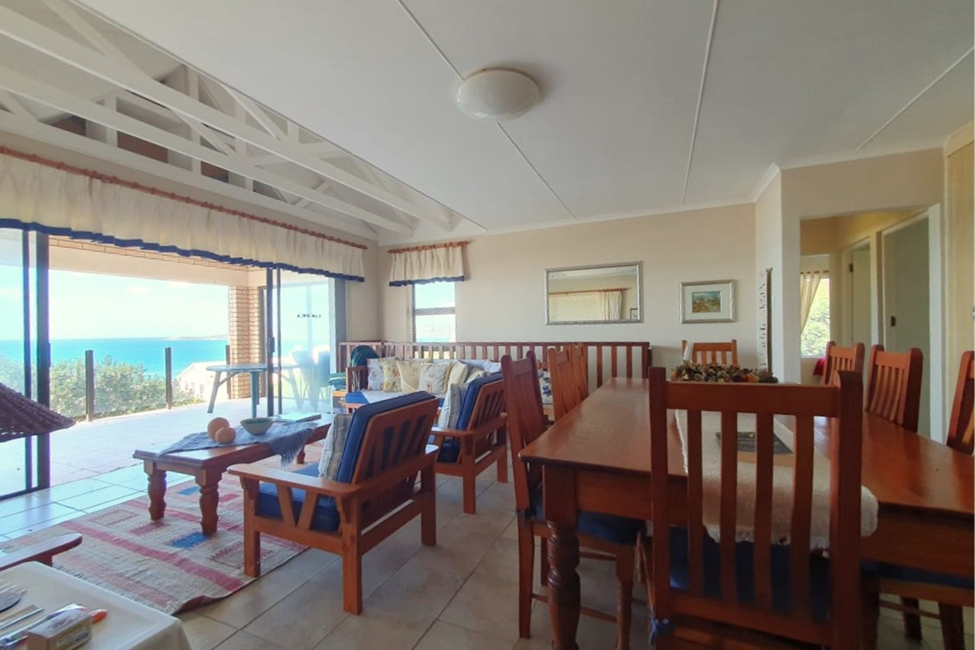 As you step inside, an enclosed stoep welcomes you with sunlight streaming through large sliding windows. This serene space invites you to relax and enjoy the refreshing sea breeze. Beyond a built-in bookcase, a cozy lounge area offers a quiet retreat, while cleverly designed under-stair storage maximizes space.