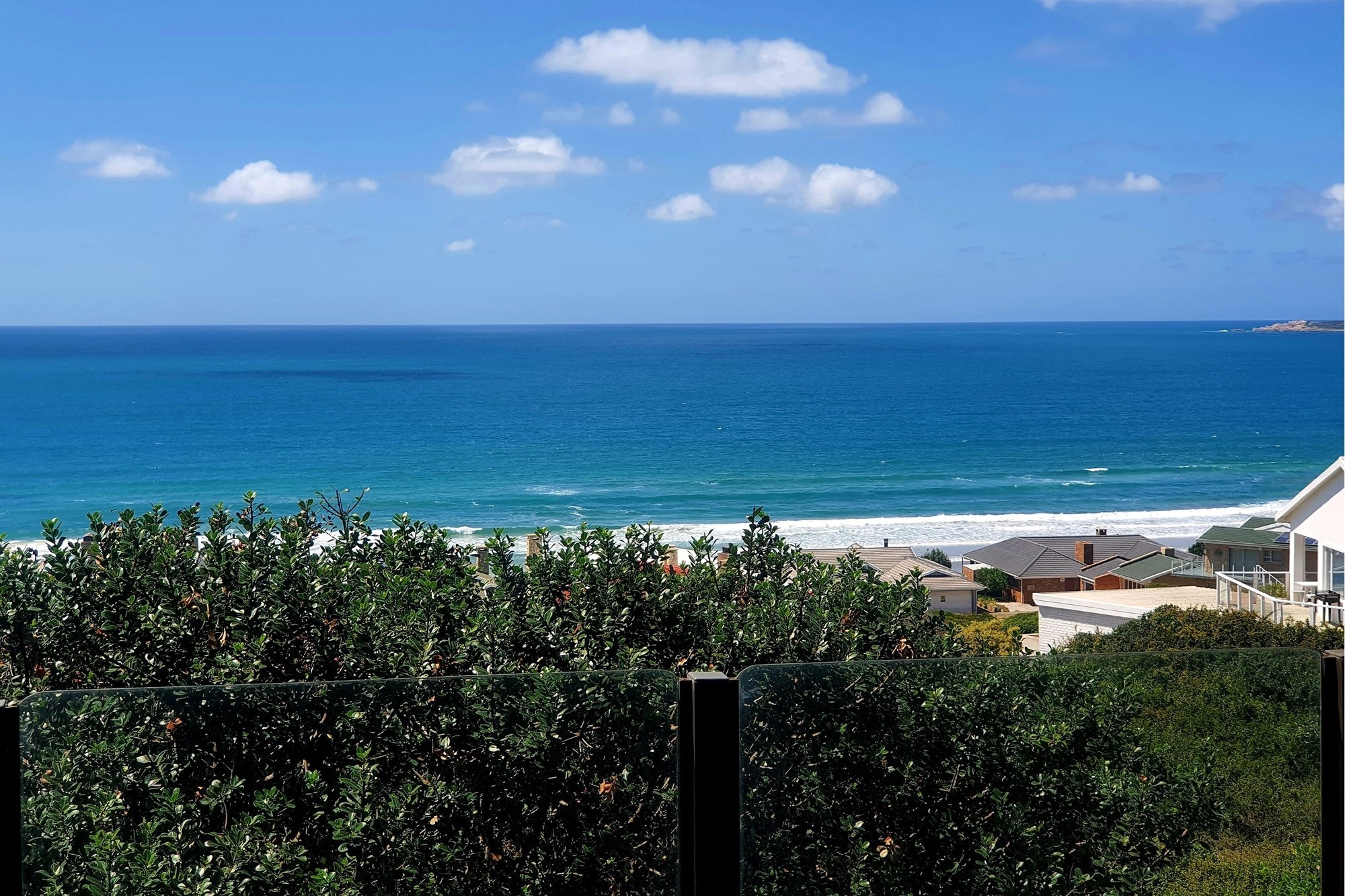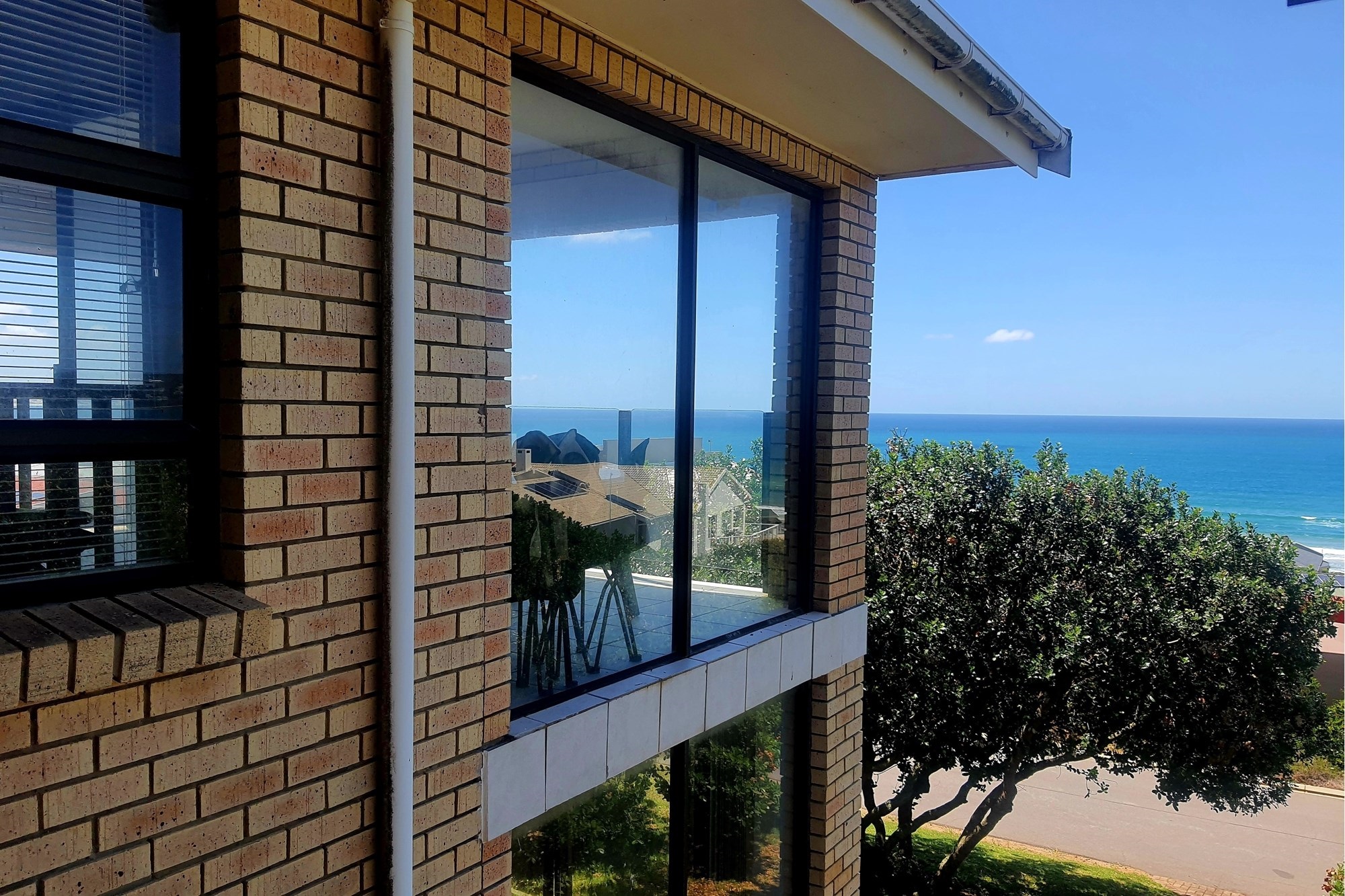 Ascending the staircase, the home opens up to an inviting and light-filled upper level. Here, an expansive open-plan living area seamlessly combines a dining space, an indoor braai, and a second lounge—perfect for entertaining or unwinding. Glass doors open onto a spacious, covered balcony, offering a breathtaking 180-degree view and the perfect spot to take in stunning sunrises.