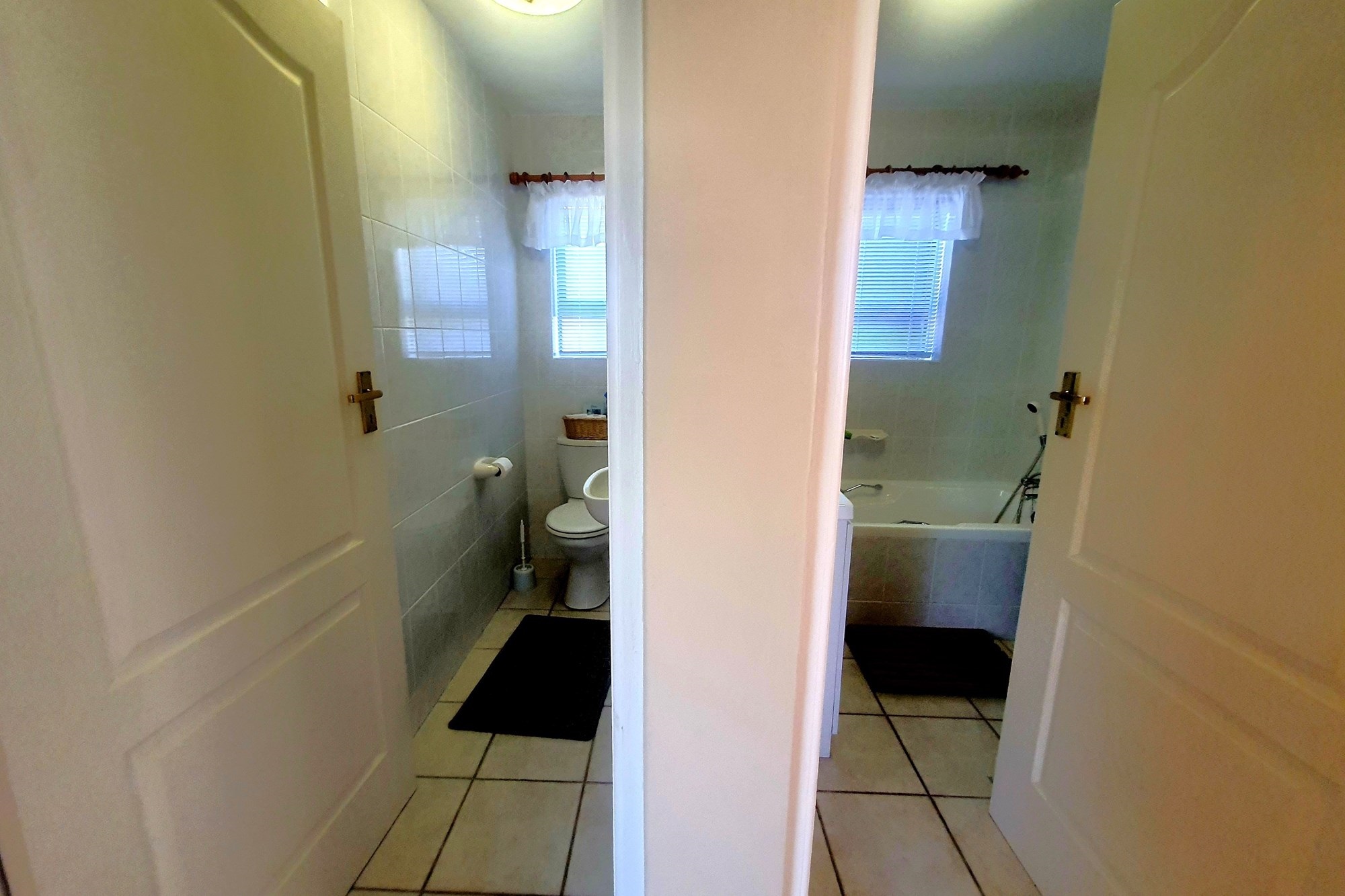 Adjacent to the lounge, a small bedroom with a basin—ideal as a study or creative space—connects to a single shower room and a spacious laundry area. From here, you have direct access to the back garden, a secluded haven for enjoying the outdoors. Two generously sized bedrooms on this level share a full bathroom with a bath, shower, and a separate toilet for added convenience.