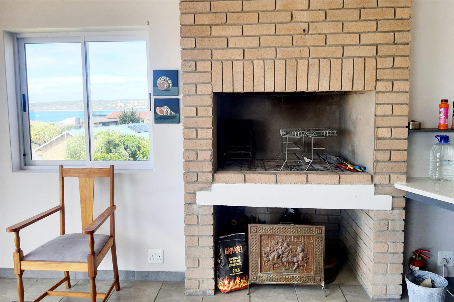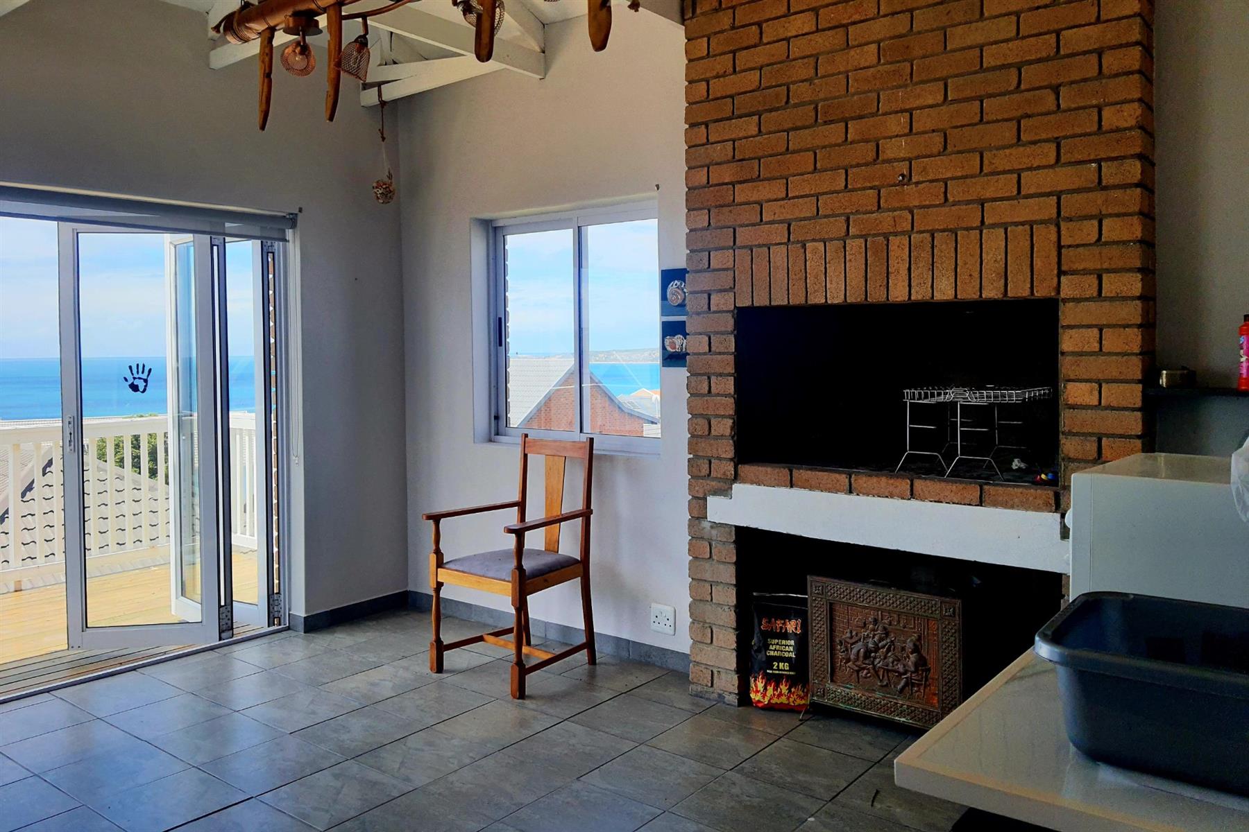 The true showpiece is found upstairs: a dedicated braai room that flows seamlessly onto an expansive entertainment deck. Here, fold-away doors open wide to frame sweeping sea views, creating an unbeatable setting for gatherings that spill from indoors to out. Whether it’s sundowners with friends or quiet mornings with the horizon as your backdrop, this space defines the lifestyle the home was designed for.