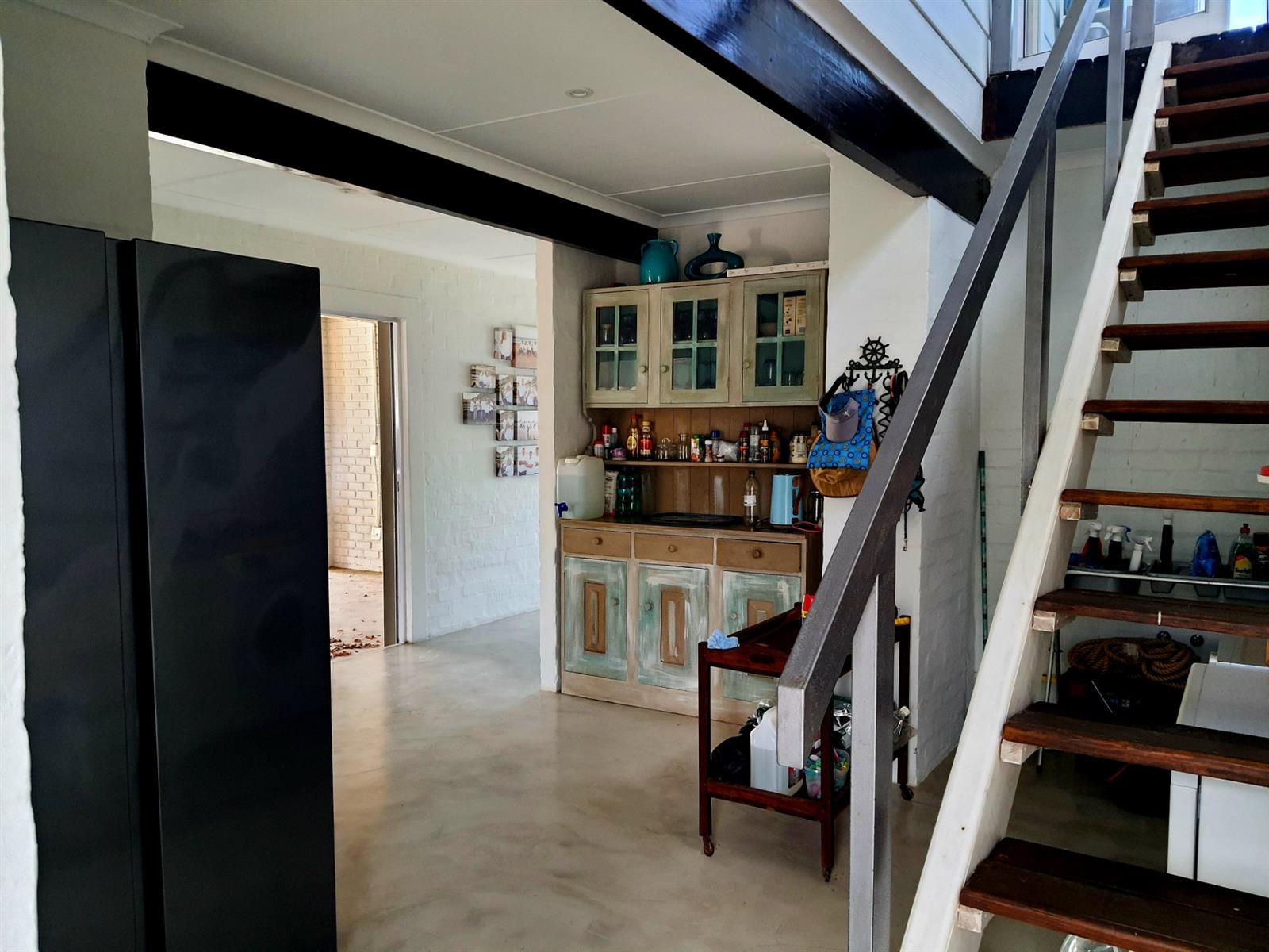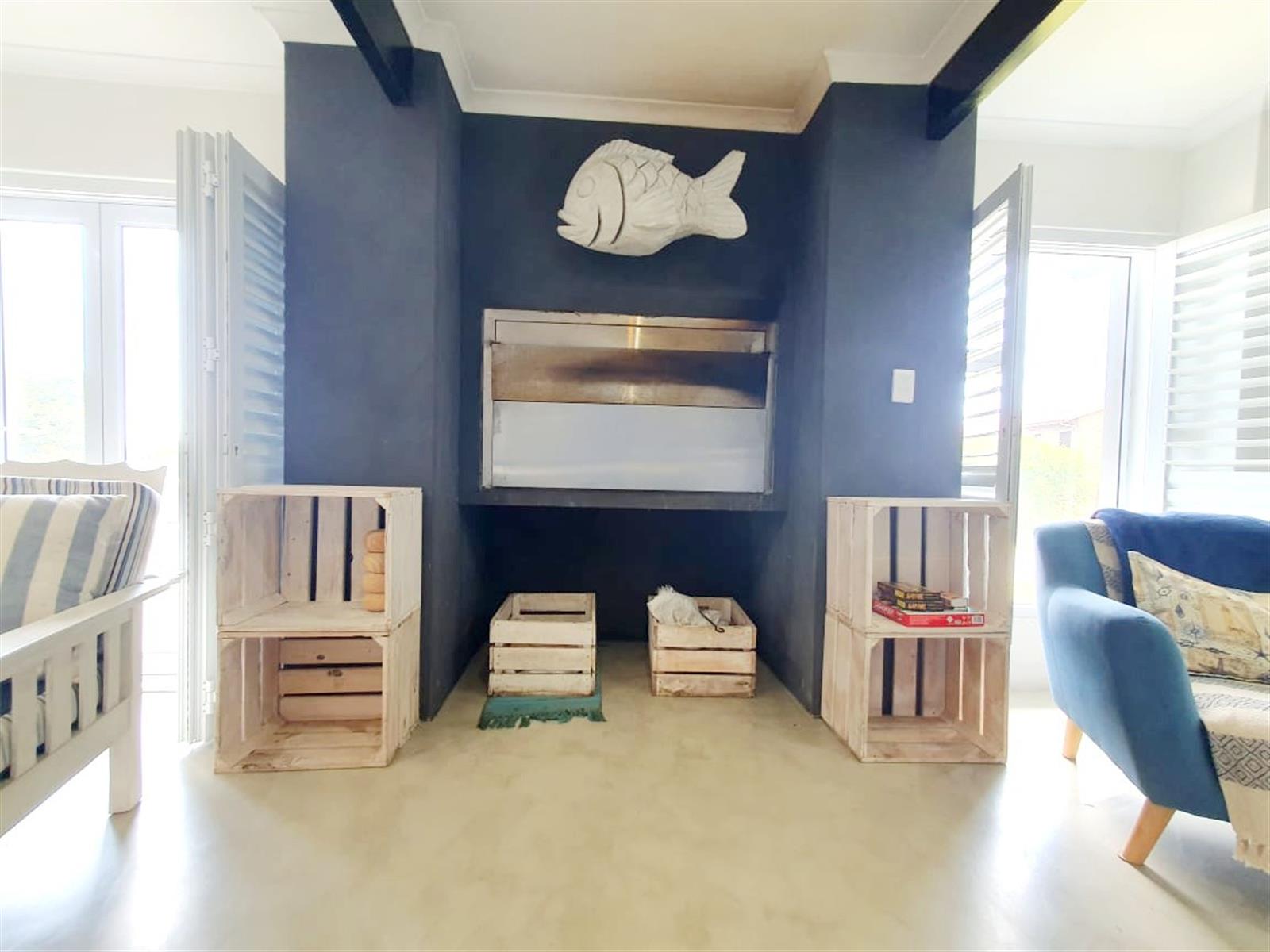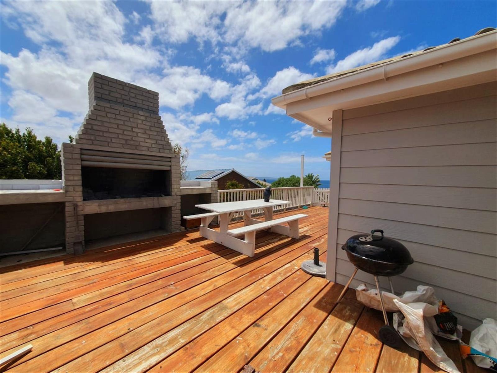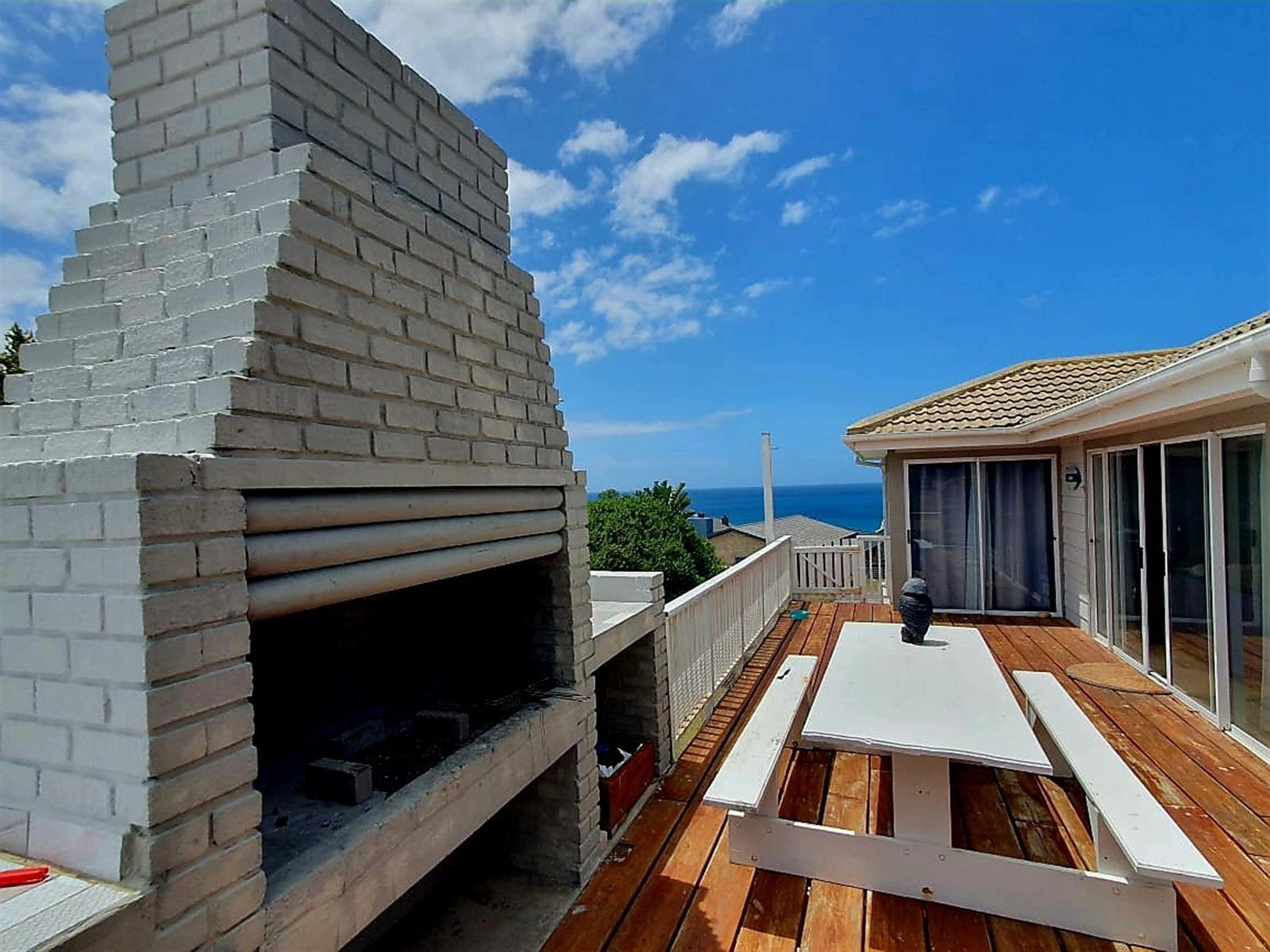 Upstairs, the home truly opens up. Three generously sized bedrooms offer ample space for family and guests, while the main kitchen — featuring a charming breakfast nook — connects seamlessly to a spacious central living room. Large doors flow out to a sheltered patio with a built-in braai, where beautiful views create the perfect backdrop for long, lazy afternoons and sunset entertaining.