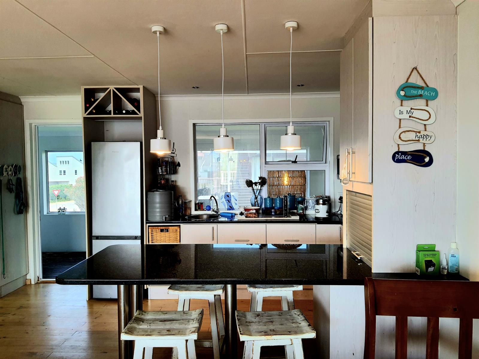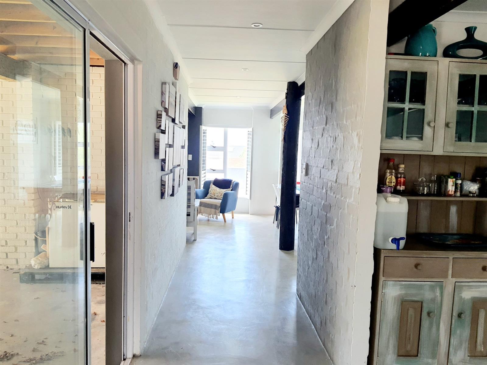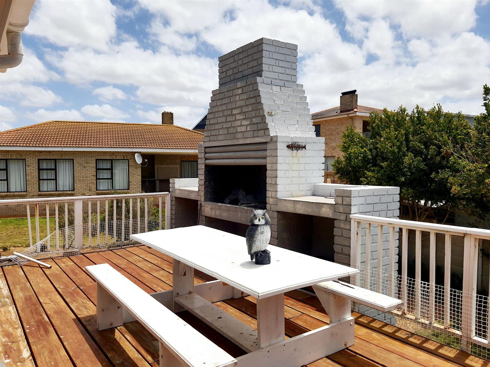 Upstairs, the home truly opens up. Three generously sized bedrooms offer ample space for family and guests, while the main kitchen — featuring a charming breakfast nook — connects seamlessly to a spacious central living room. Large doors flow out to a sheltered patio with a built-in braai, where beautiful views create the perfect backdrop for long, lazy afternoons and sunset entertaining.