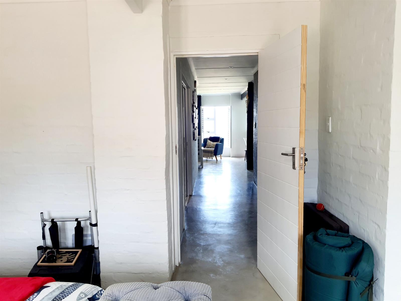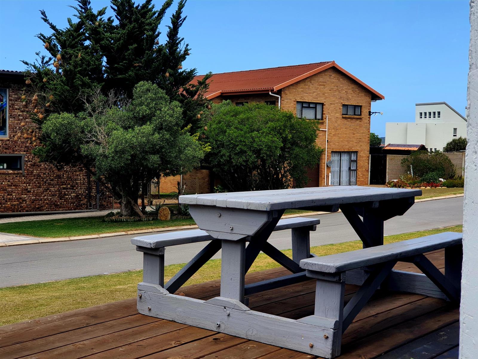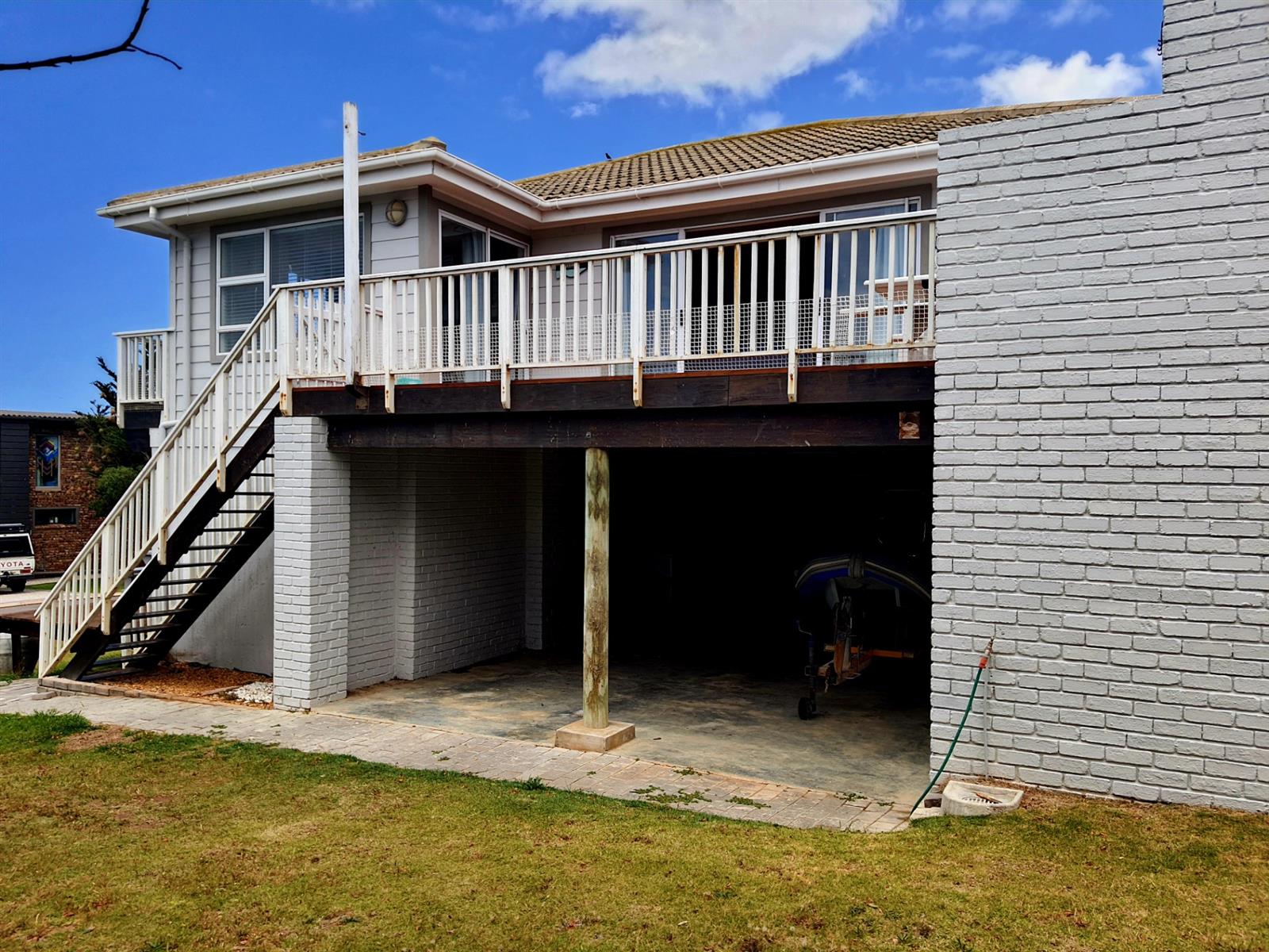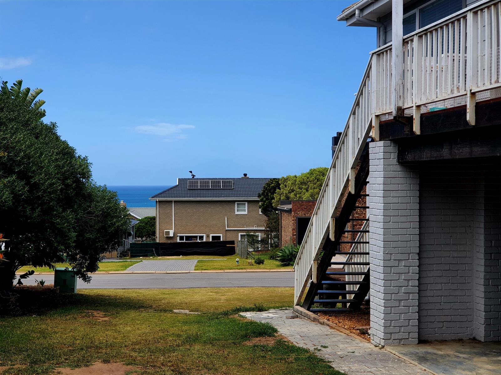 Upstairs, the home truly opens up. Three generously sized bedrooms offer ample space for family and guests, while the main kitchen — featuring a charming breakfast nook — connects seamlessly to a spacious central living room. Large doors flow out to a sheltered patio with a built-in braai, where beautiful views create the perfect backdrop for long, lazy afternoons and sunset entertaining.
