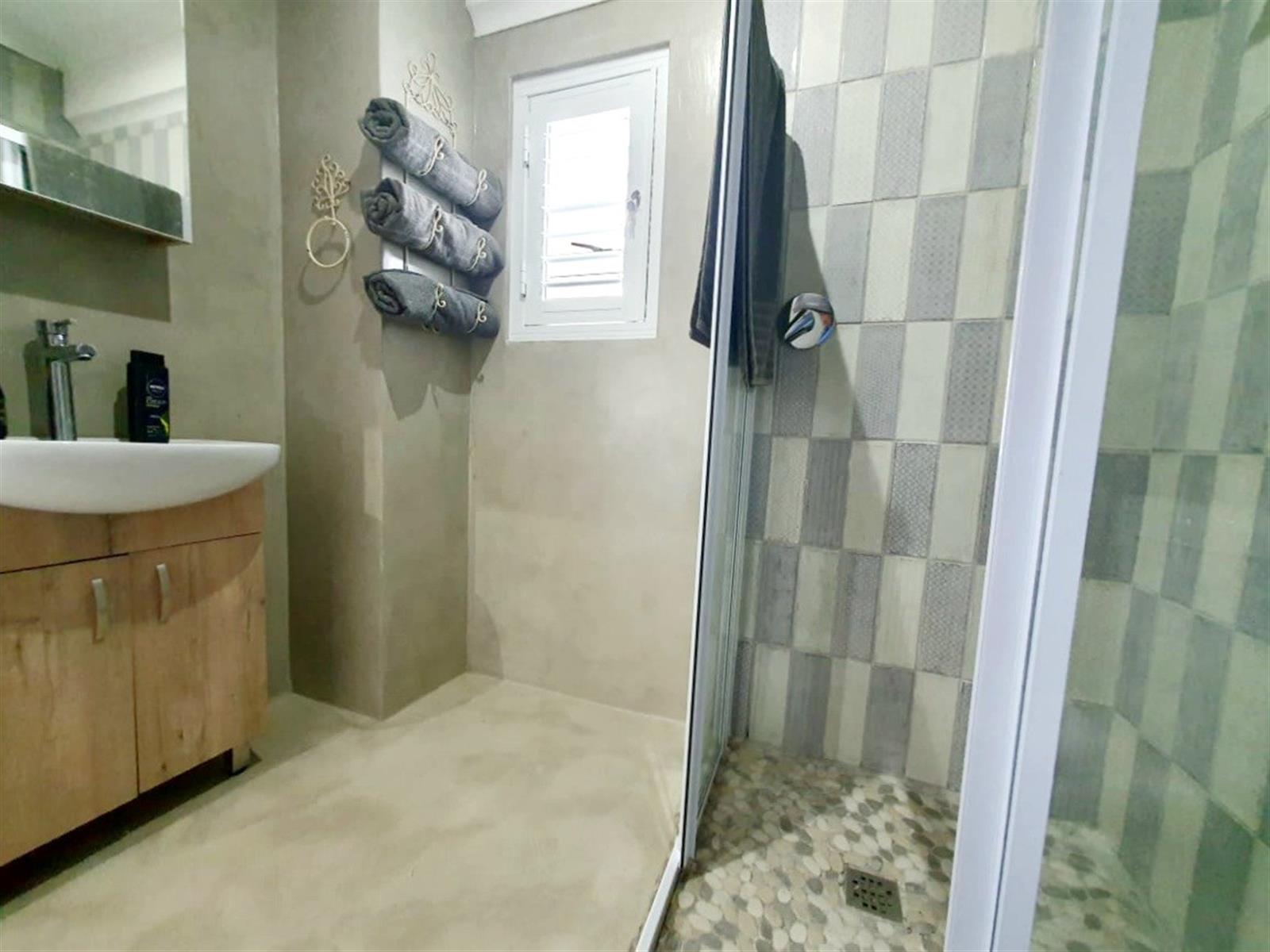 The ground floor welcomes you with a practical, well-equipped kitchenette, a comfortable en-suite bedroom, and an inviting open-plan dining and living area anchored by a built-in braai — ideal for relaxed gatherings. A convenient guest bathroom completes this level.