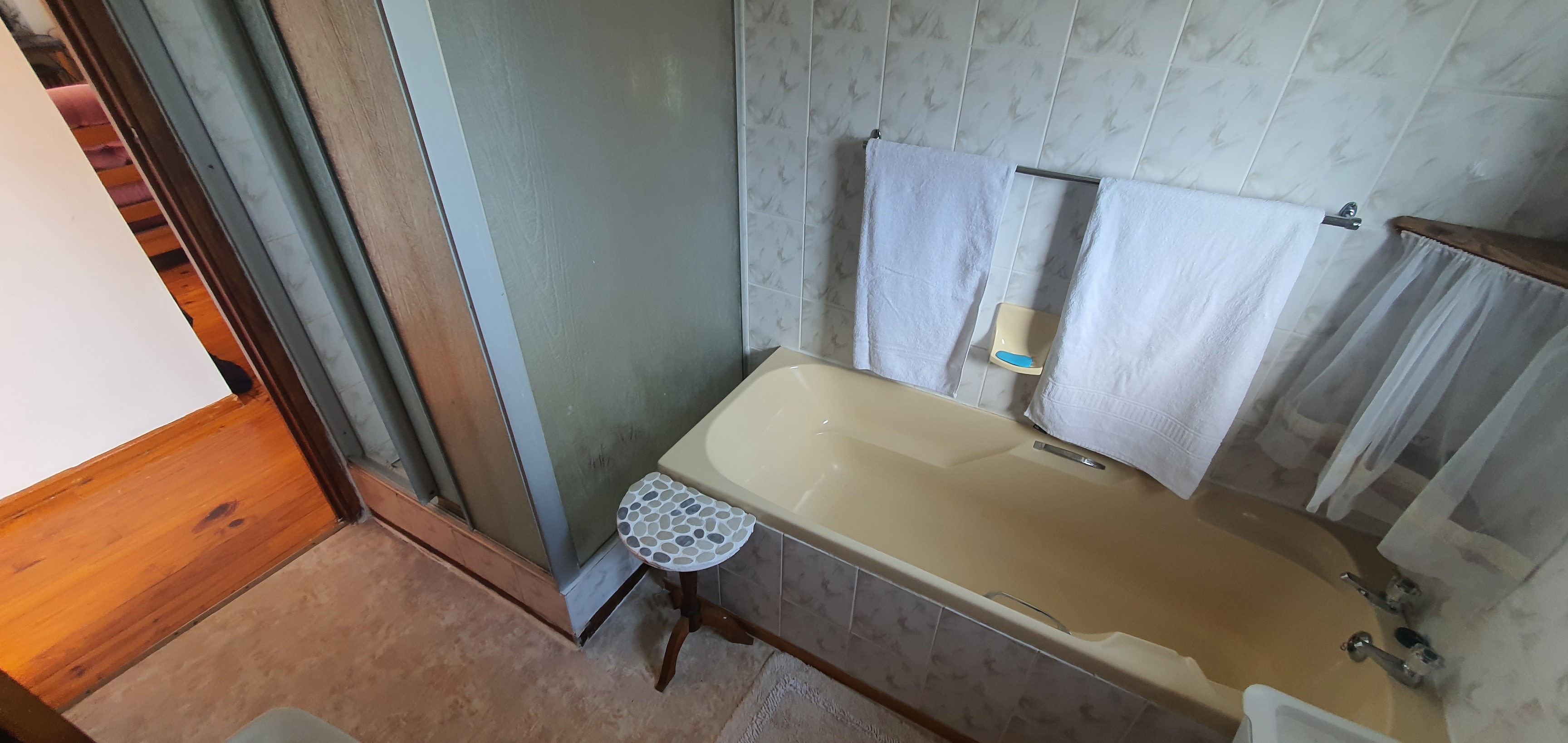 Classic Wooden home on a great big lot, views of the ocean and 5min walk from the beach in the sought after little town of Boggom's Bay. Upper level has the main living area and decks on two sides, kitchen main bathroom, main bedroom with built in cupboards and second bedroom. The lower level has a big central area (can be used for 2 vehicles as the garage doors are still fitted) with study/extra bedroom and another bedroom with en suite and laundry area. Seperate single lock up garage.