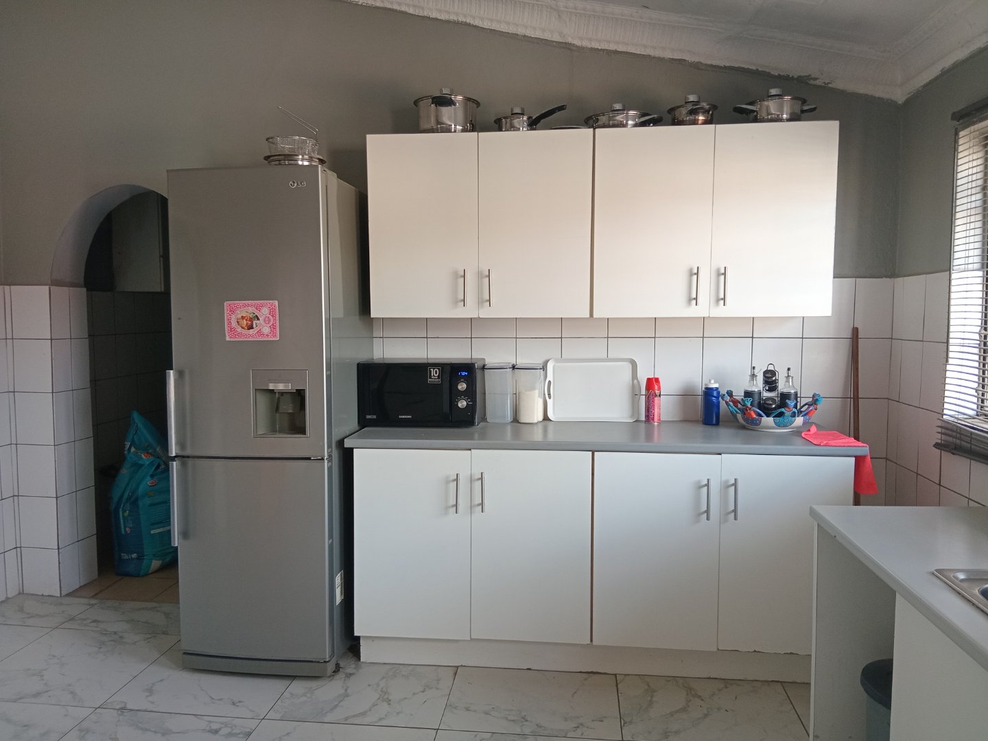 This kitchen is clean, organised, and has a simple, modern feel. Along the main wall, it is a open plan kitchen.The walls are tiled halfway up in white tiles with dark grout, and the upper part of the walls is painted grey. The floor is covered with large white tiles with subtle grey marbling. To the right, there is a window with blinds letting in natural light, which brightens the space.