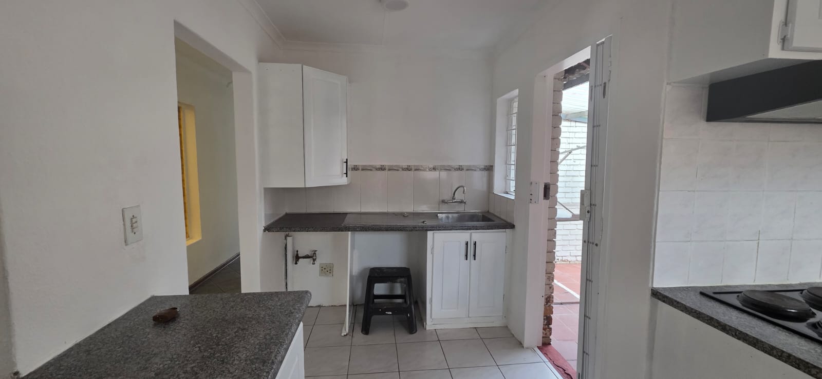 The spacious kitchen offers ample cupboard space, room for three under-counter appliances, a fridge, and comes complete with a built-in oven and four-plate electric stove — everything you need for effortless meal prep and everyday convenience.