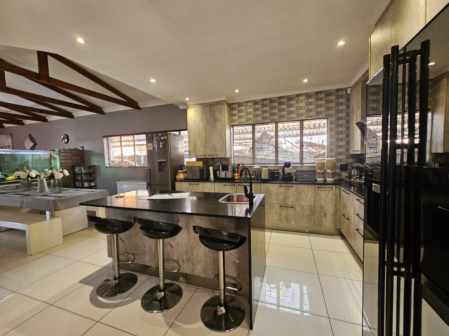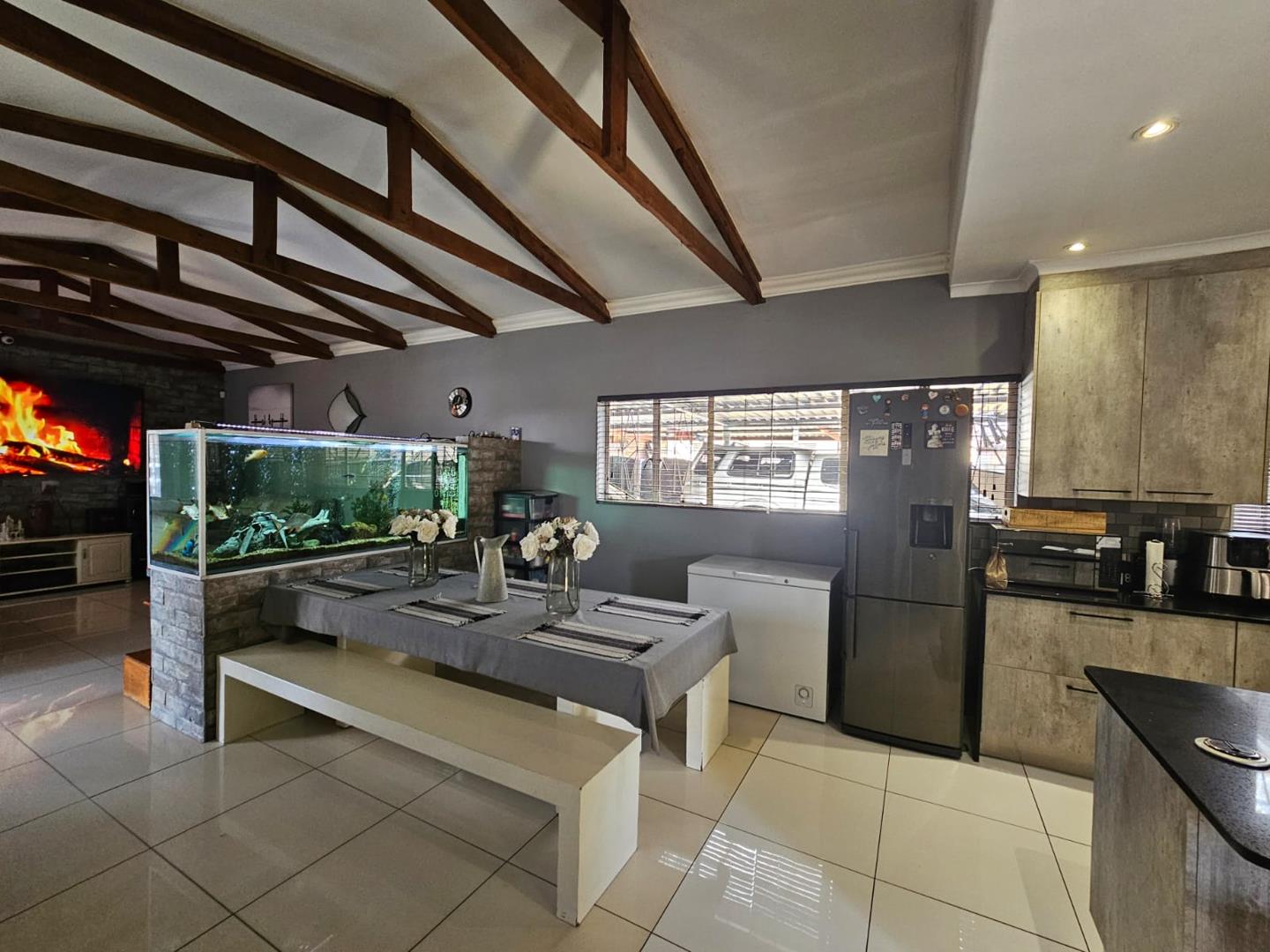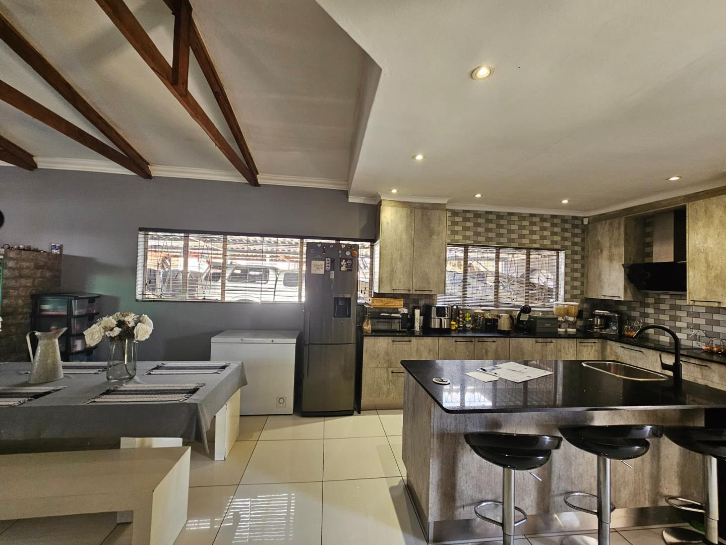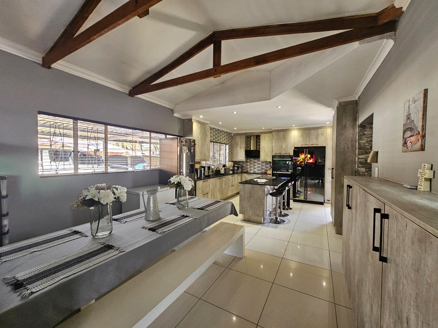 The scullery provides additional space for kitchen tasks. There are three cozy bedrooms and a modern bathroom. Each bedroom includes built-in cupboards (BIC), offering ample storage. The property boasts a large carport with space for six vehicles and two garages for secure parking.