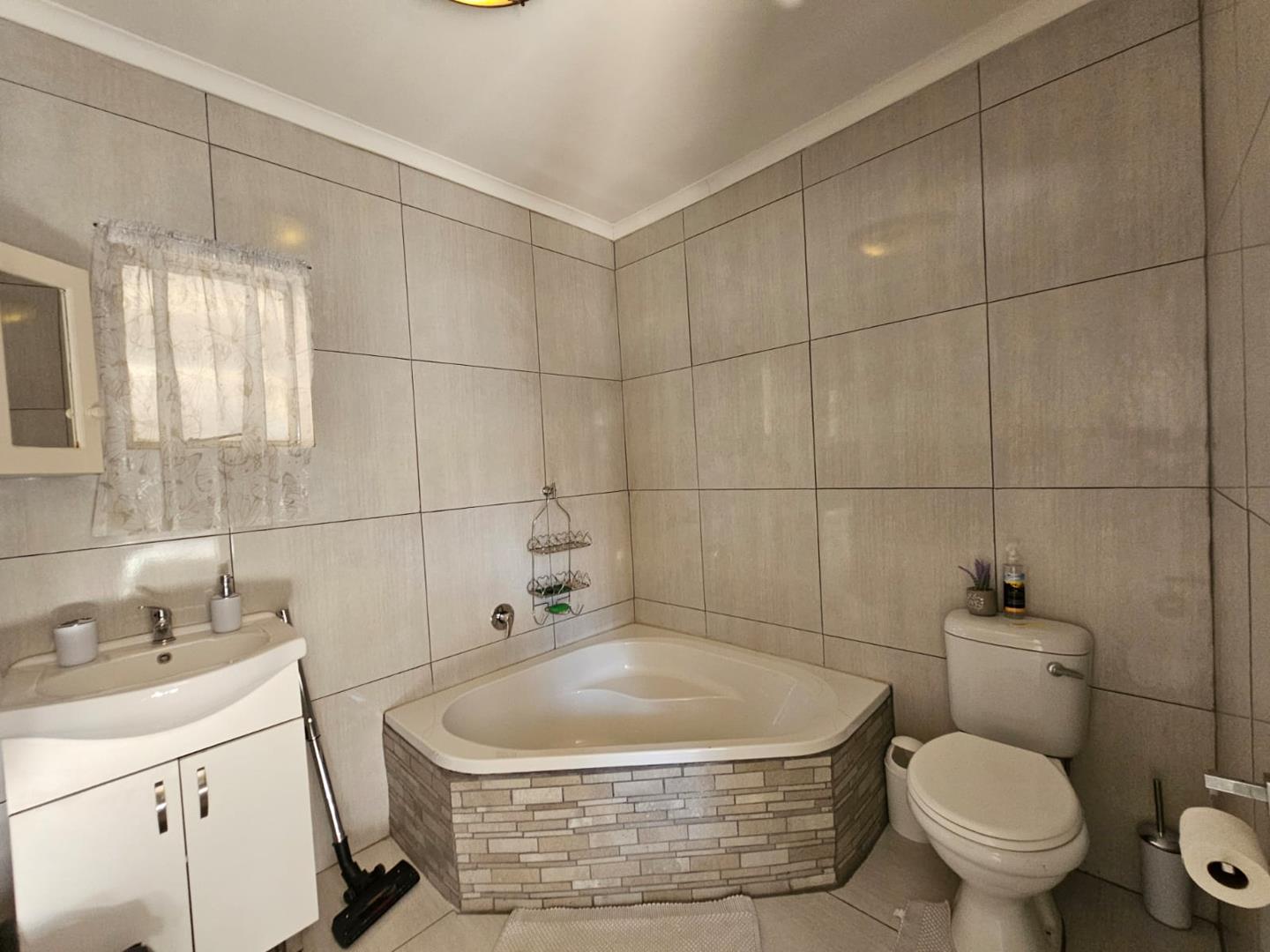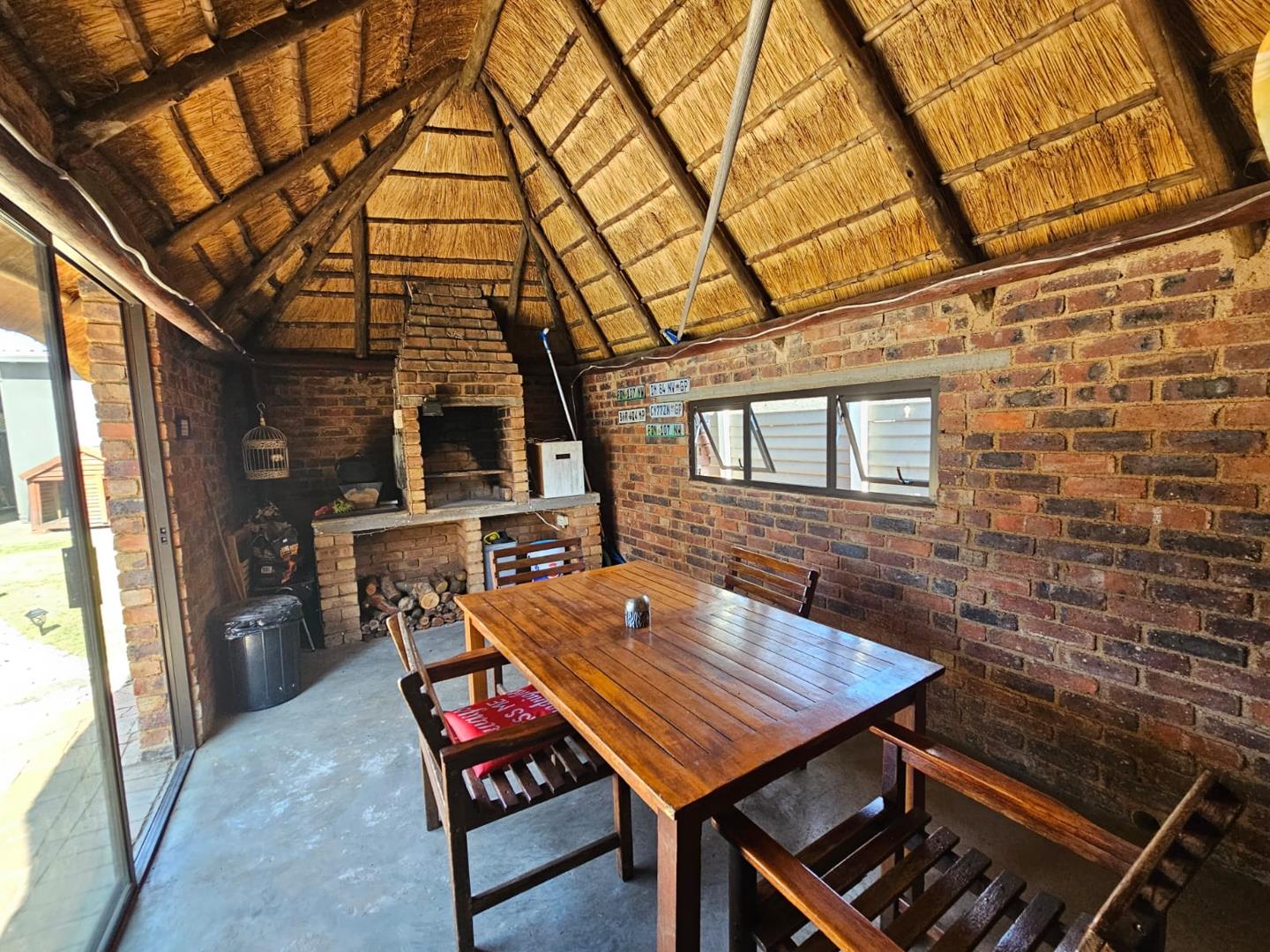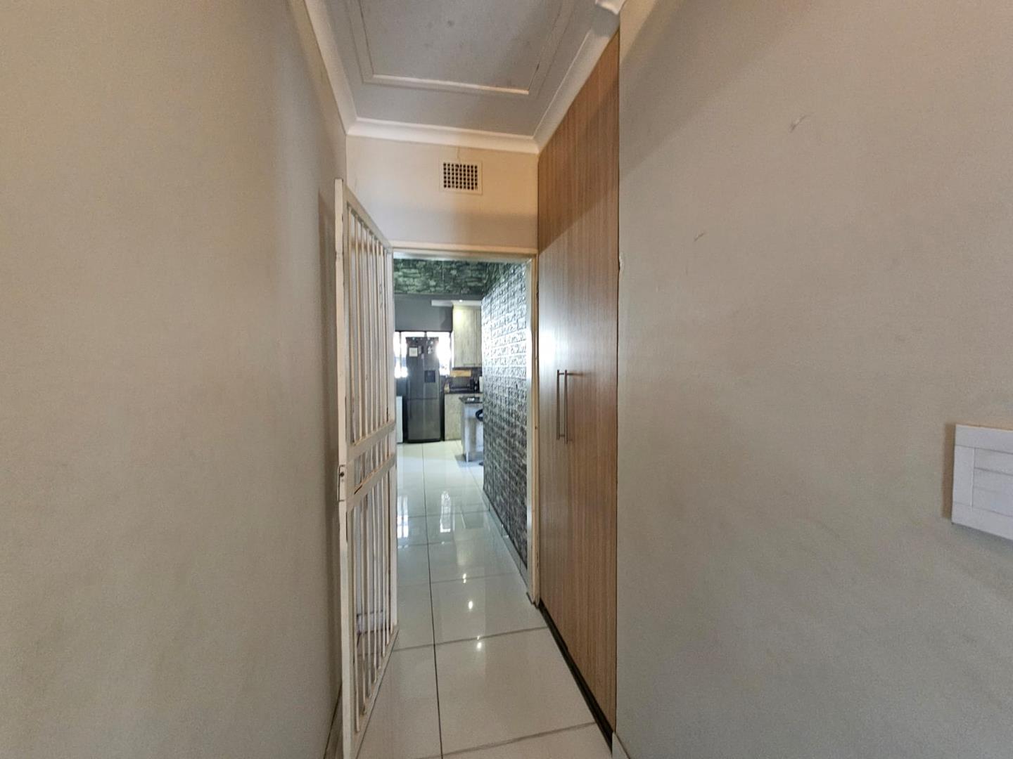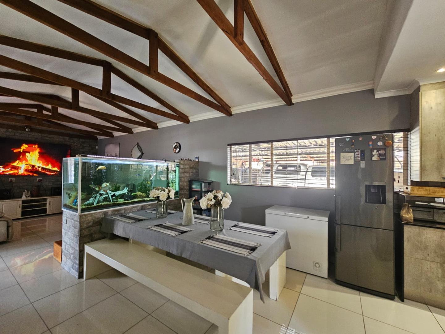 The scullery provides additional space for kitchen tasks. There are three cozy bedrooms and a modern bathroom. Each bedroom includes built-in cupboards (BIC), offering ample storage. The property boasts a large carport with space for six vehicles and two garages for secure parking.