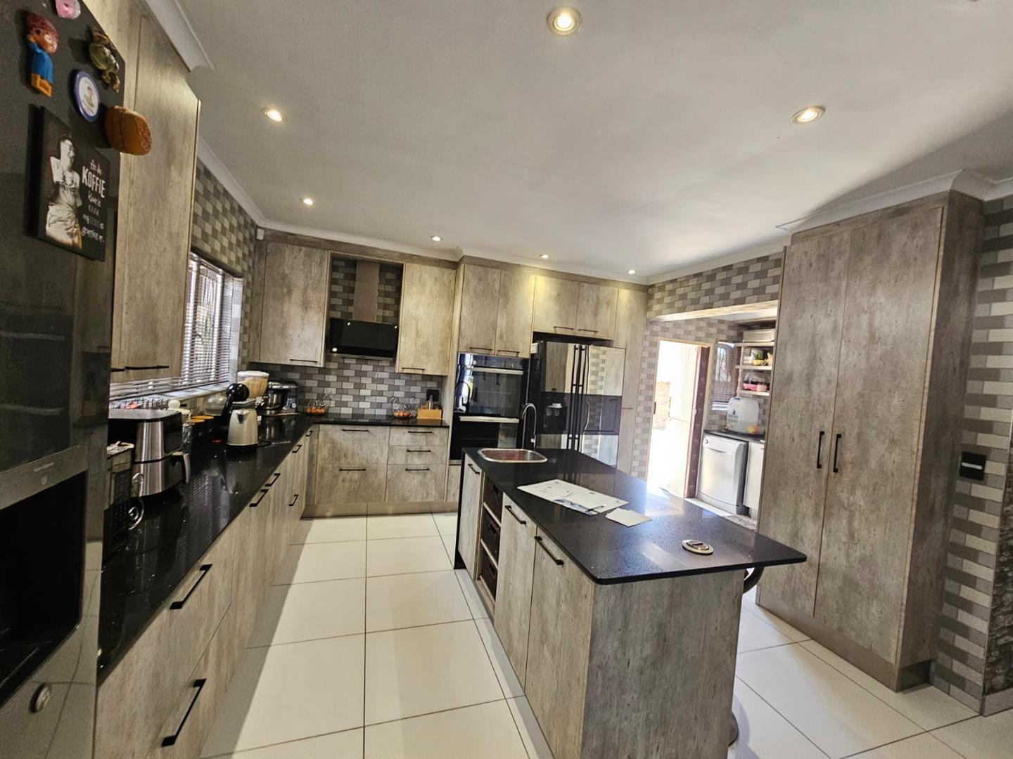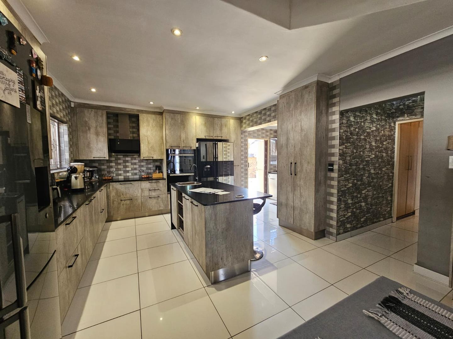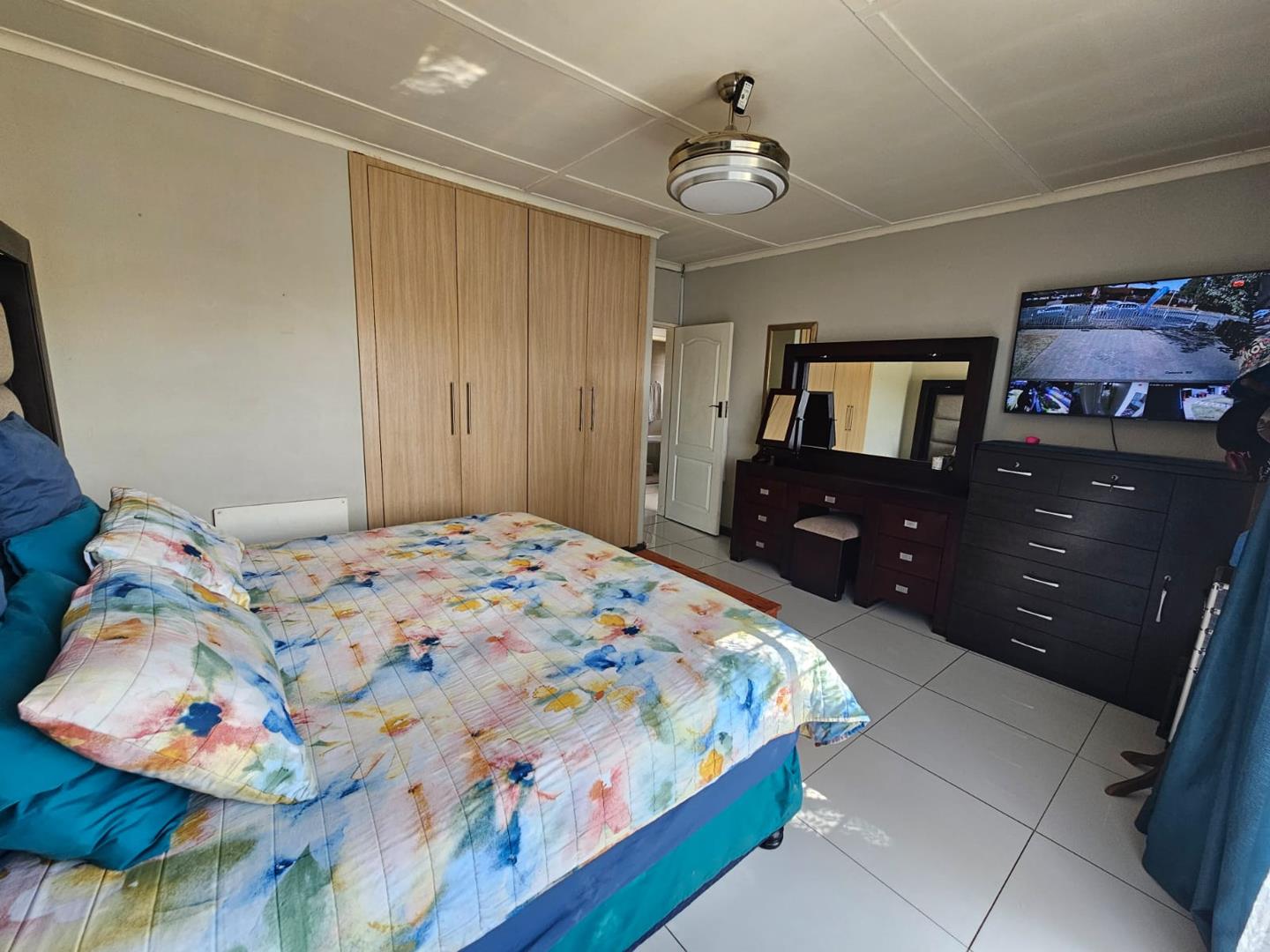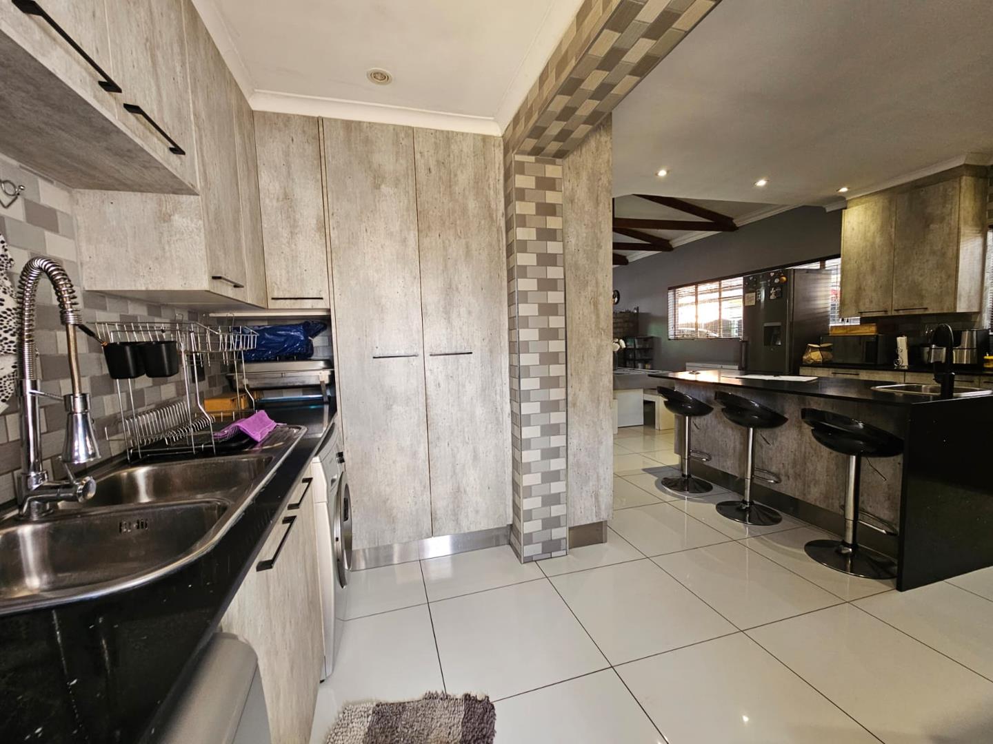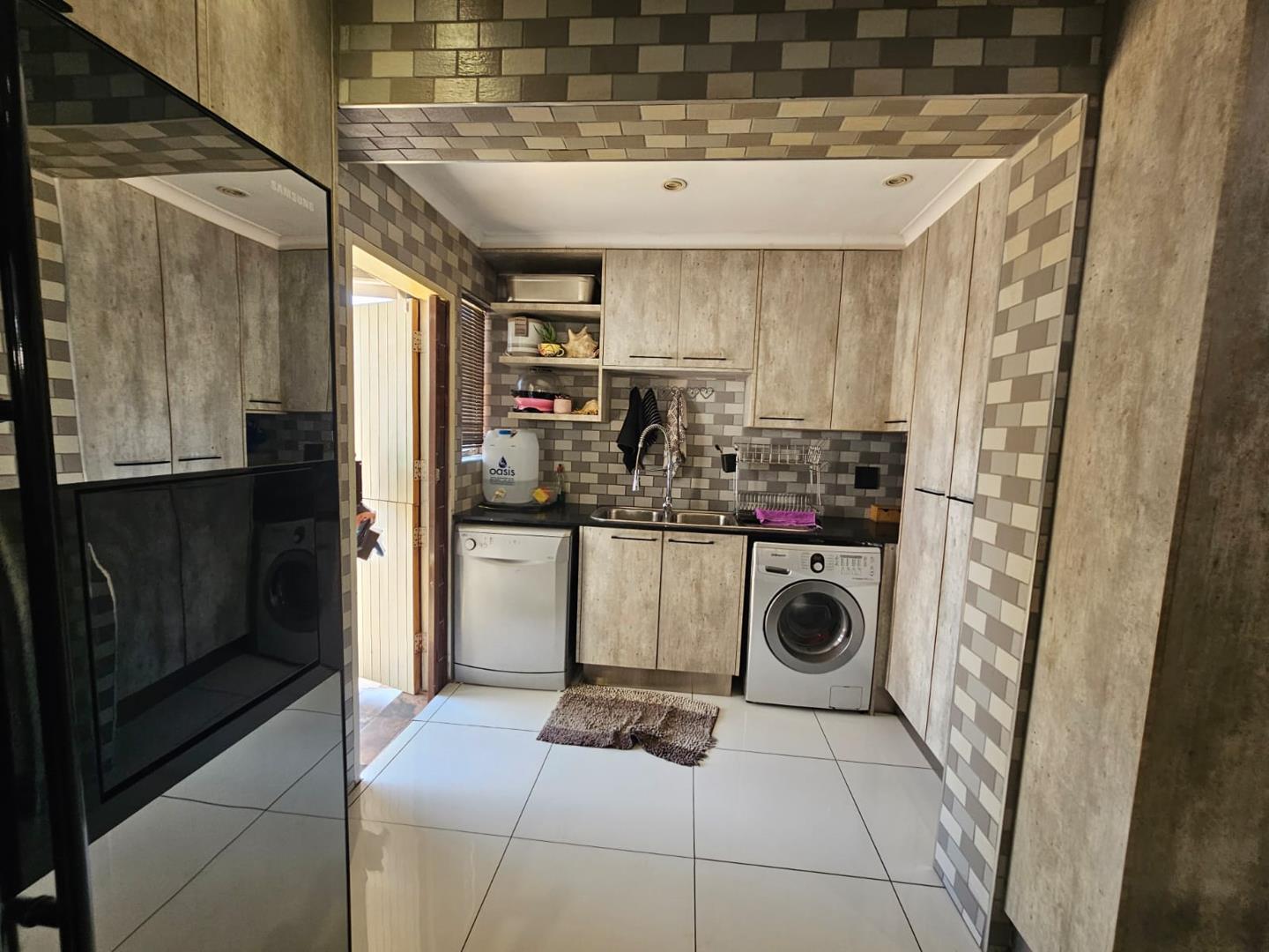 The scullery provides additional space for kitchen tasks. There are three cozy bedrooms and a modern bathroom. Each bedroom includes built-in cupboards (BIC), offering ample storage. The property boasts a large carport with space for six vehicles and two garages for secure parking.