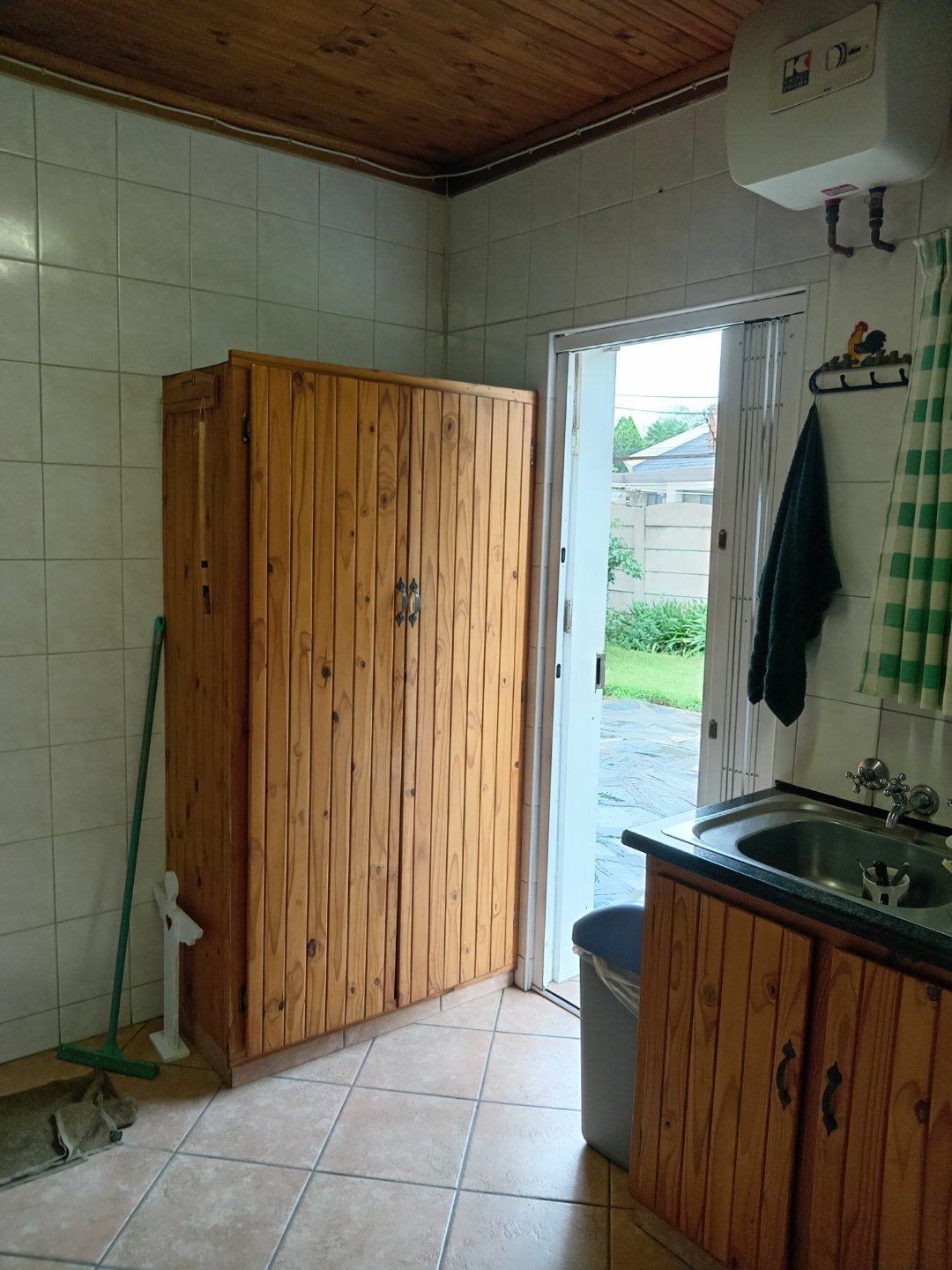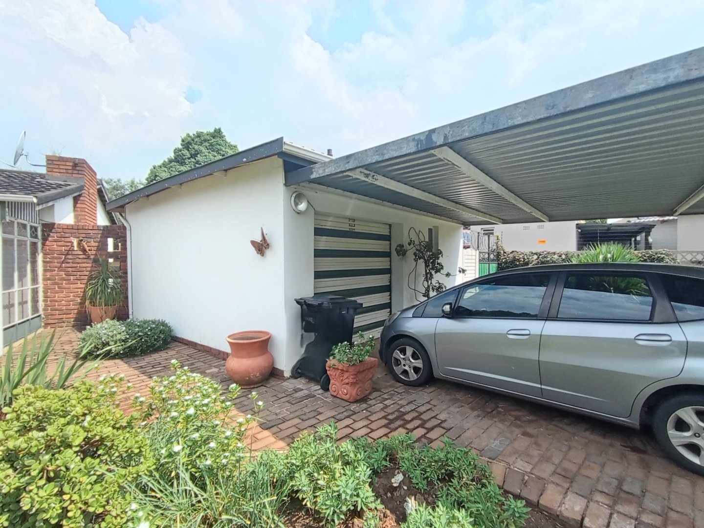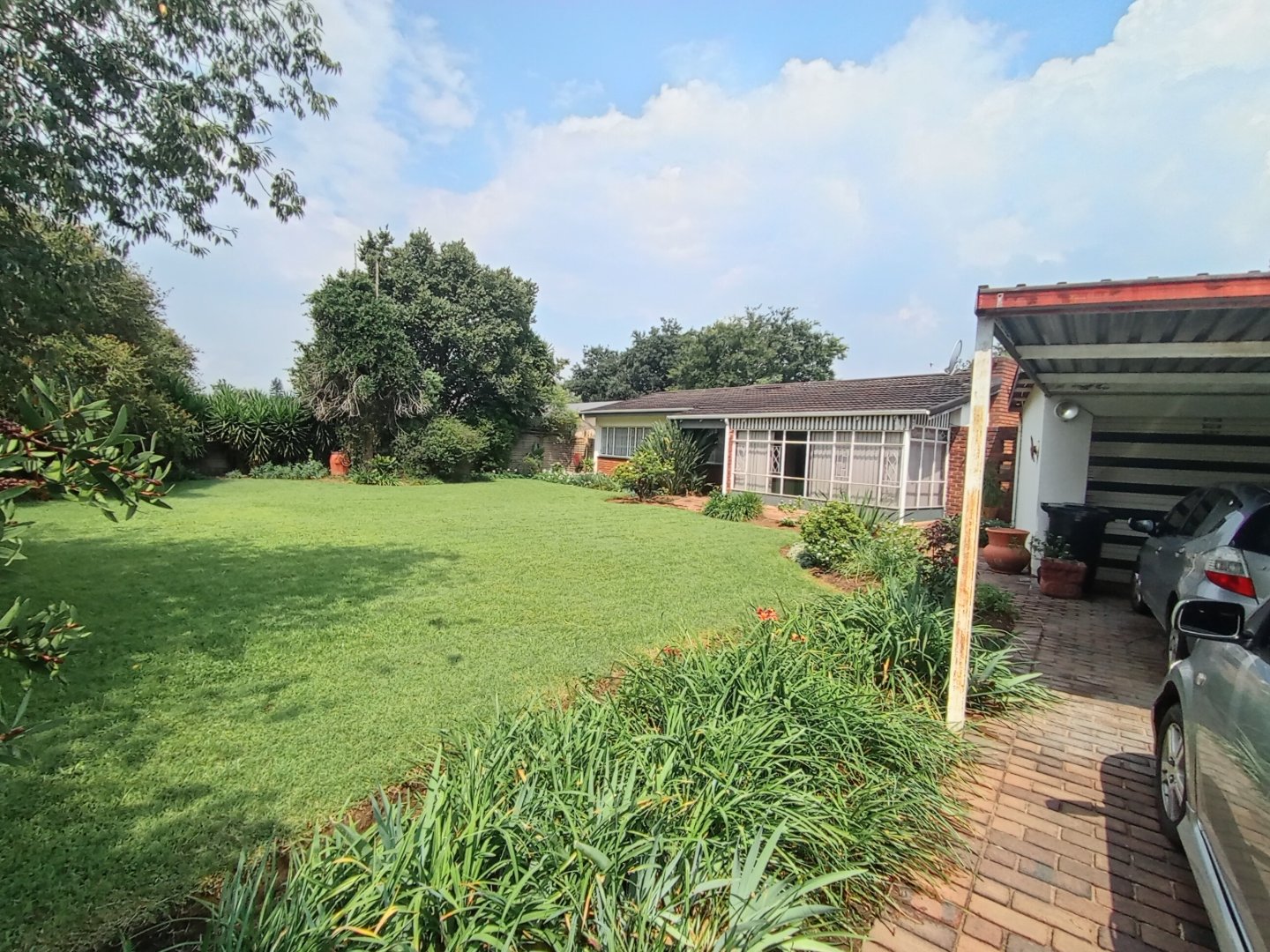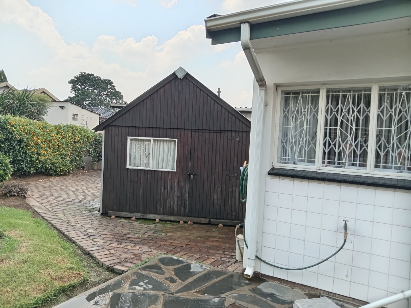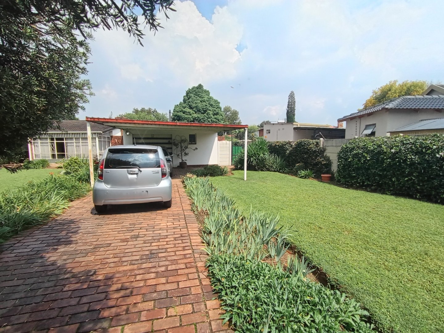 It has a single garage, and double carport. Store room, and a separate wendy house. A garden equipement store and outside toilet. Harvey tile roof.