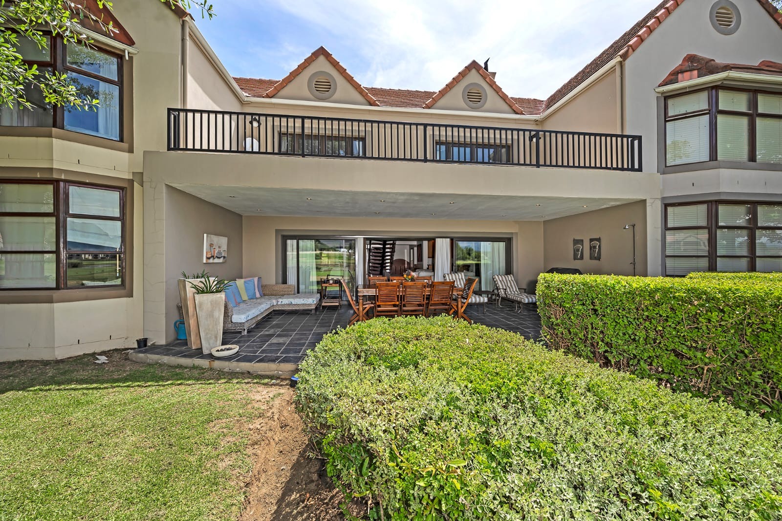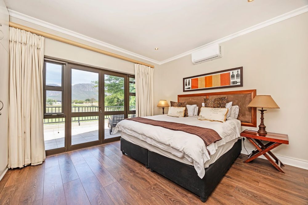 Upstairs, four generously sized bedrooms, all en suite, provide privacy and comfort. Downstairs, the home flows effortlessly through an open-plan kitchen and scullery into the dining area, lounge, and bar, complemented by a guest cloakroom. It’s a layout designed for easy living and effortless entertaining. Add to this uninterrupted views over the 19th fairway with the Drakenstein Mountains as your backdrop—ideal for greeting the day with a sunrise coffee in hand.