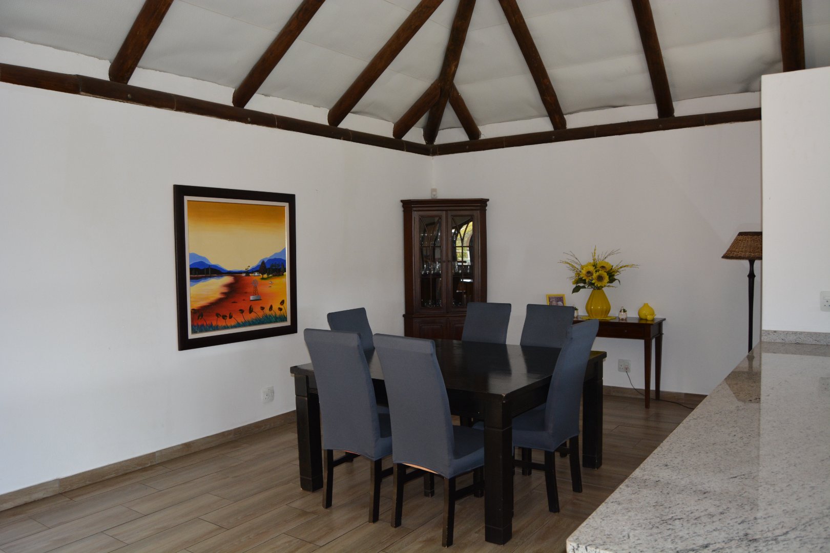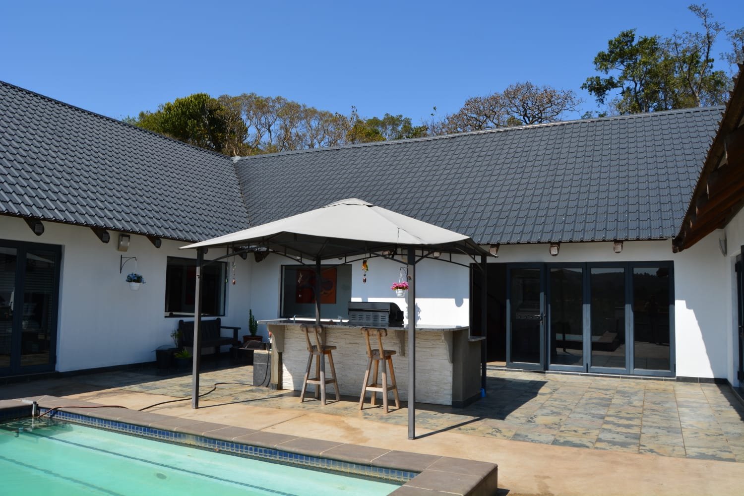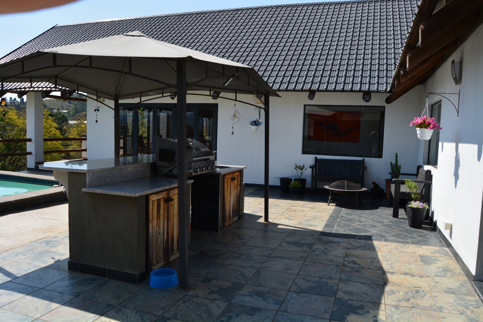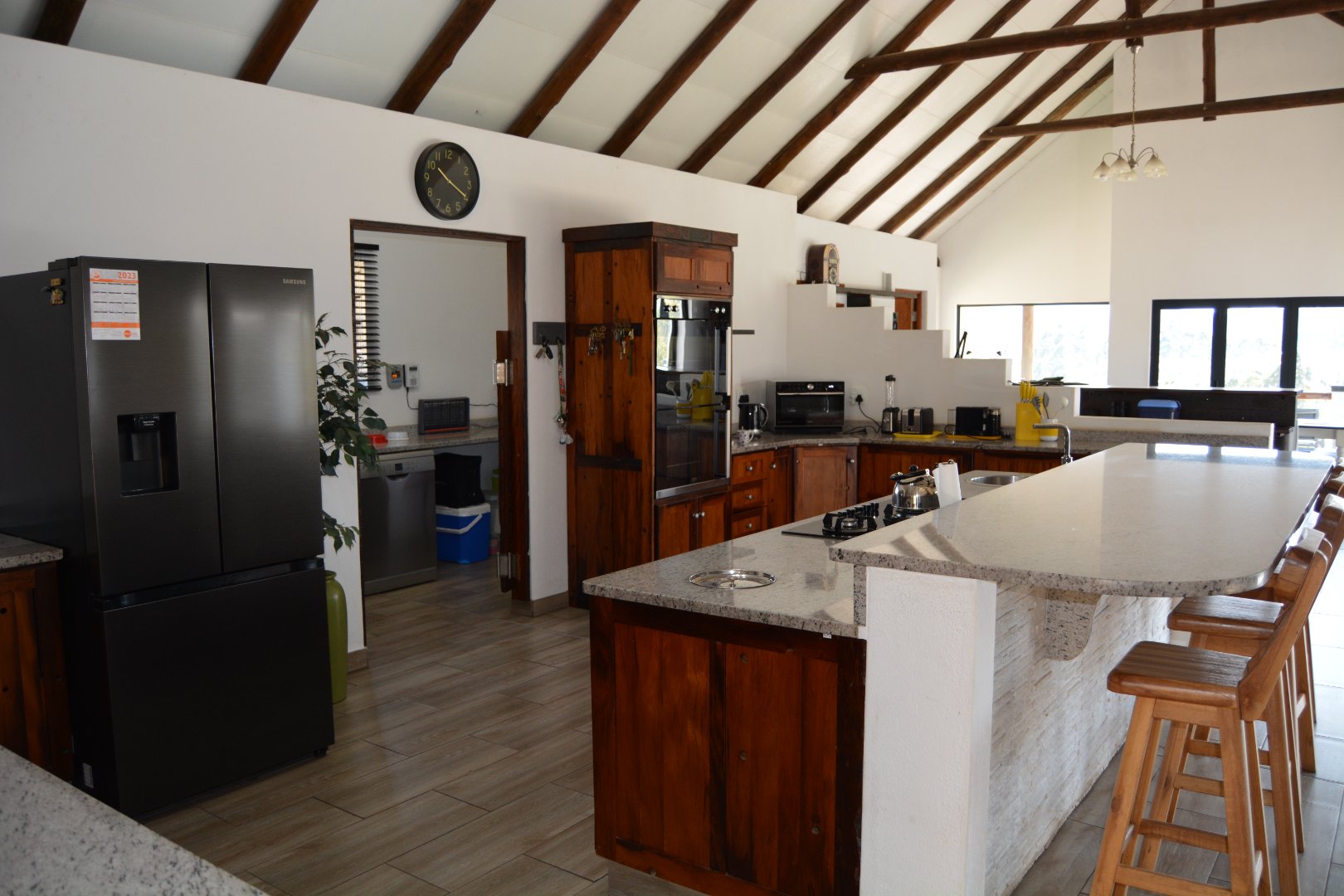 The kitchen is all solid wood with granite tops, a huge scullery. The lounge and Dining room have unlimited views. The pool and deck and braai area are an entertainers dream.