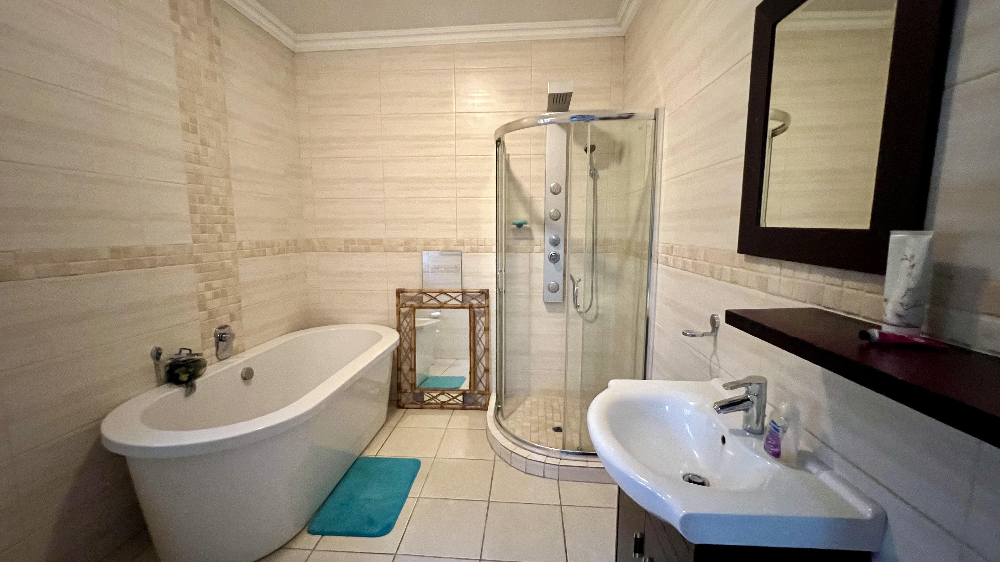 Downstairs Bedroom: A spacious carpeted bedroom downstairs with an en-suite bathroom, featuring both a shower and a bath ensuring privacy and comfort.