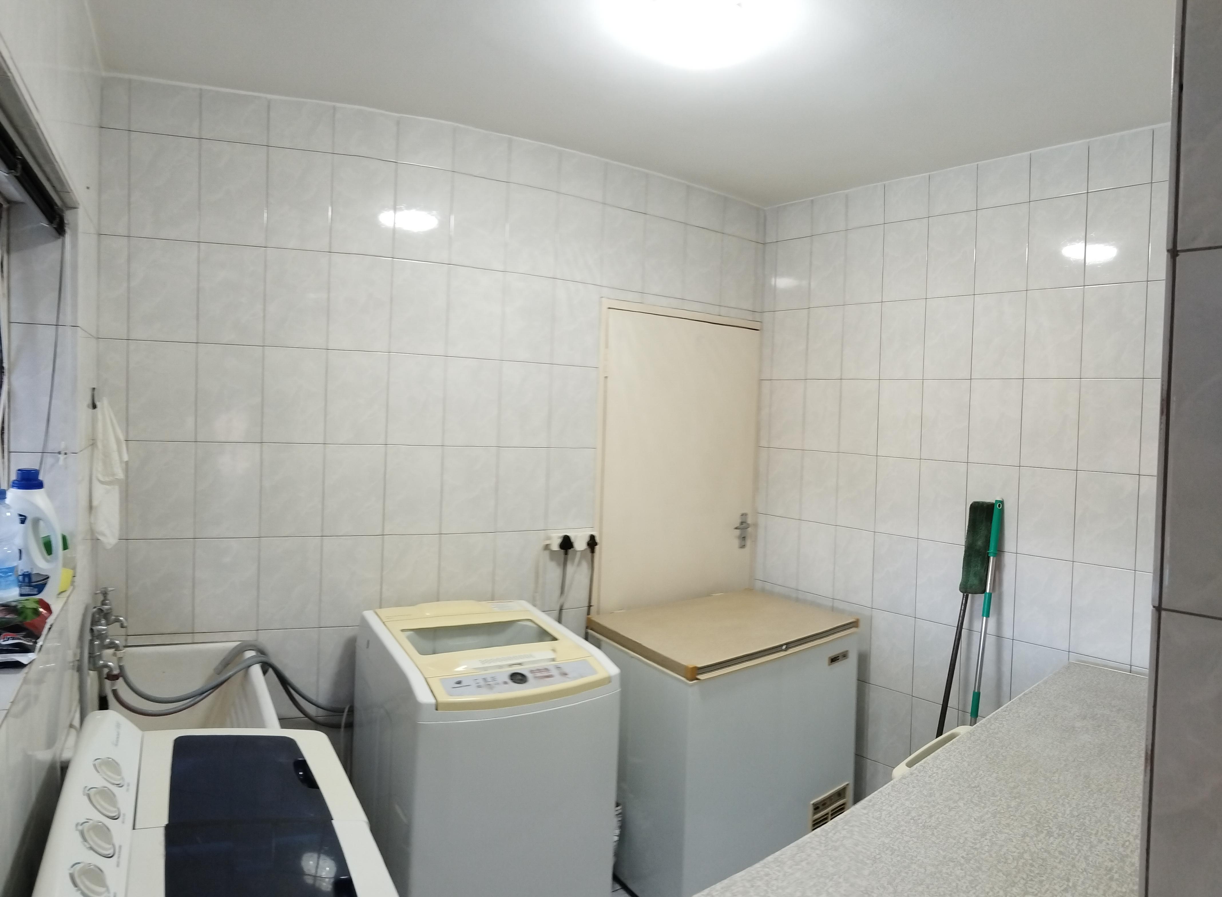 Just beyond the lounge is the well-appointed kitchen, fitted with an eye-level double oven and gas hob—perfect for energy efficiency and convenient cooking. An air conditioner ensures year-round comfort. A separate scullery keeps the main kitchen neat while you cook up a storm, and there is also a dedicated tiled laundry room for added practicality. A conveniently located guest toilet and basin serve this section of the home.