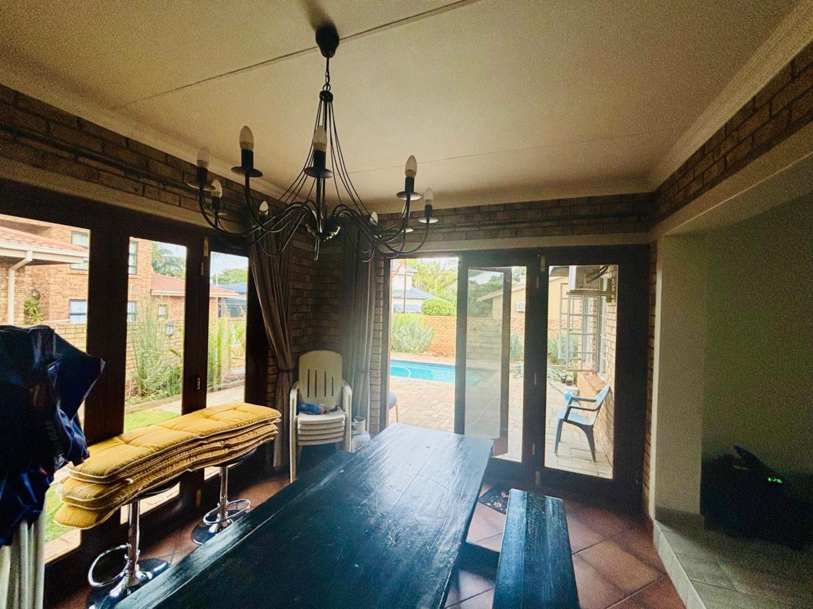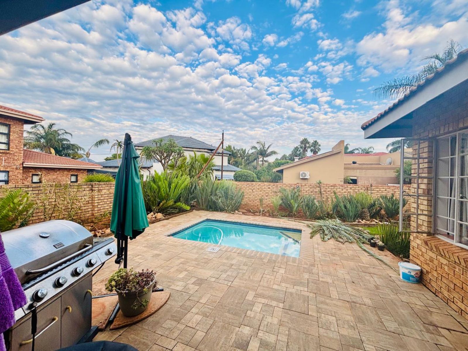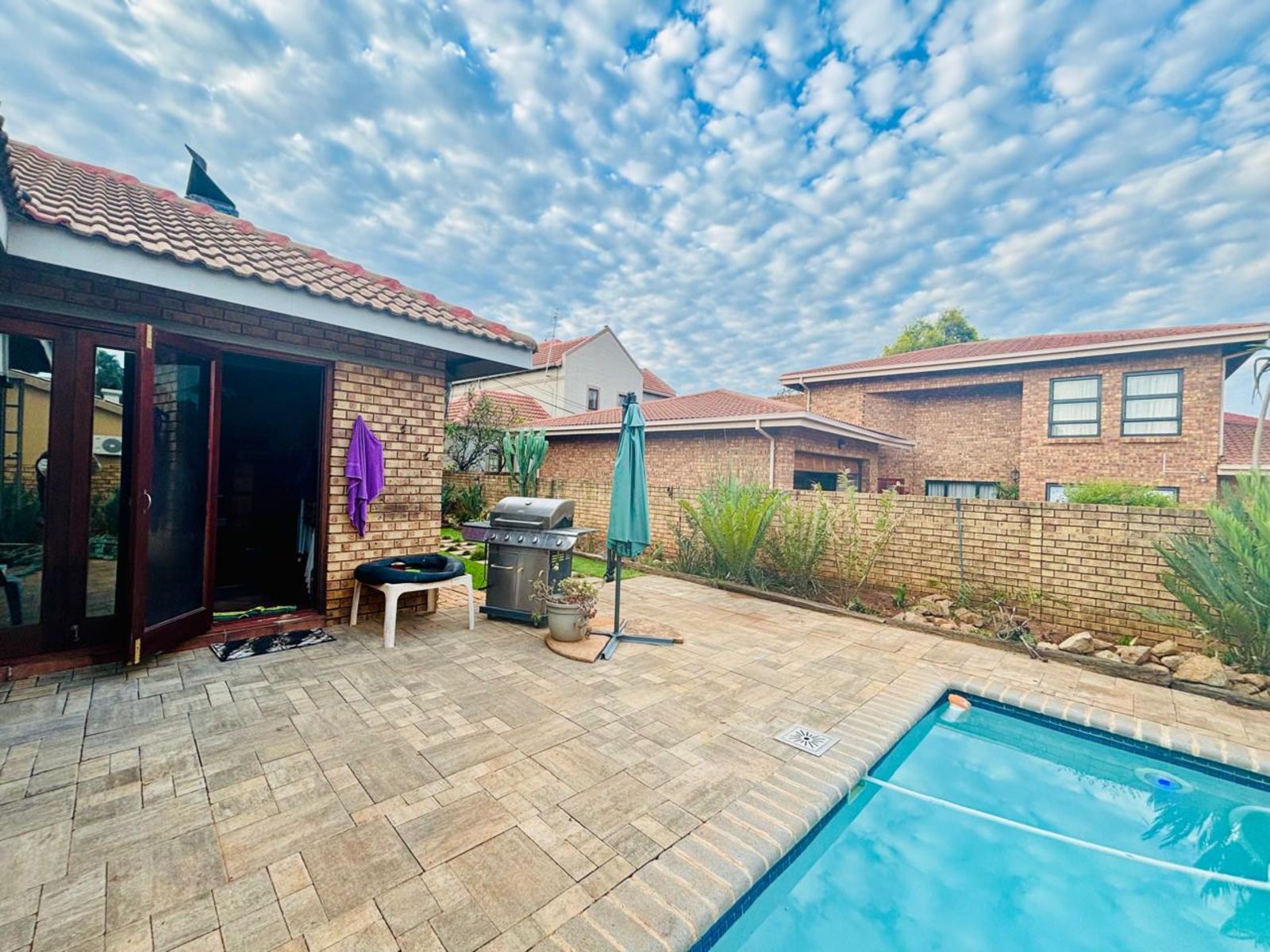 The entertainment-ready braai room opens through stack and fold doors to a lush pavement pool area