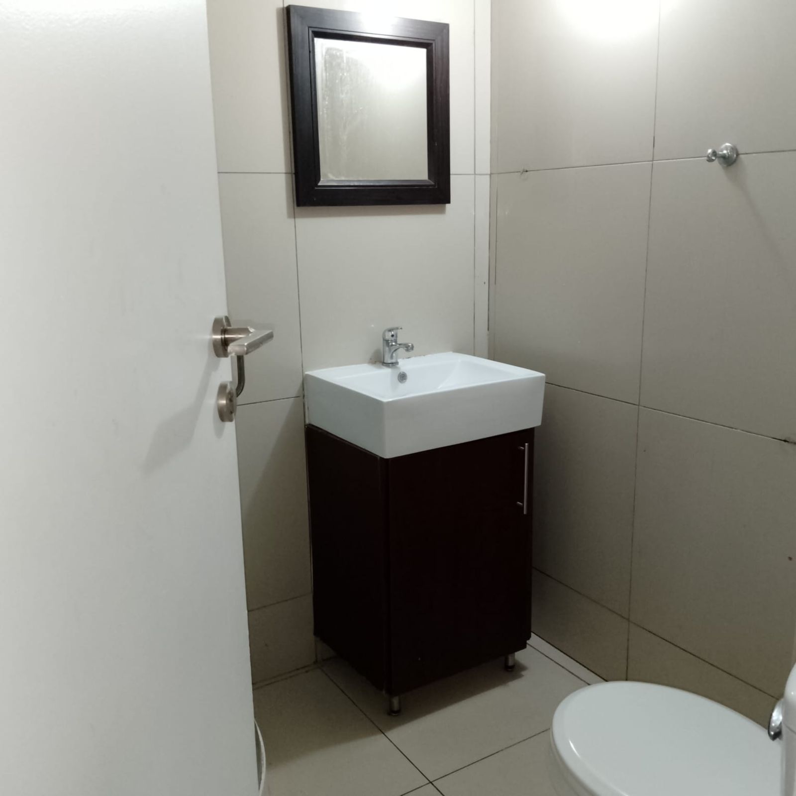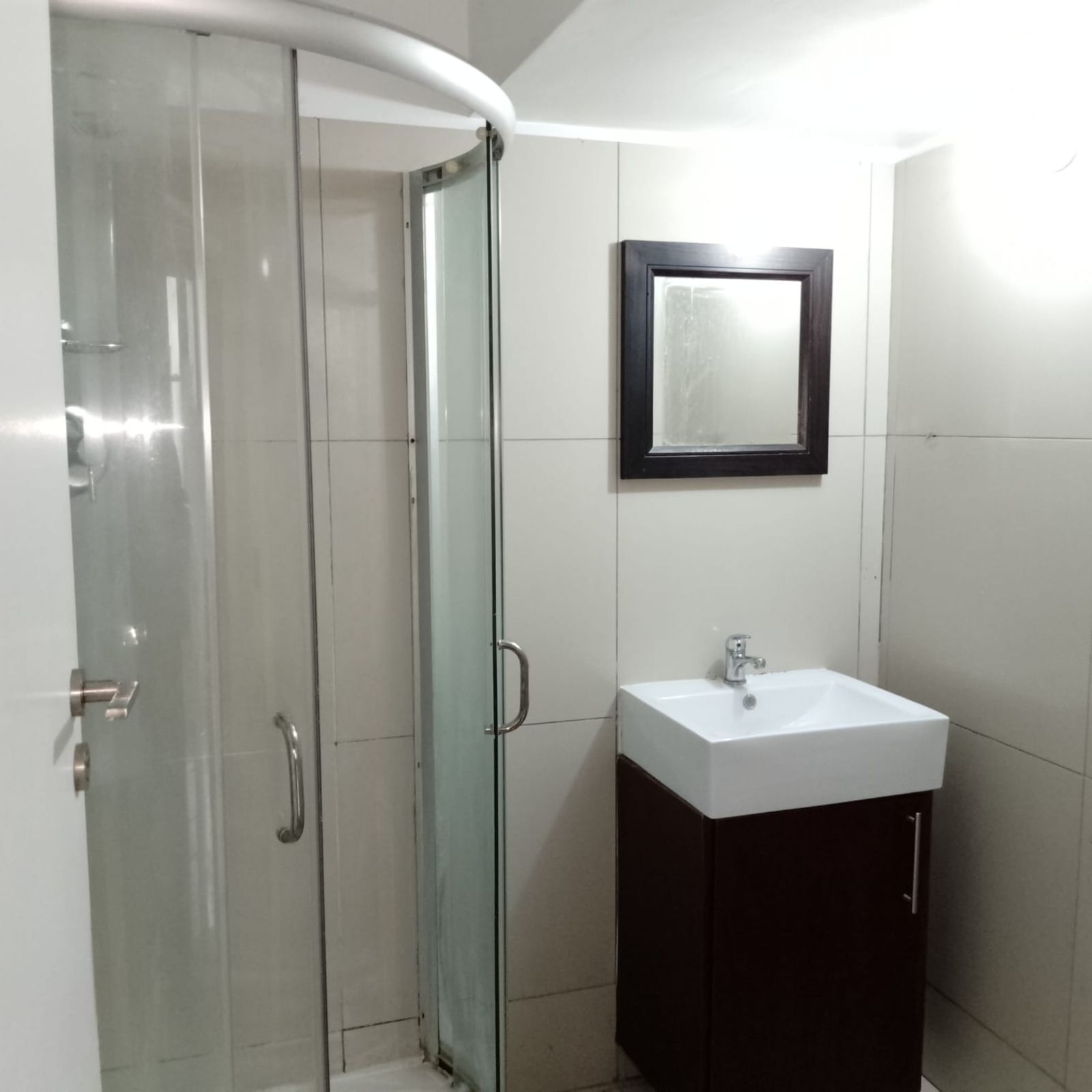 The unit features an open-plan living and sleeping area, a functional kitchen, and a bathroom fitted with a shower and toilet.