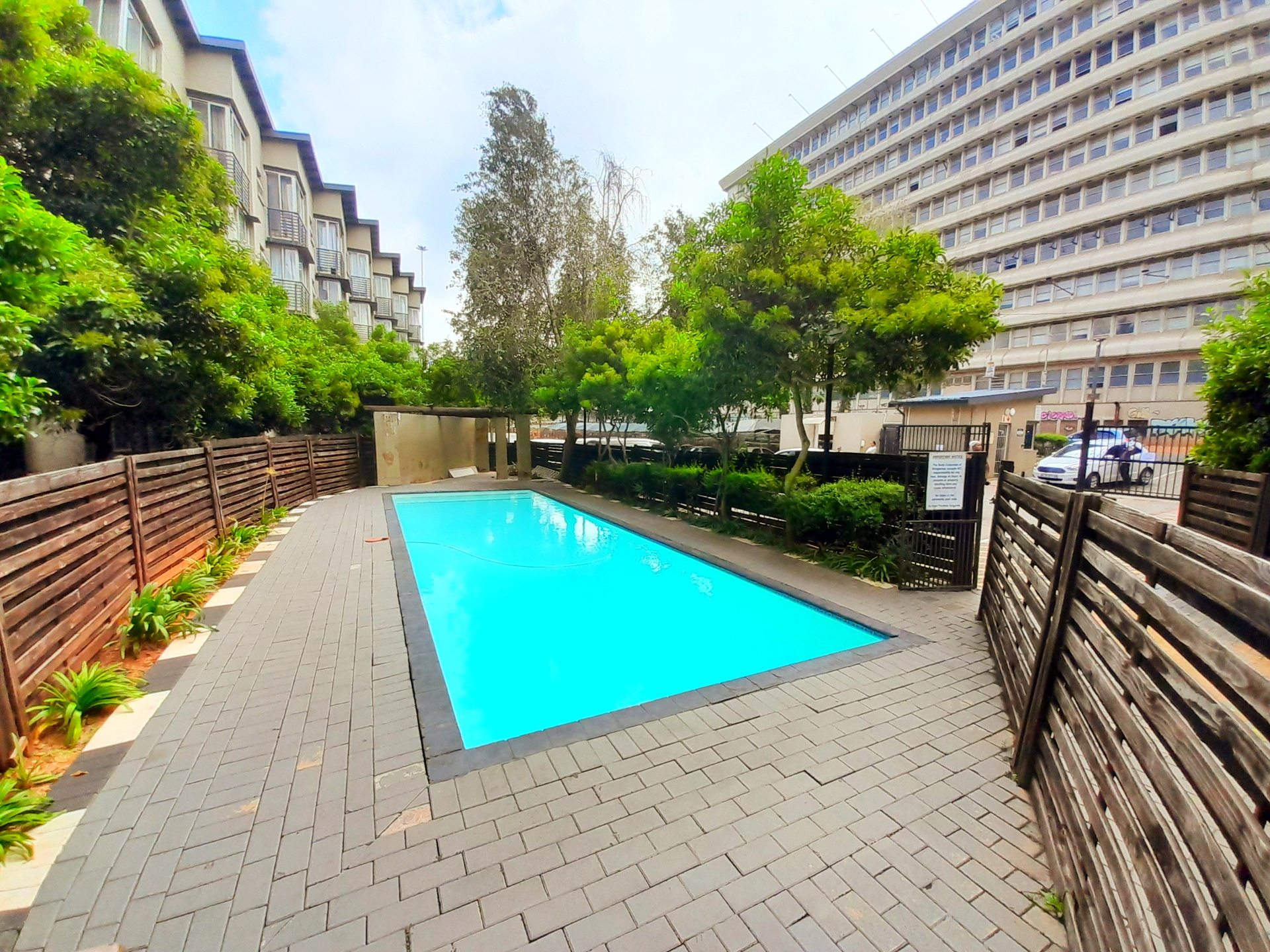 Residents can enjoy access to a large communal swimming pool.