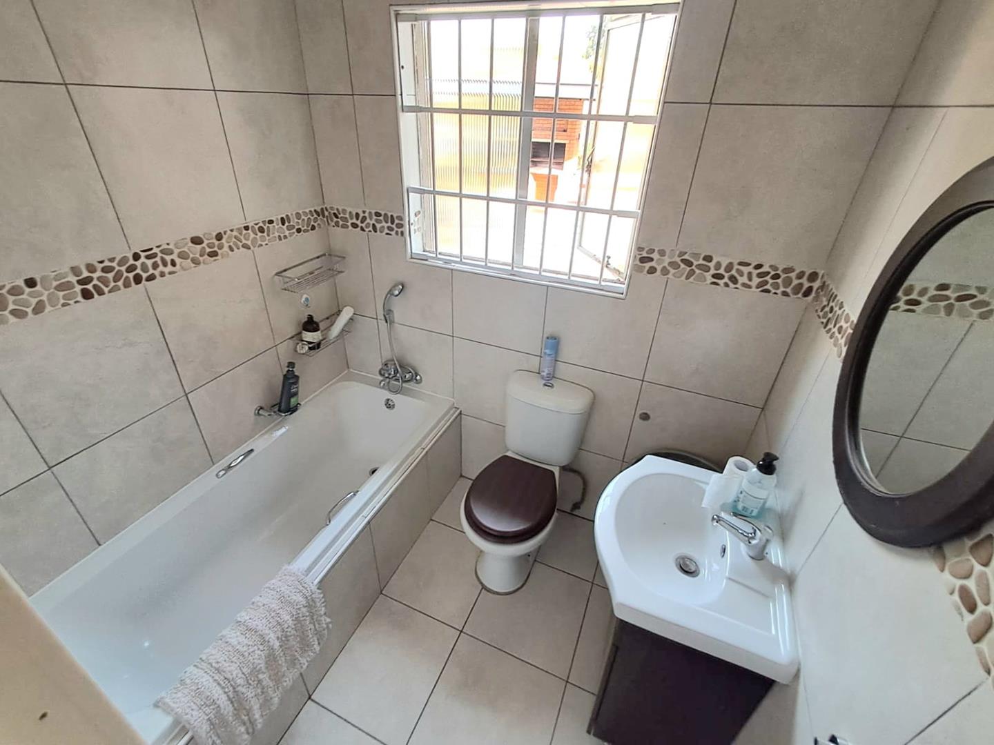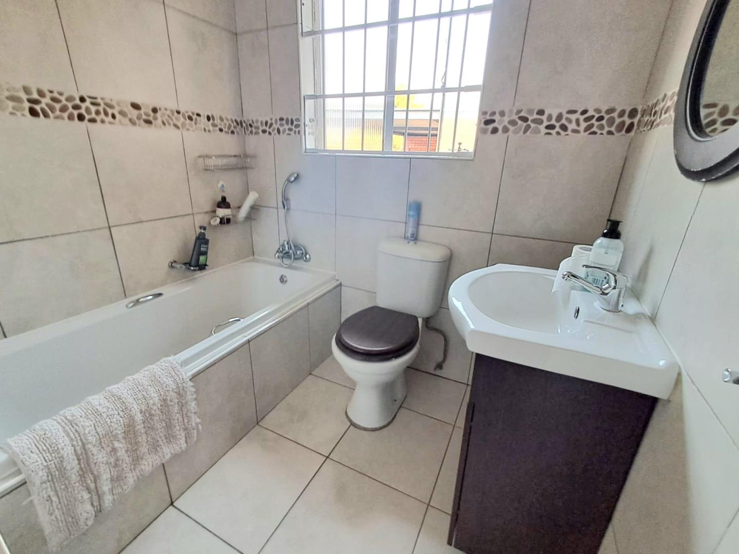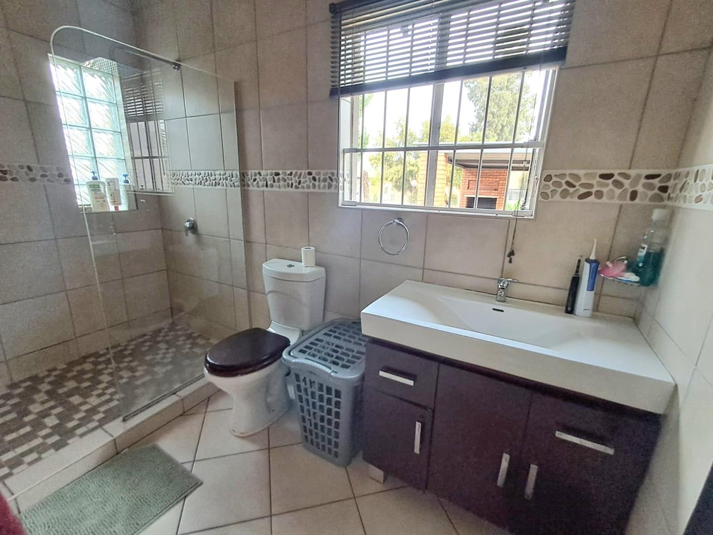 This delightful home boasts three north-facing bedrooms, each equipped with built-in cupboards and chic laminate flooring. The master bedroom includes an en-suite bathroom fitted with a shower, basin, and toilet. The second bathroom, equally stylish, is equipped with a bath, basin, and toilet.