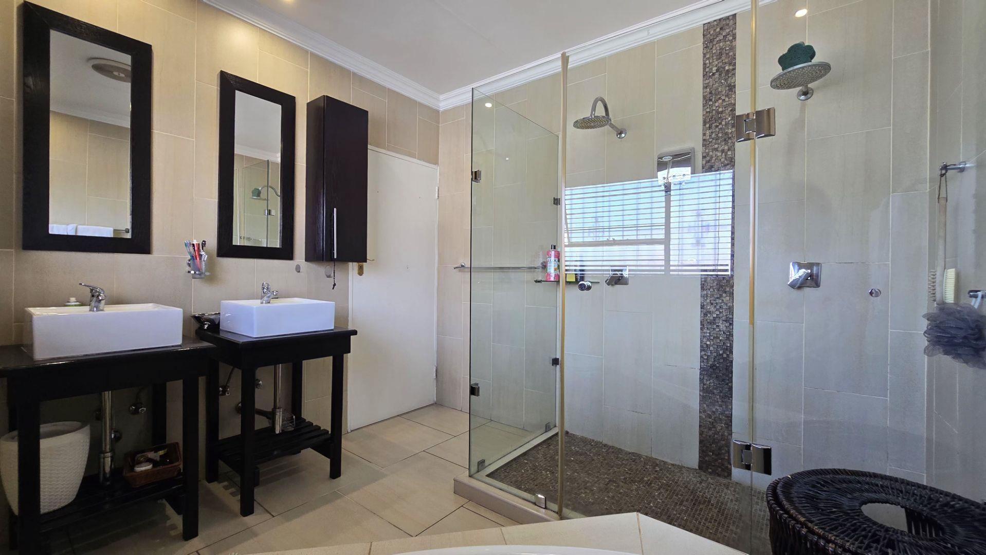 The property is equipped with modern conveniences including 2 x gas geyser and two water tanks that collect rainwater for efficient garden irrigation. Parking is plentiful with a double automated garage, a double shaded carport, and additional open parking for up to five vehicles. A separate servant's quarter with its own bathroom provides added flexibility.