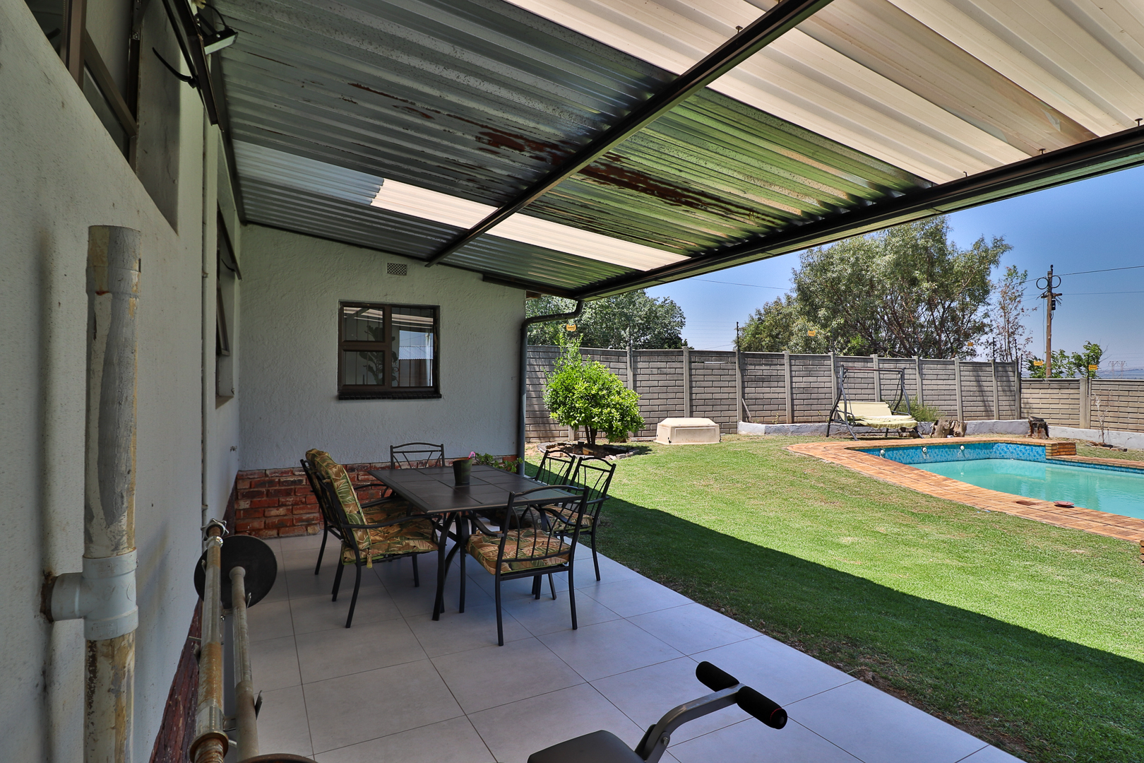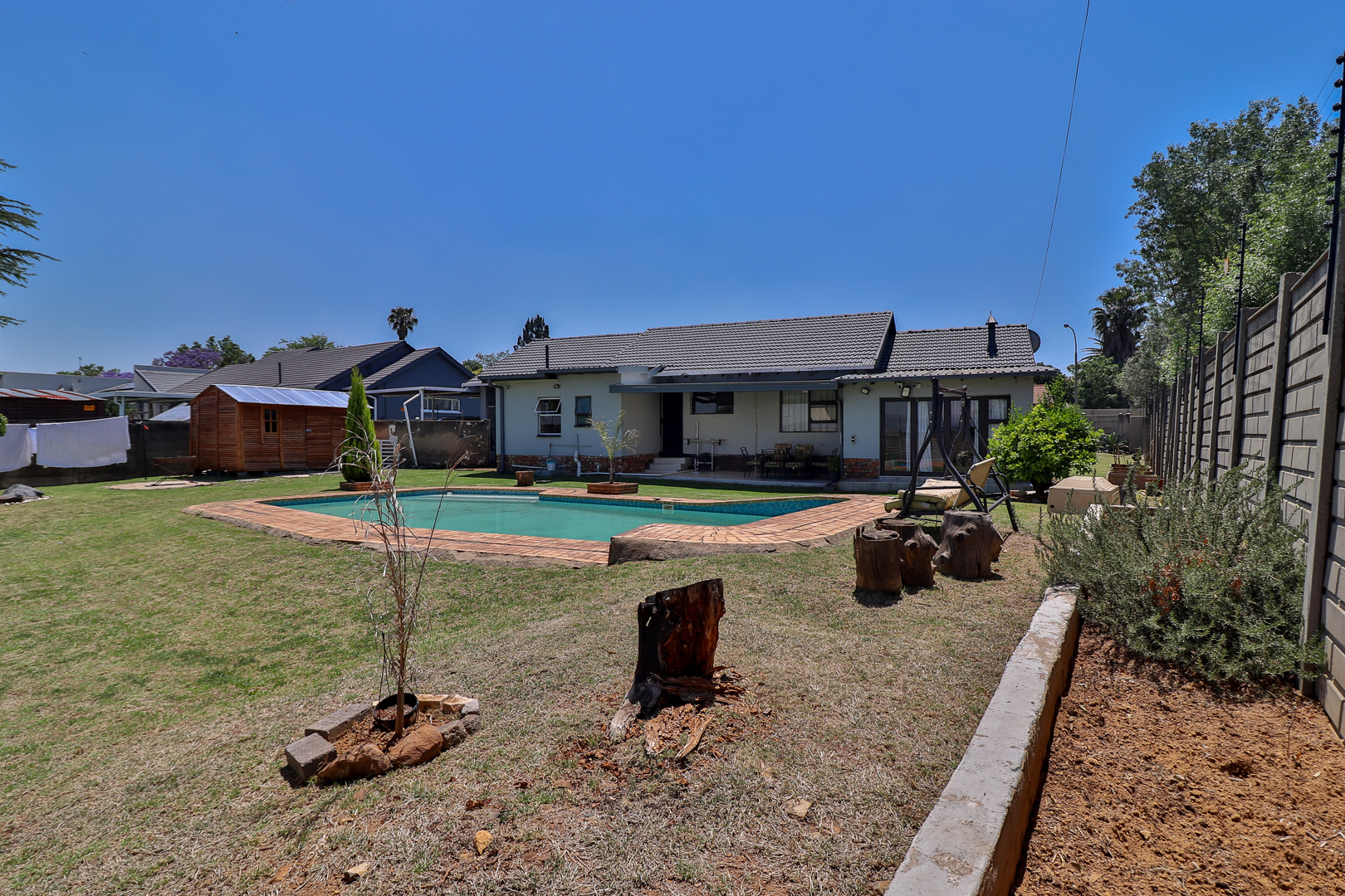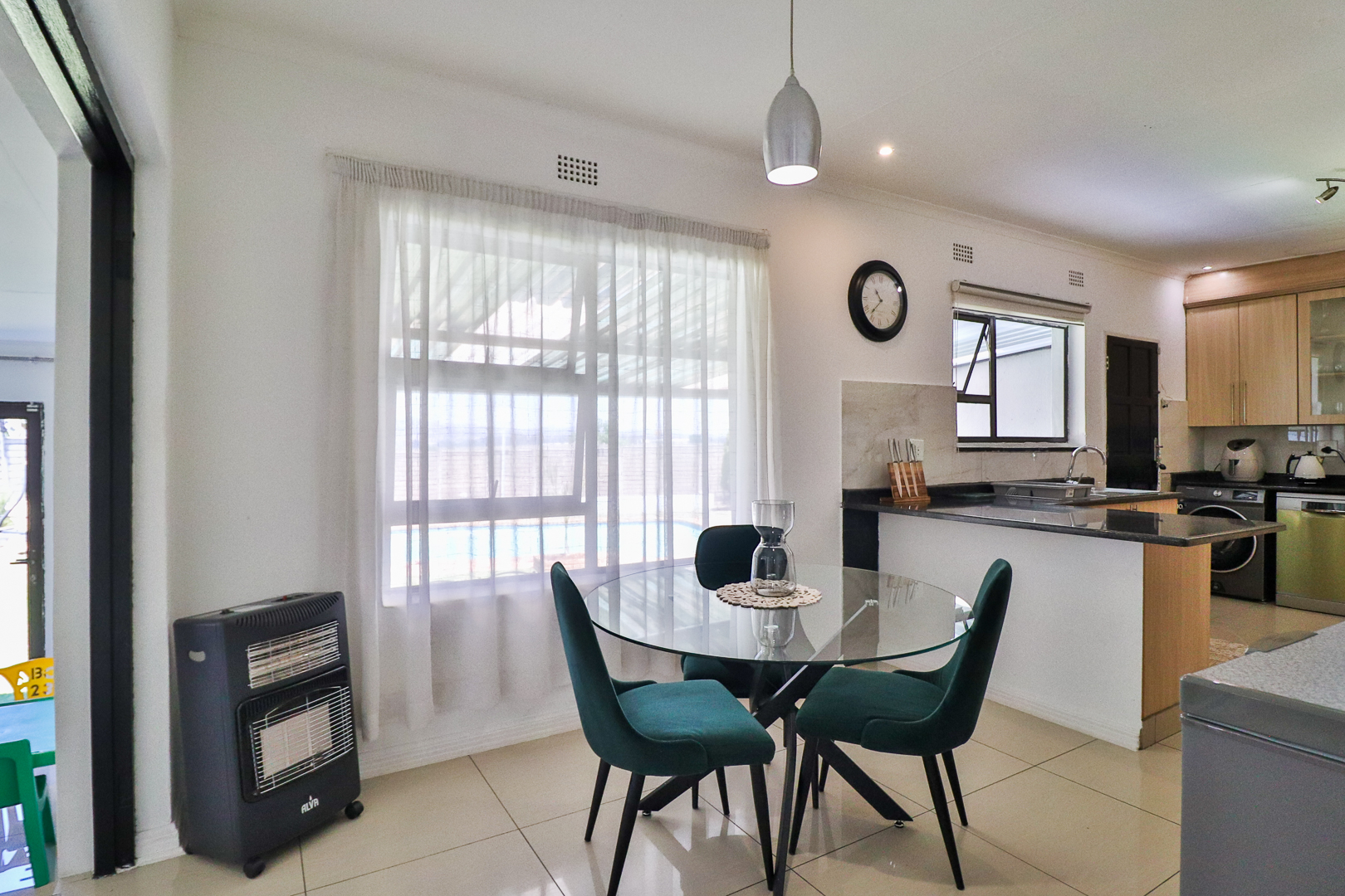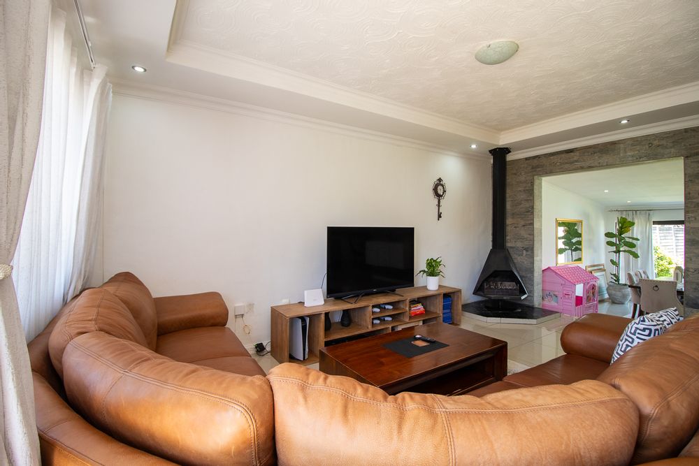From the dining area, sliding doors open onto a covered patio overlooking the sparkling pool, offering the ultimate space for weekend braais, family gatherings, or simply relaxing while enjoying the exceptionally large garden that extends both front and back — complete with lovely views and loads of space for kids and pets to play.