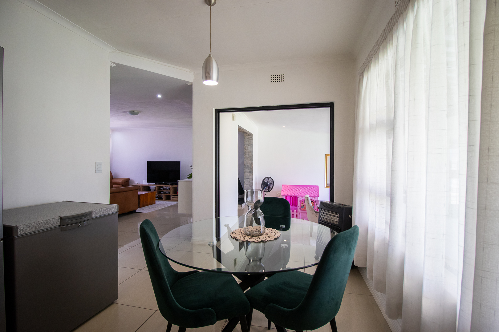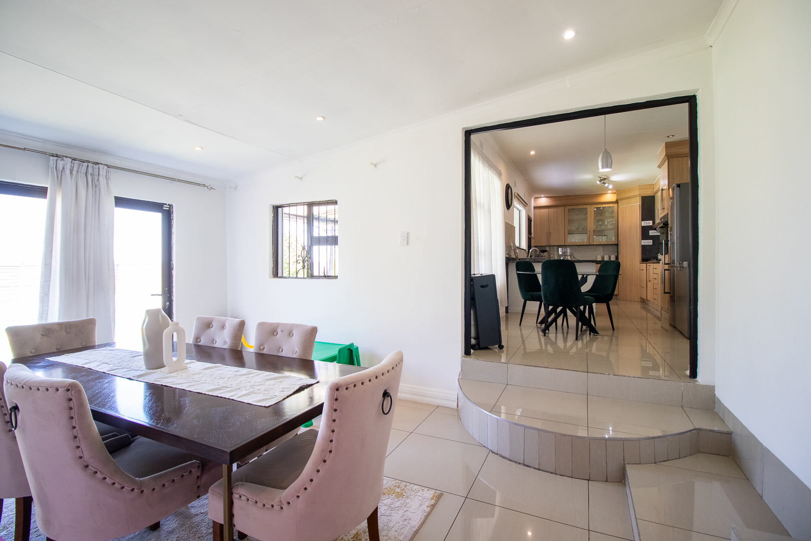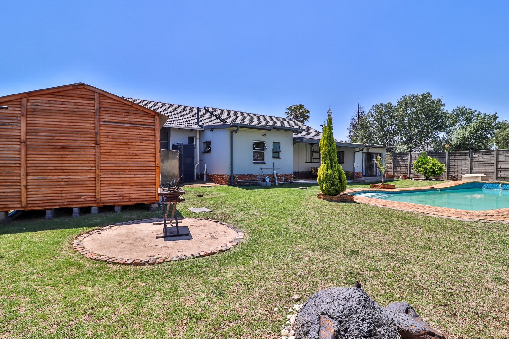 From the dining area, sliding doors open onto a covered patio overlooking the sparkling pool, offering the ultimate space for weekend braais, family gatherings, or simply relaxing while enjoying the exceptionally large garden that extends both front and back — complete with lovely views and loads of space for kids and pets to play.