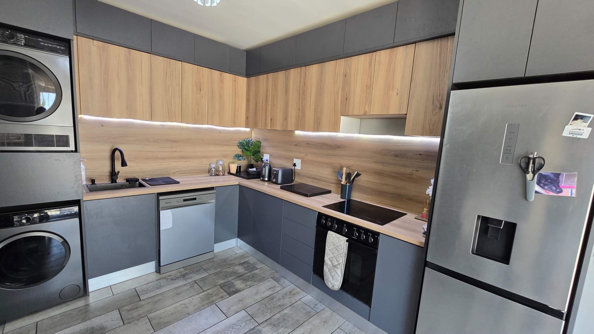 The home features three well-sized bedrooms, ideal for families or professionals looking to settle in a prime area. The modern kitchen is both stylish and functional, offering ample cupboard space and a clean, contemporary finish.