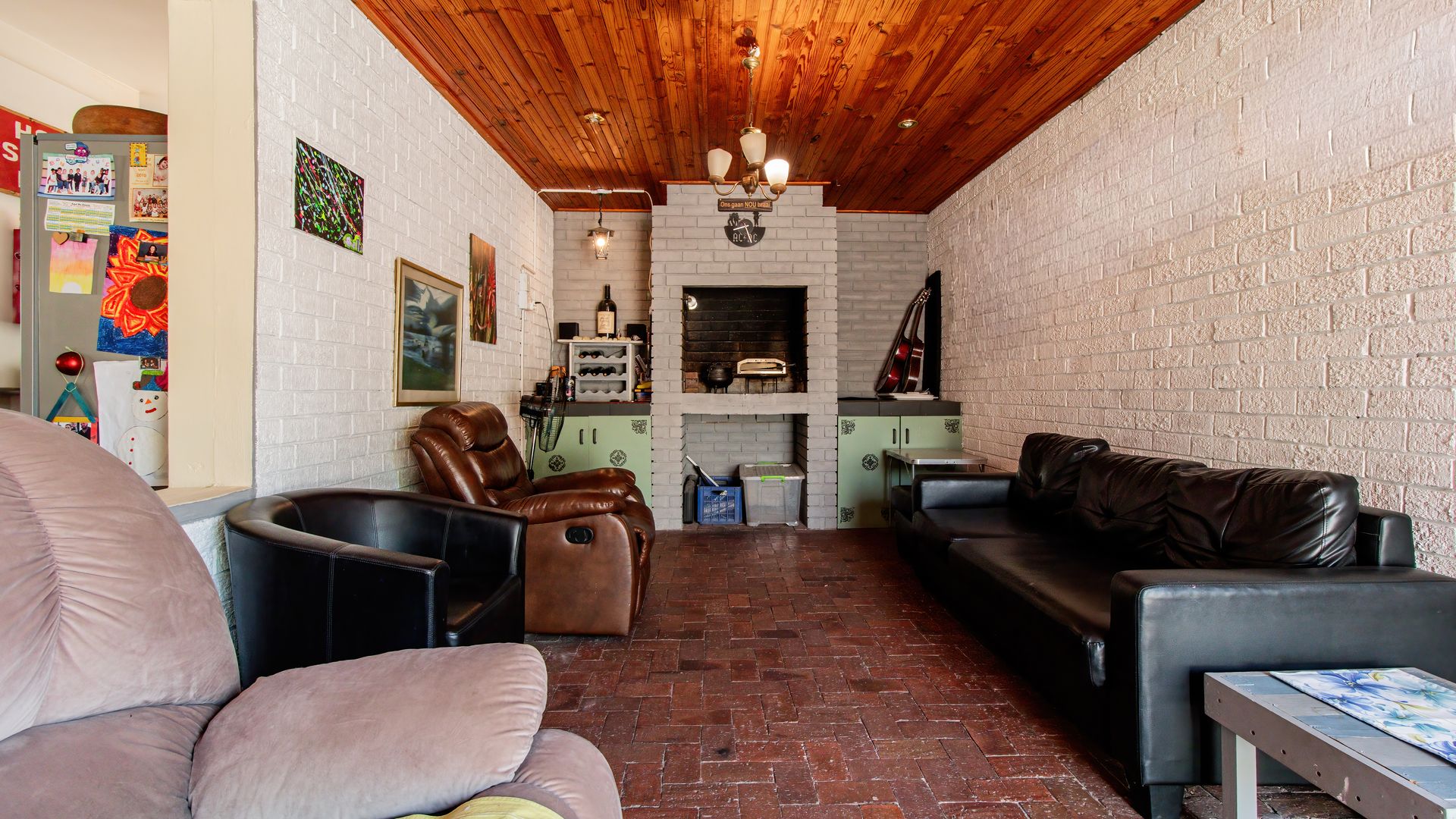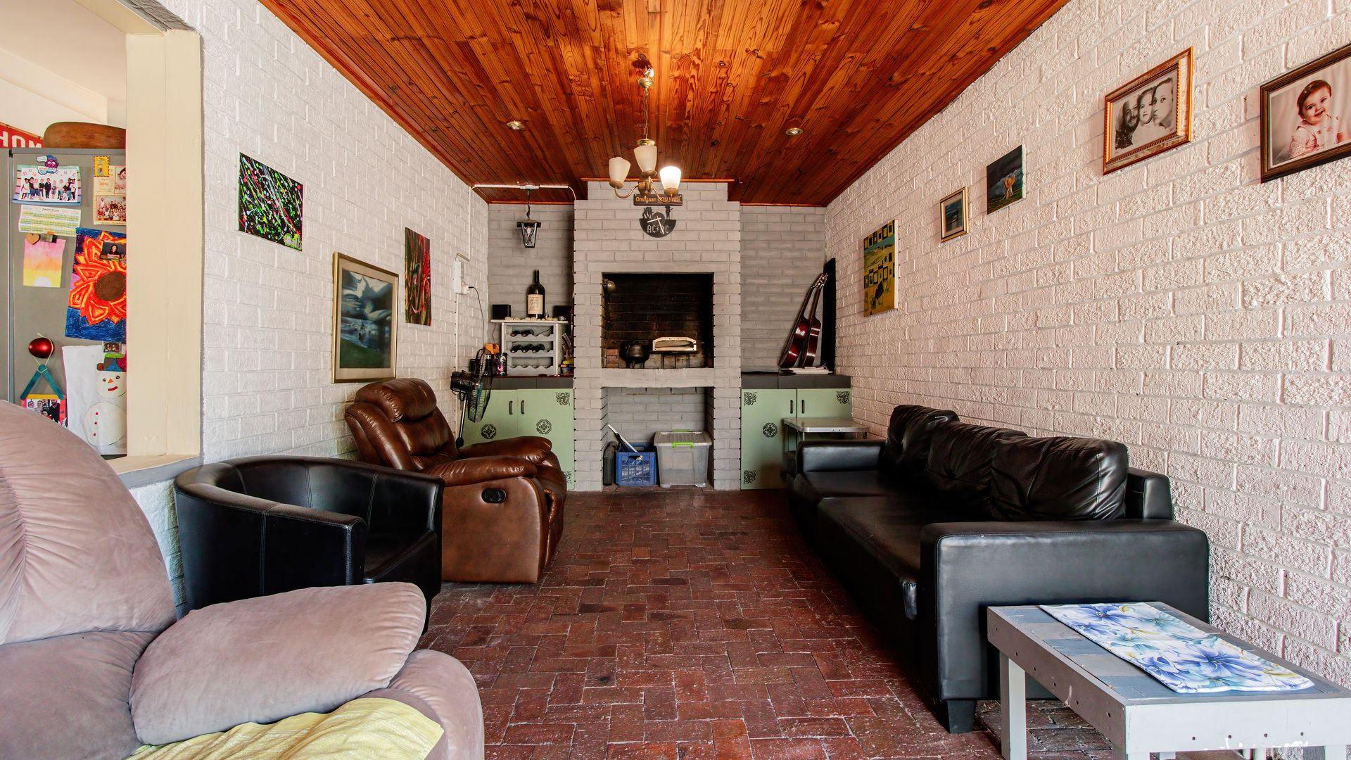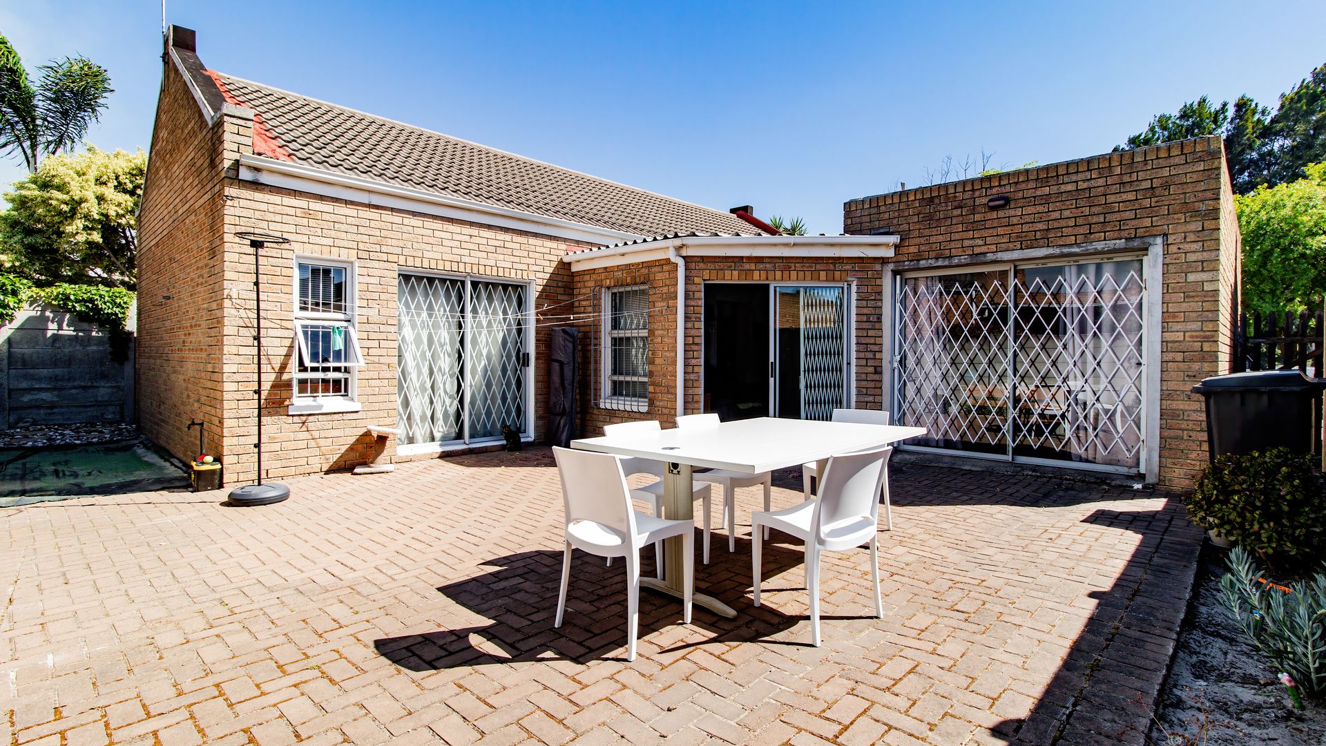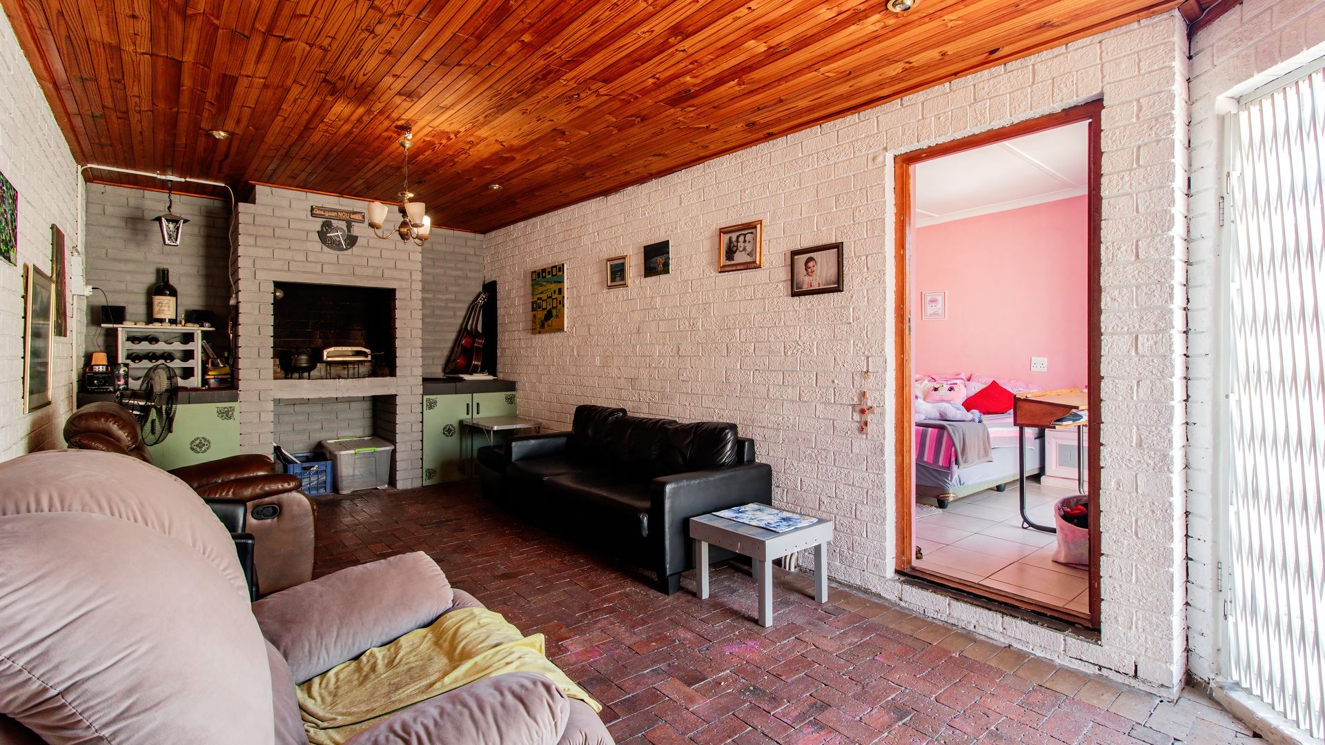 - Enclosed braai patio with sliding doors opening onto a paved backyard.
