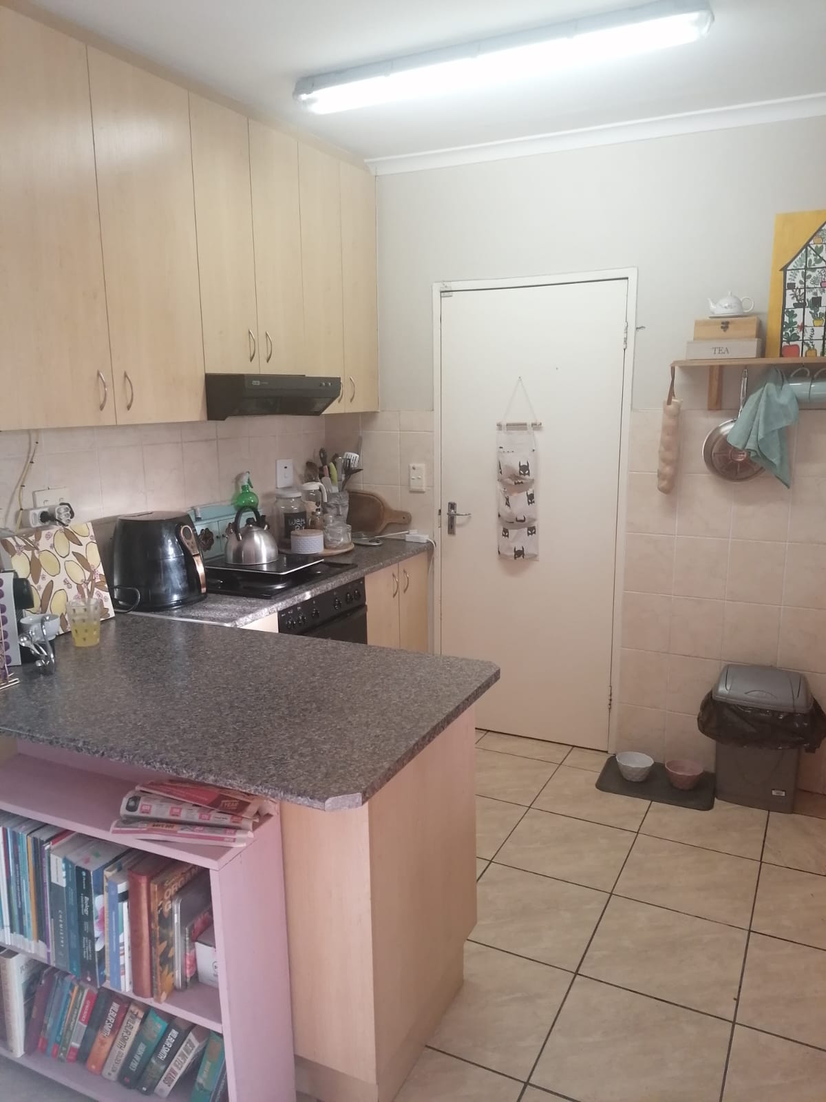 - Open plan kitchen area with tiled flooring, stove, extractor fan and a breakfast nook in kitchen