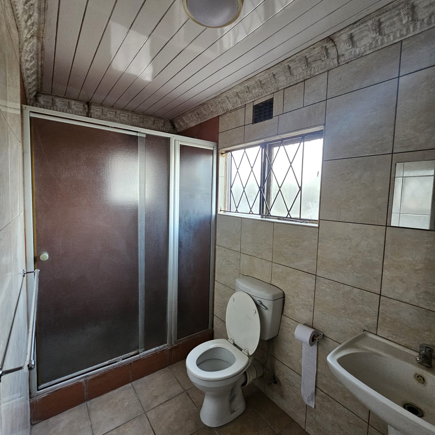 The bathroom is fully tiled and includes a shower and toilet, providing all essential amenities in a clean, modern space.