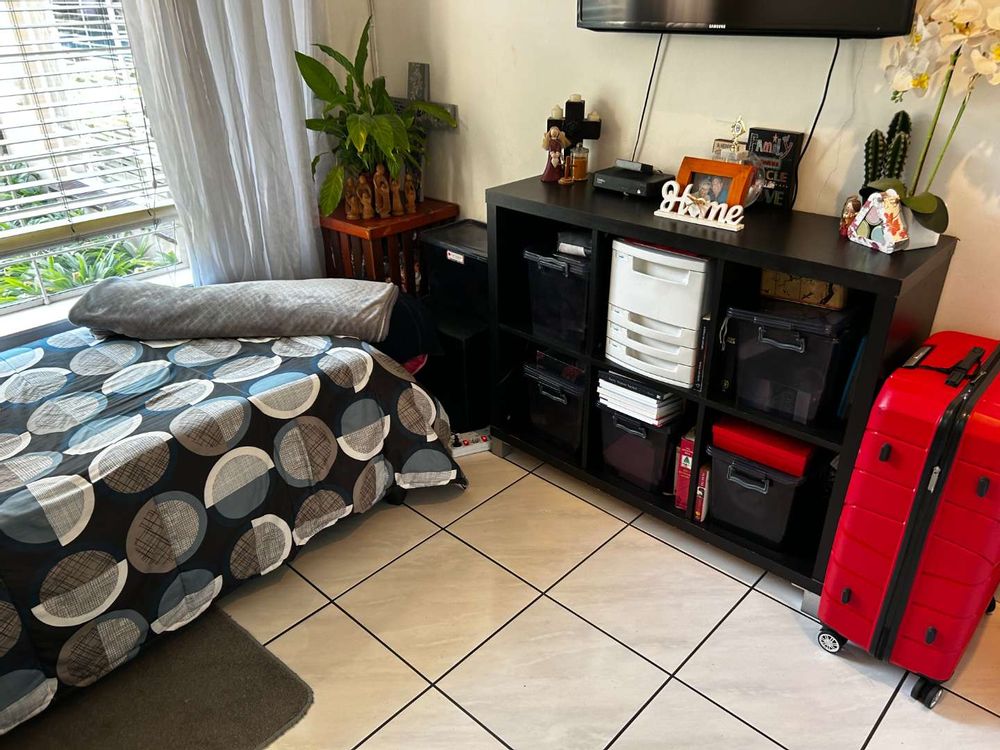 Upstairs, you'll find two oversized bedrooms with built-in cupboards and a well-appointed bathroom featuring a bath, toilet, and basin. The flat enjoys its own entrance with an automated gate and includes a carport for one vehicle.