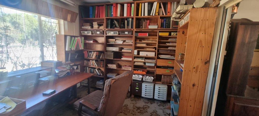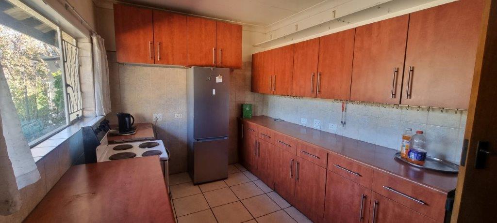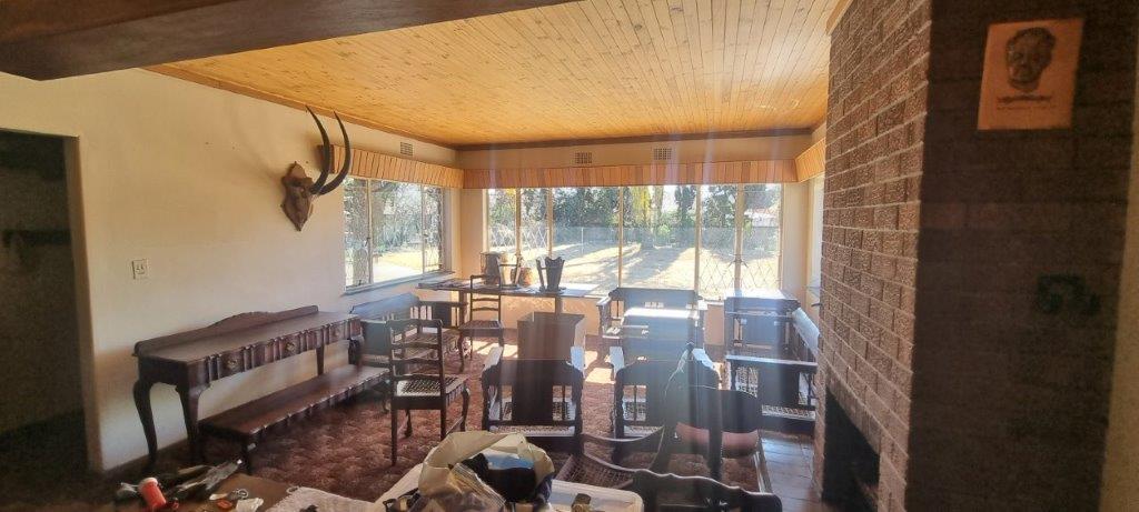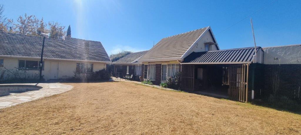 The main house offers a lounge, a study, and a big wooden kitchen. 4 bedrooms and 2 bathrooms. On the side of the house behind the double garages and carports, you'll find additional flats and staff quarters. 3-phase electricity, and prepaid as well. The pool has been empty for ages!! Come and see the endless possibilities it offers
