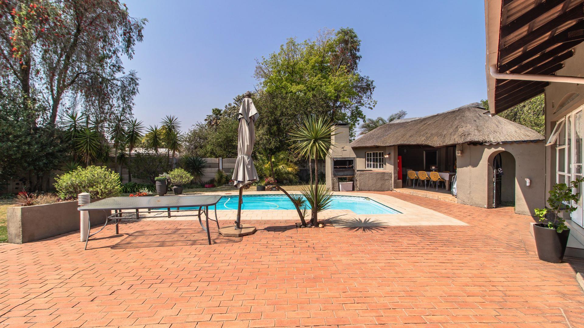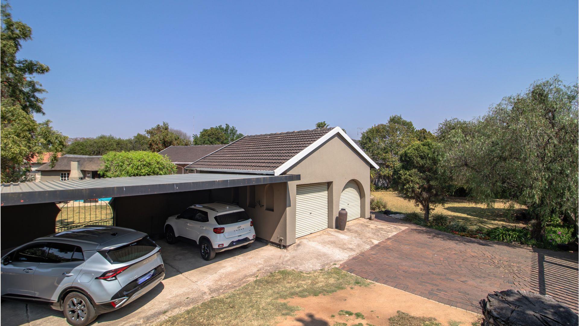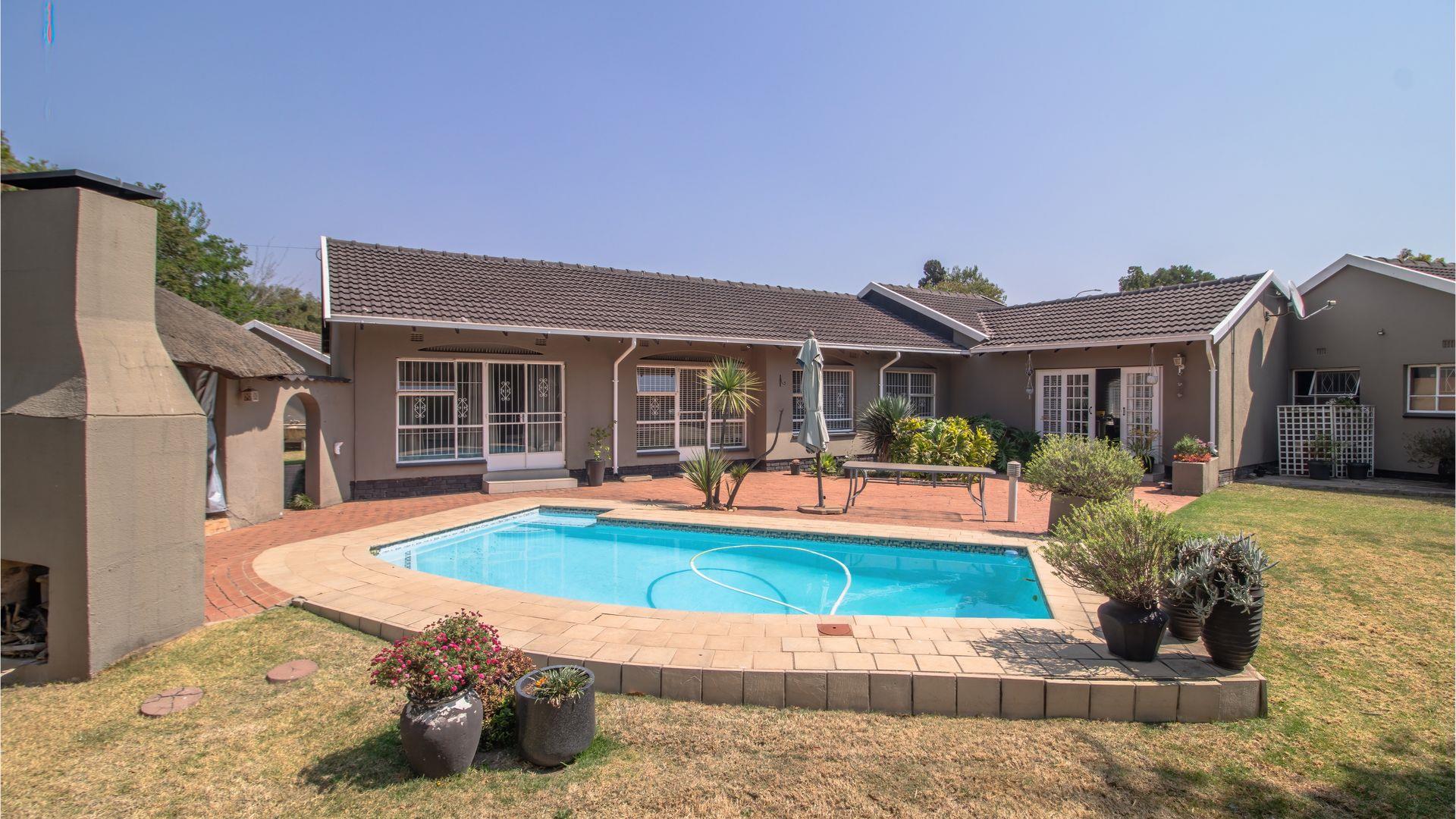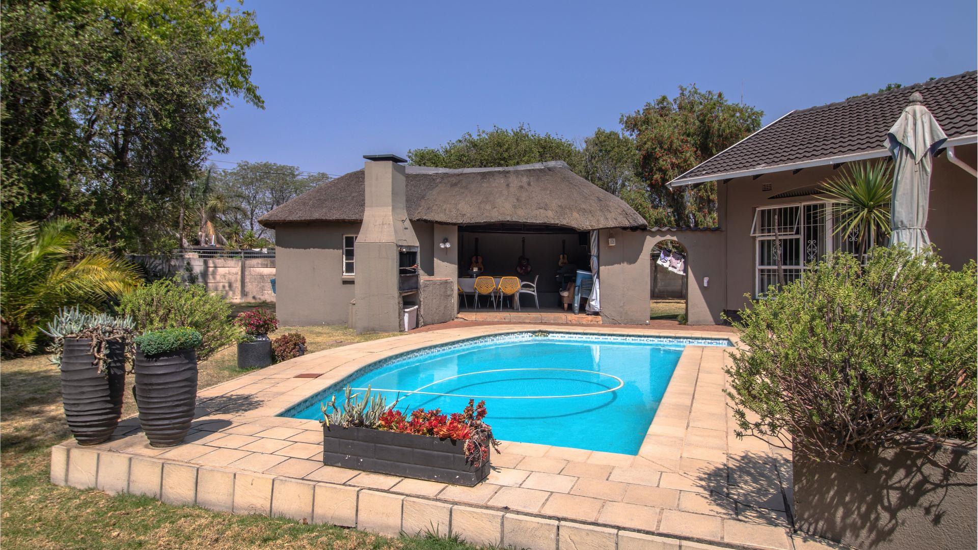 Step outside to explore the beautifully landscaped garden, an ideal setting for family gatherings and outdoor fun. The sparkling pool and thatched area with a built-in braai promise endless enjoyment during warm summer days. Completing this exceptional offering is a double garage and covered parking for at least three vehicles, ensuring ample space for all your transportation needs.